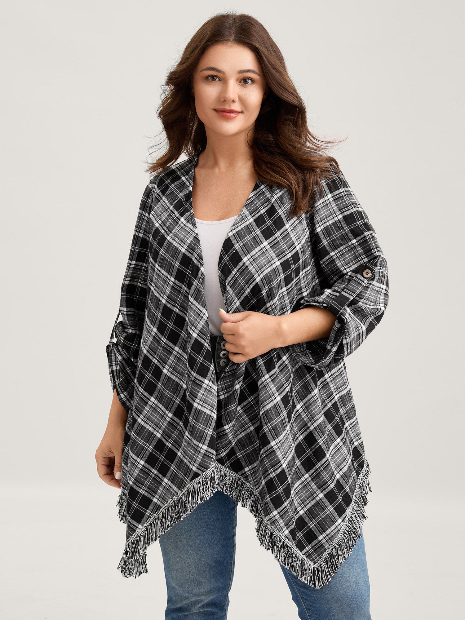 Plaid Print Open-Front Tassels Jacket