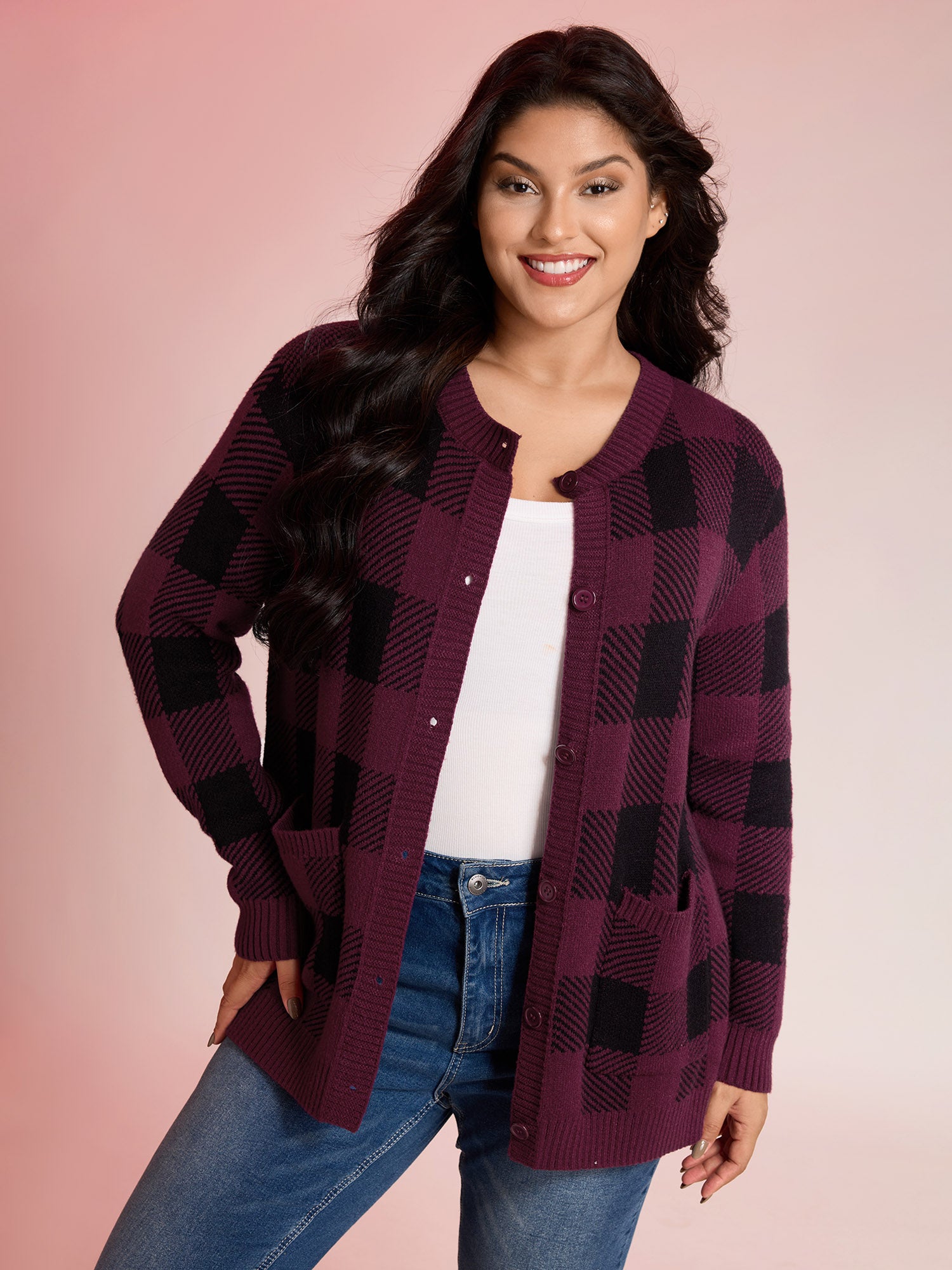 Checkered Jacquard Buttons Pockets Knit Cardigan