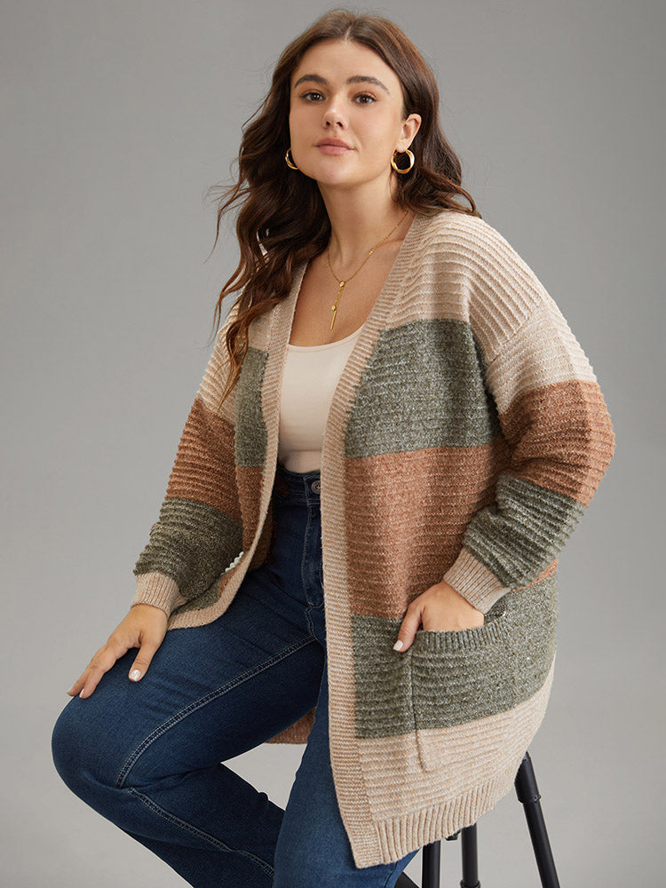 Plisse Colorblock Patched Pocket Open Front Cardigan