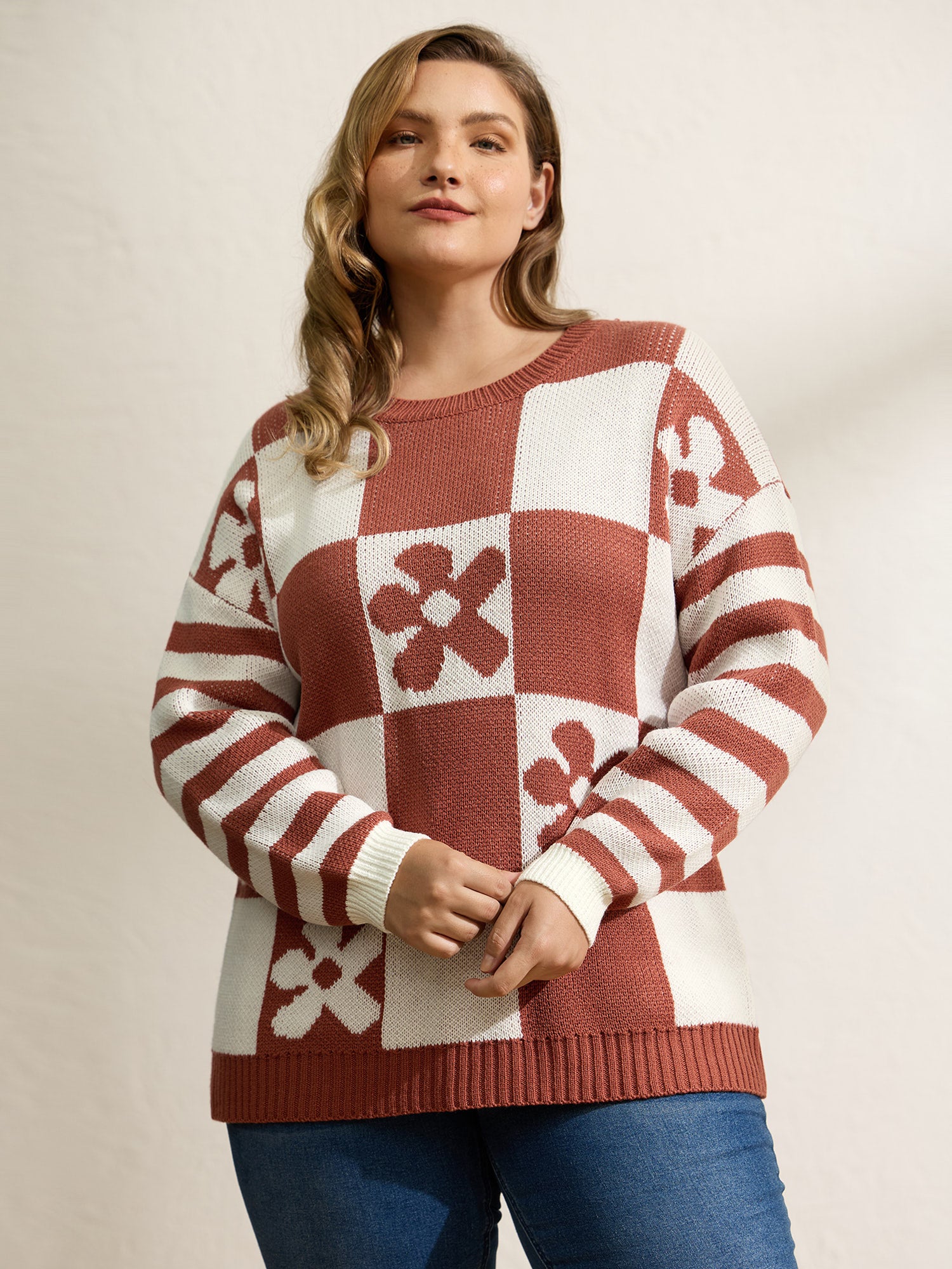 Checkered Floral Stripe Sleeve Jacquard Pullover