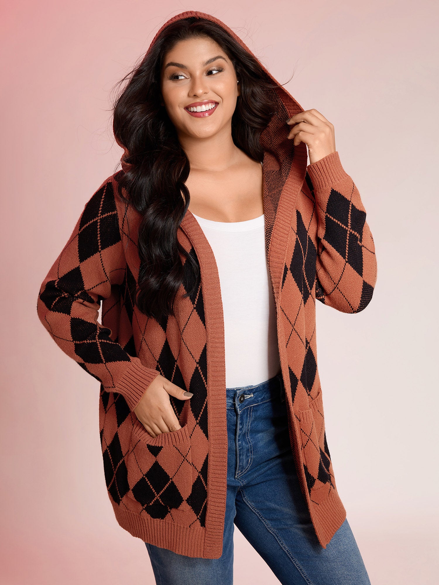 Checkered Jacquard Hooded Pockets Knit Cardigan