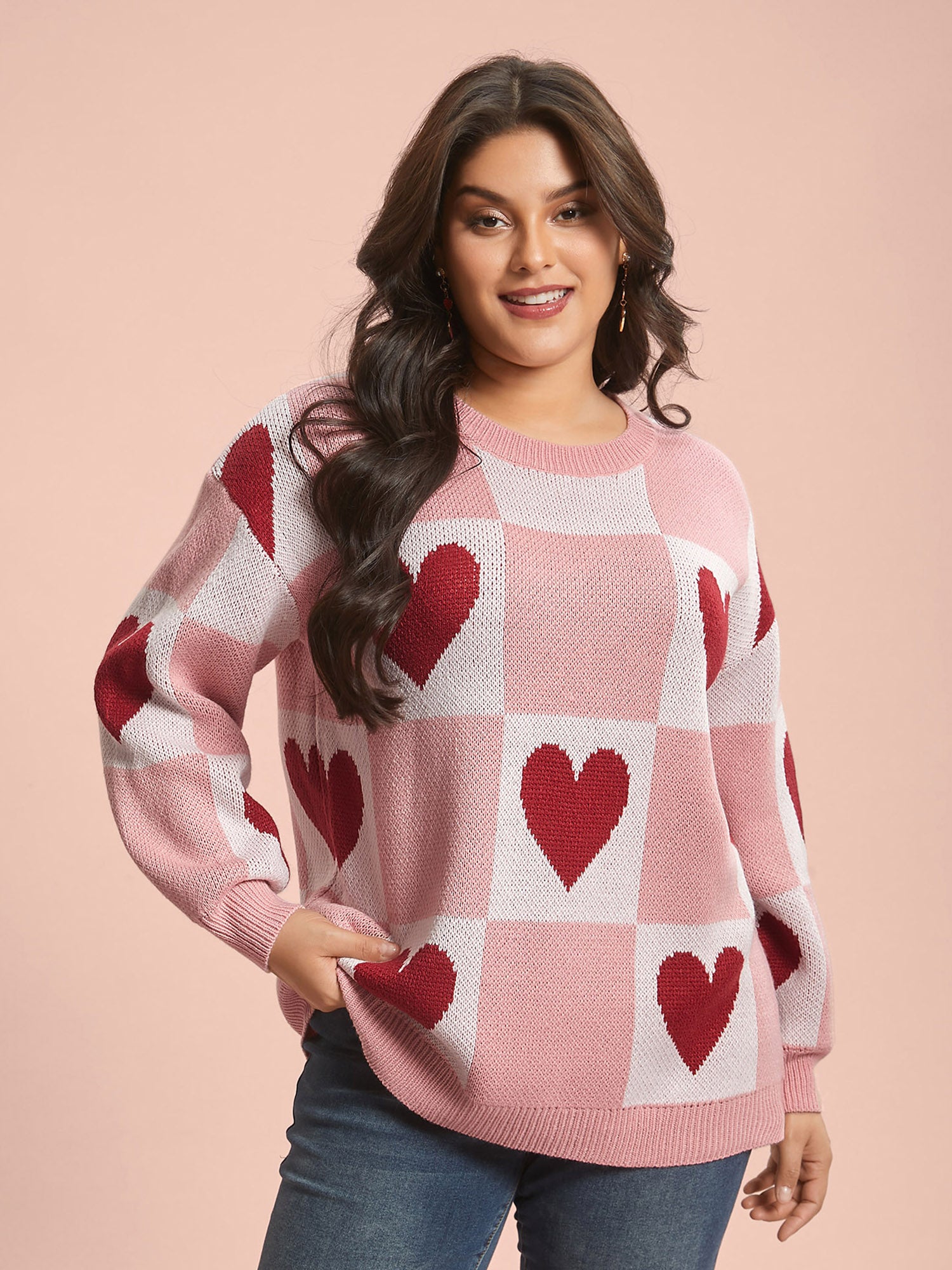 Checkered Hearts Jacquard Color-Contrast Pullover