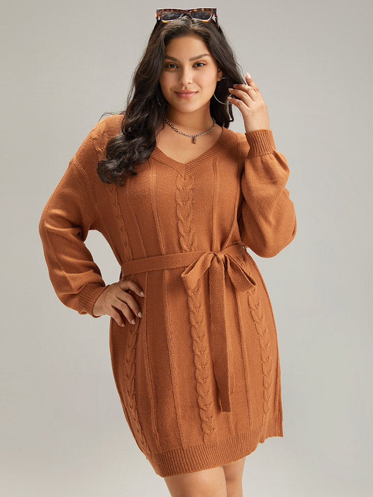 Cable Knit Belted Lantern Sleeve Sweater Dress