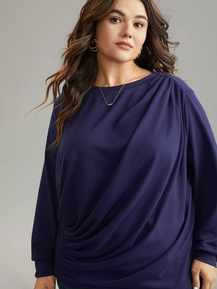 Plain Pleated Round Neck Slightly Stretchy Sweatshirt