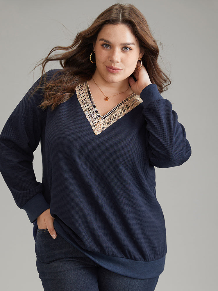 Patchwork Lace Panel V Neck Waffle Knit Sweatshirt