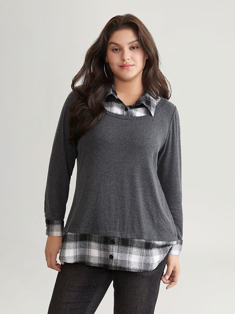 2-In-1 Plaid Patchwork Lapel Collar Sweatshirt