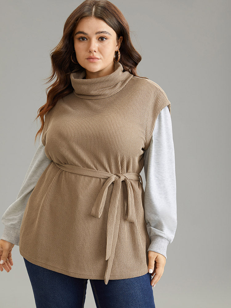 2-In-1 Turtleneck Texture Patchwork Belted Sweatshirt