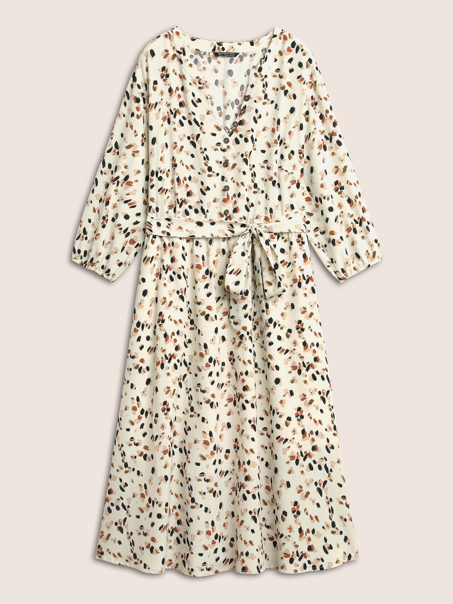 Shop Allover Print Notched Belted Button Detail Dress now and redefine your style with confidence at Sweetccc. Tailored for mid and plus-size women. This trendy Dress. sizes 10-30. You can never go wrong with Sweetccc Dresses. Season:Spring;Color:Apricot;Neckline:Notched collar;Sleeve Type:Lantern Sleeve;Pattern Type:Leopard;Pocket:Side seam pocket;Belt:Belt