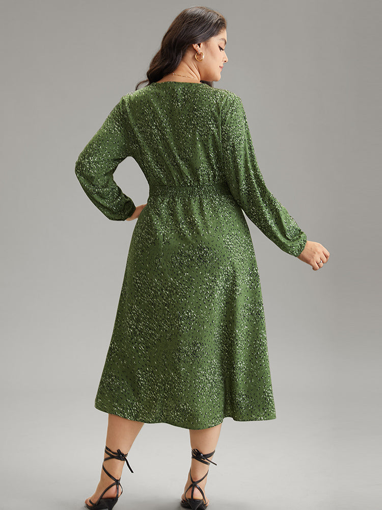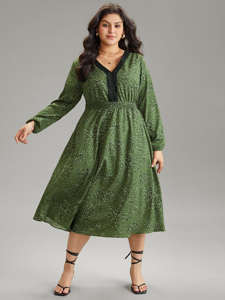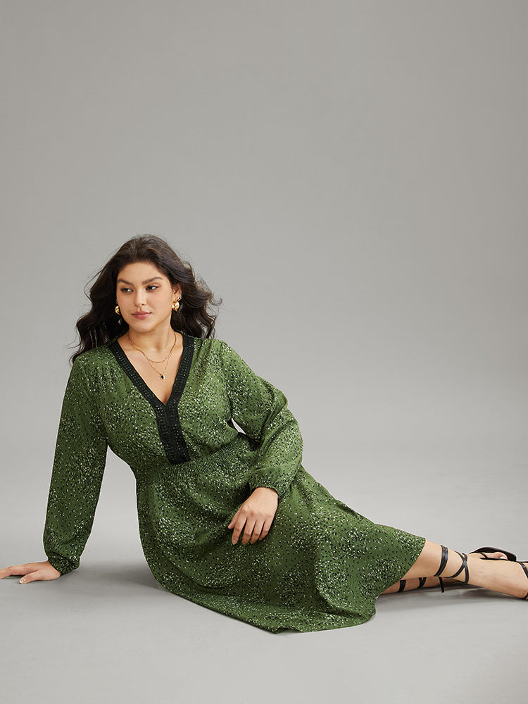 Shop Allover Print Shirred Pocket Contrast Trim Dress now and redefine your style with confidence at Sweetccc. Tailored for mid and plus-size women. This trendy Dress. sizes 10-30. You can never go wrong with Sweetccc Dresses. Season:Winter;Color:ArmyGreen;Style:Elegant;Neckline:V-neck;Sleeve Type:Lantern Sleeve;Pattern Type:Graphic. Geometric. Colorblock;Details:Shirred. Elastic Waist. Pocket. Printed. Elastic cuffs;Pocket:It is perfectly sized to carry a phone.;Belt:No-belt
