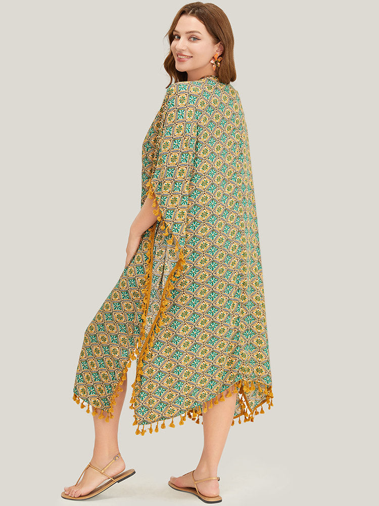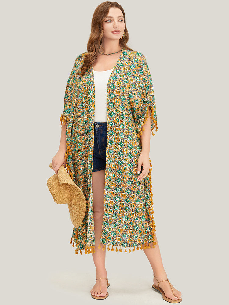 Shop Bandana Batwing Sleeve Tassels Trim Split Open Front Kimono now and redefine your style with confidence at Sweetccc. Tailored for mid and plus-size women. This trendy Outerwear Women. sizes 10-30. Color:Mint;Style:Vacation;Pattern Type:Bohemian Print;Pocket:No-pocket;Belt:Belt
