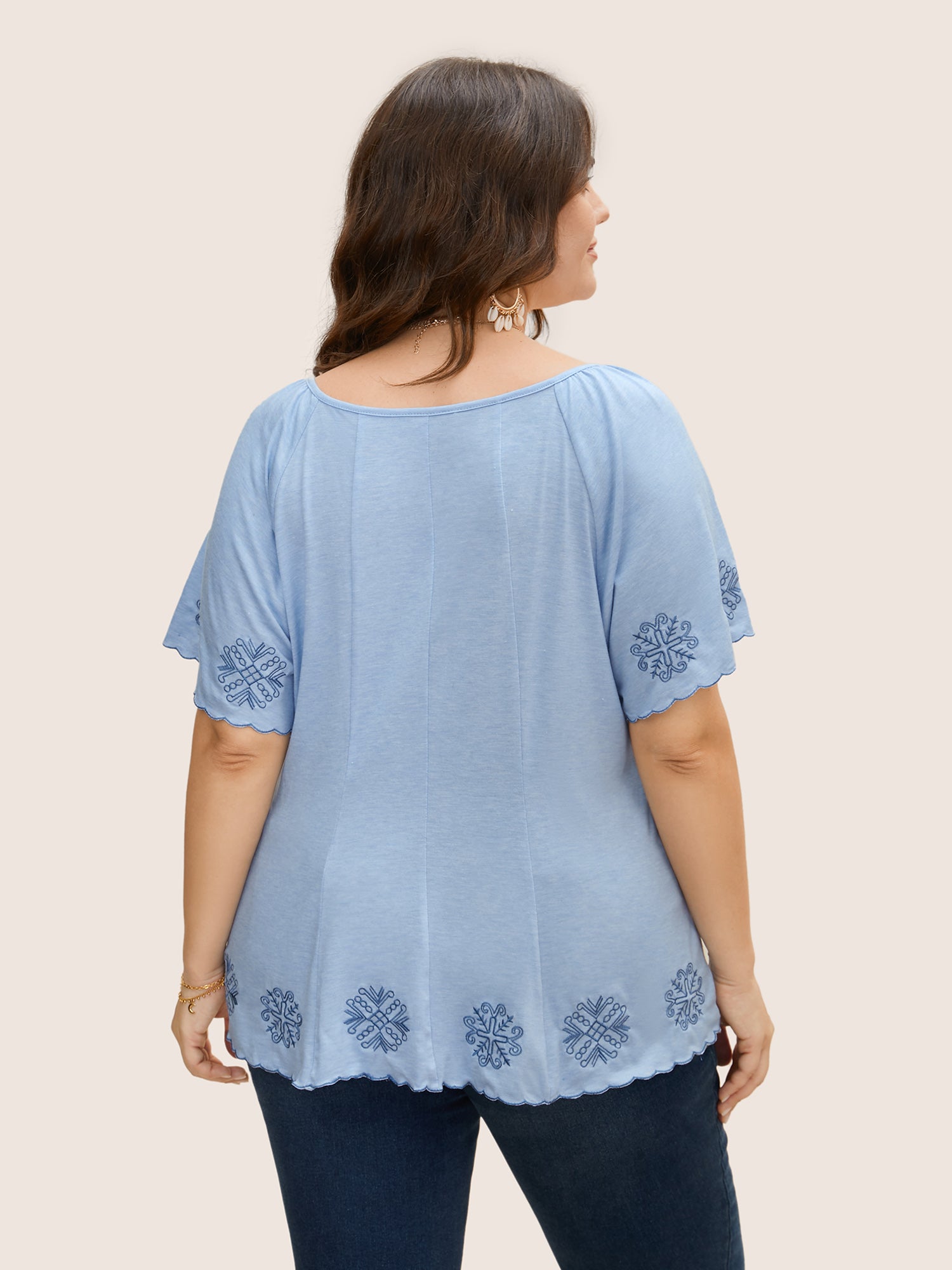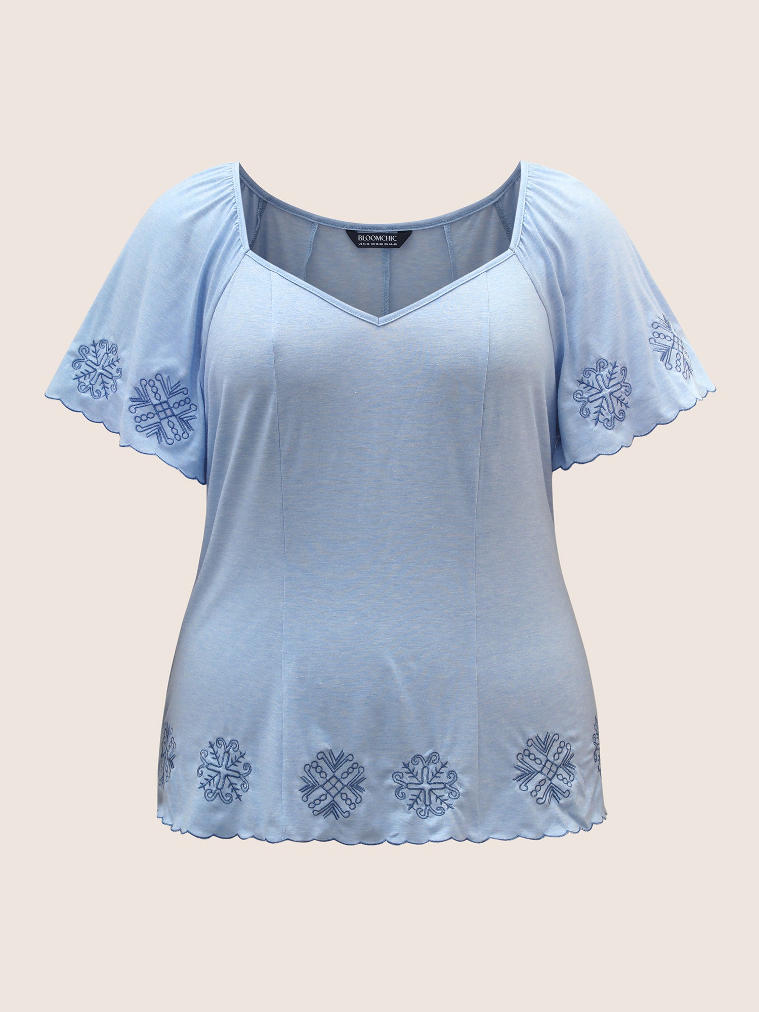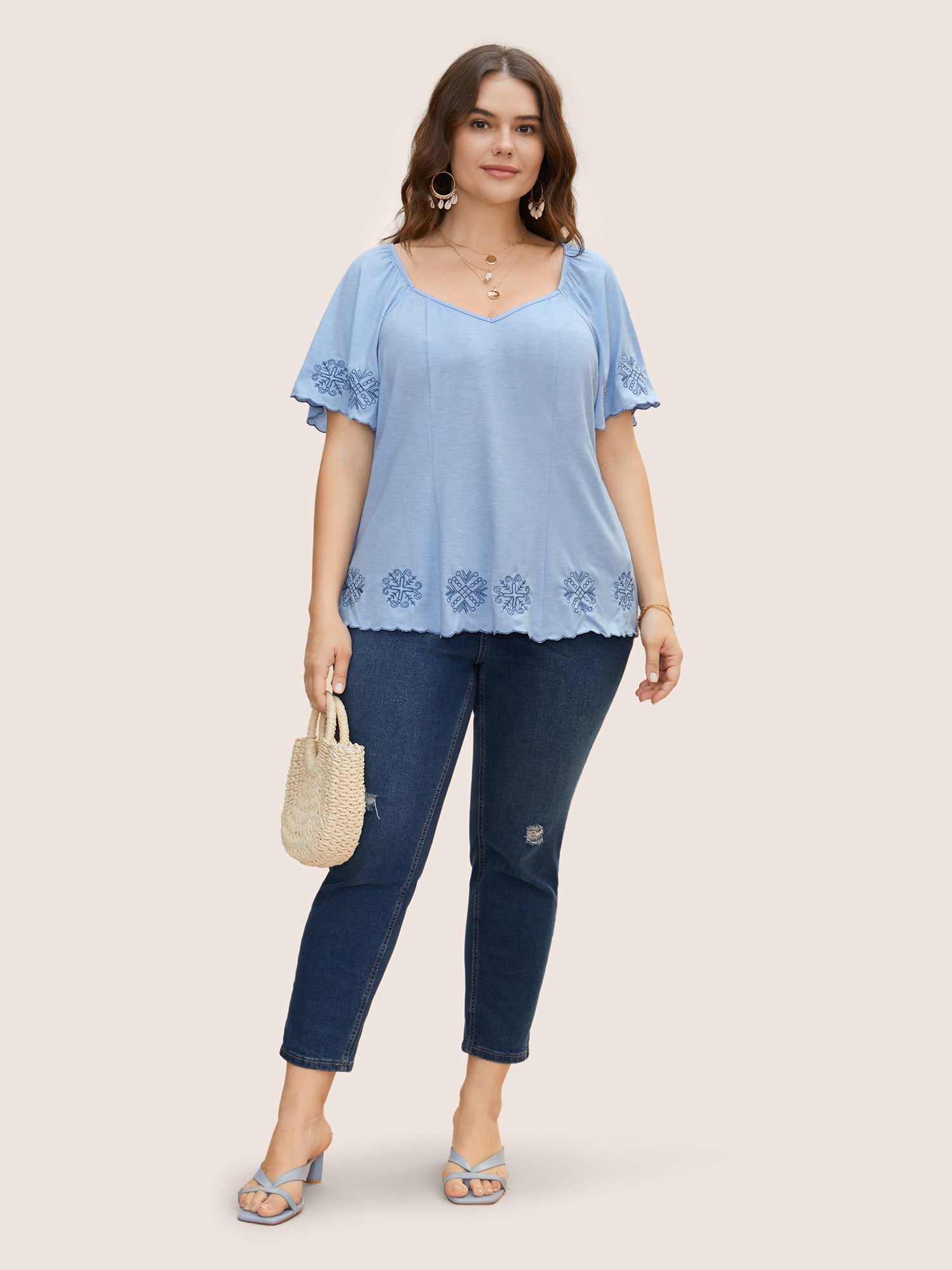 Shop Bandana Floral Embroidered Ruffle Sleeve T-shirt now and redefine your style with confidence at Sweetccc. Tailored for mid and plus-size women. This trendy Tops Women. sizes 10-30. Color:LightBlue;Style:Resort Vacation;Prints:Floral;Neckline:Heart neckline;Sleeve Type:Ruffle Sleeve;Details:Embroidered;Pocket:No-pocket