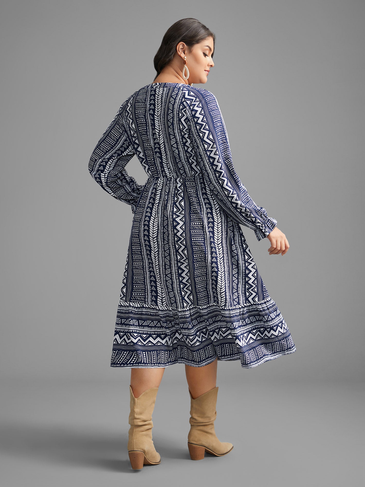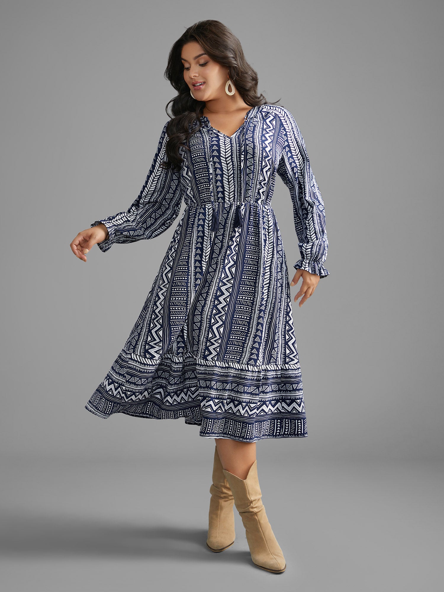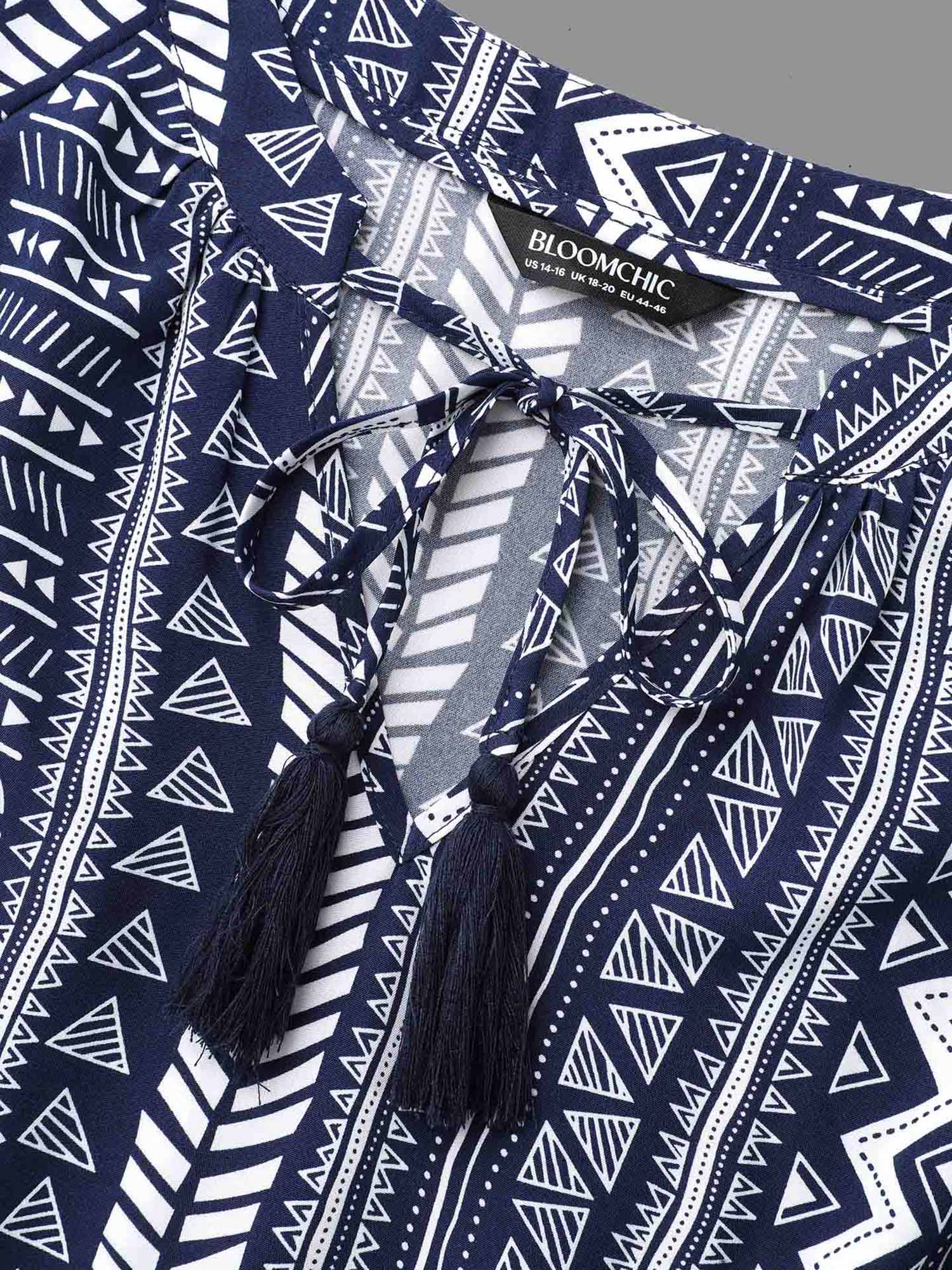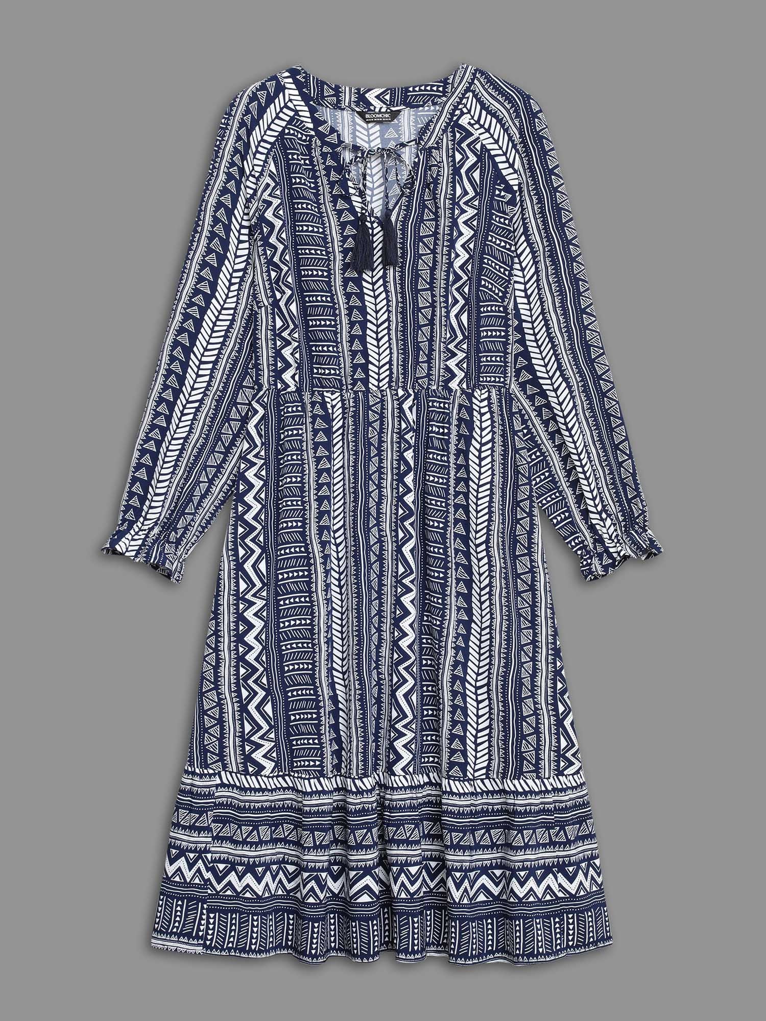Shop Bandana Geometric Tassels Tie Knot Dress now and redefine your style with confidence at Sweetccc. Tailored for mid and plus-size women. This trendy Dress. sizes 10-30. You can never go wrong with Sweetccc Dresses. Season:Winter;Color:Indigo;Style:Resort;Neckline:Flat collar with V-notch;Sleeve Type:Lantern Sleeve;Prints:Bohemian print;Details:Tie knot. Tassels;Pocket:Side seam pocket;Belt:No-belt;Closure Type:Non