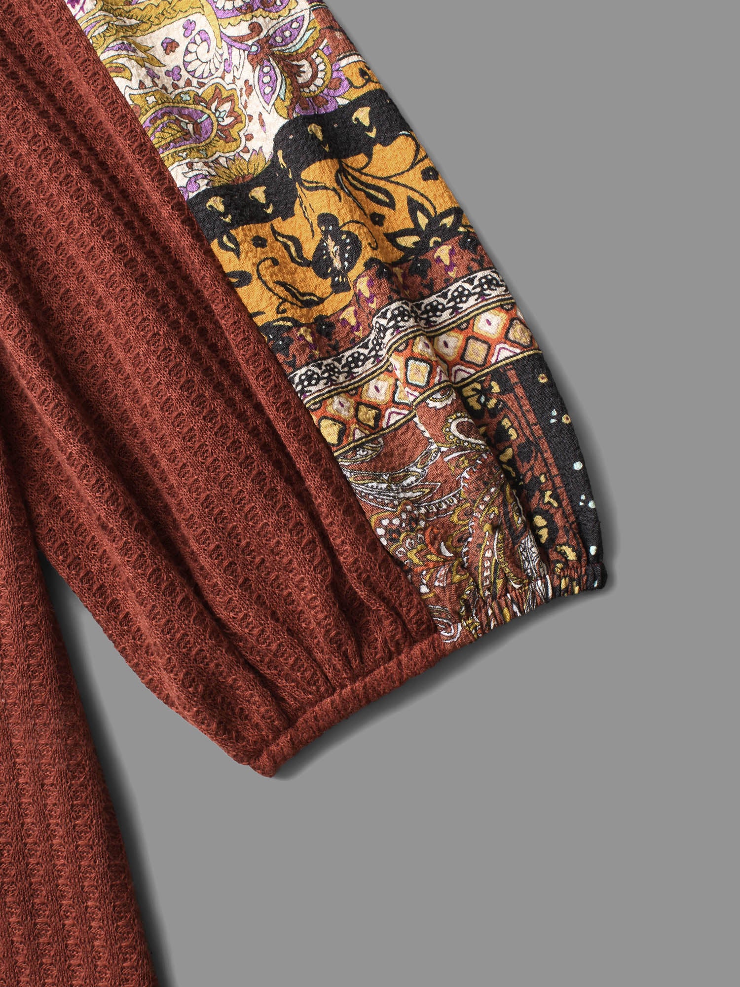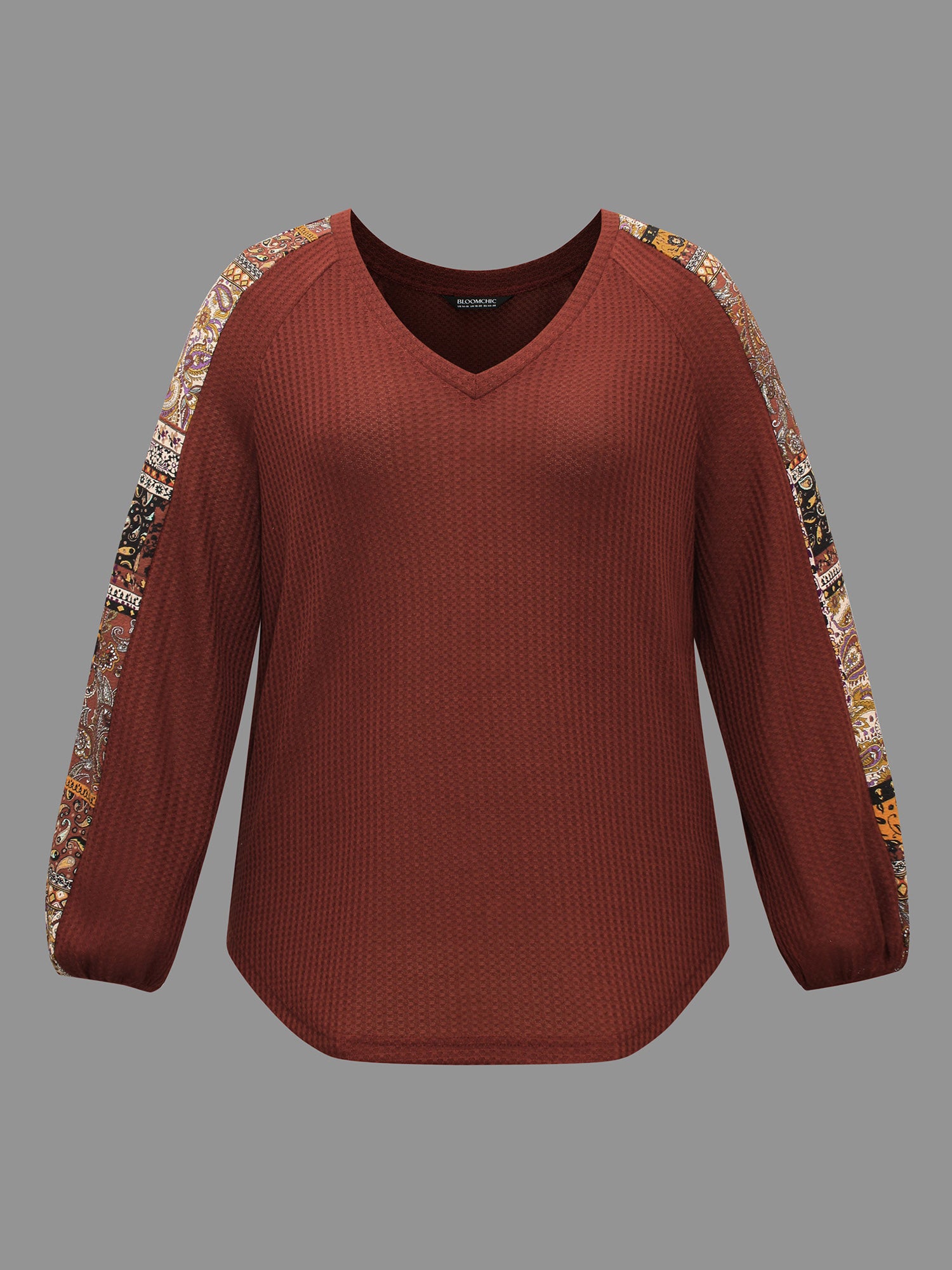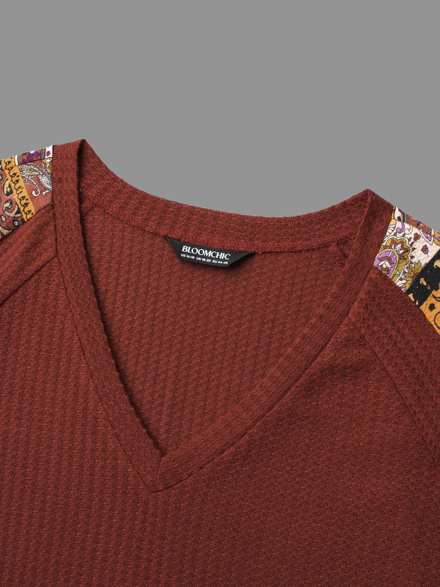 Shop Bandana Patchwork Waffle Knit T-shirt now and redefine your style with confidence at Sweetccc. Tailored for mid and plus-size women. This trendy Tops Women. sizes 10-30. Season:Winter;Color:Maroon;Style:Casual;Prints:Non;Neckline:V-neck;Sleeve Type:Regular Sleeve;Details:Patchwork. Contrast. Texture;Pocket:No-pocket