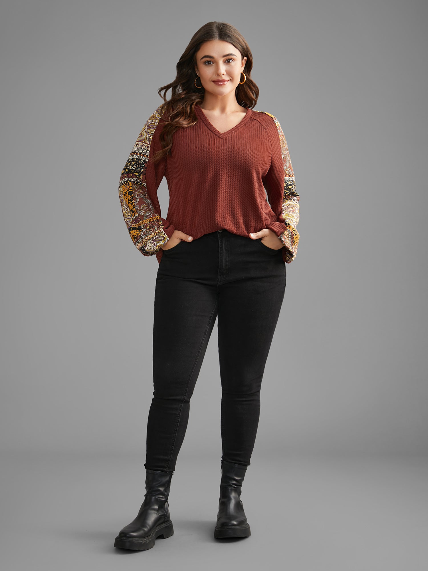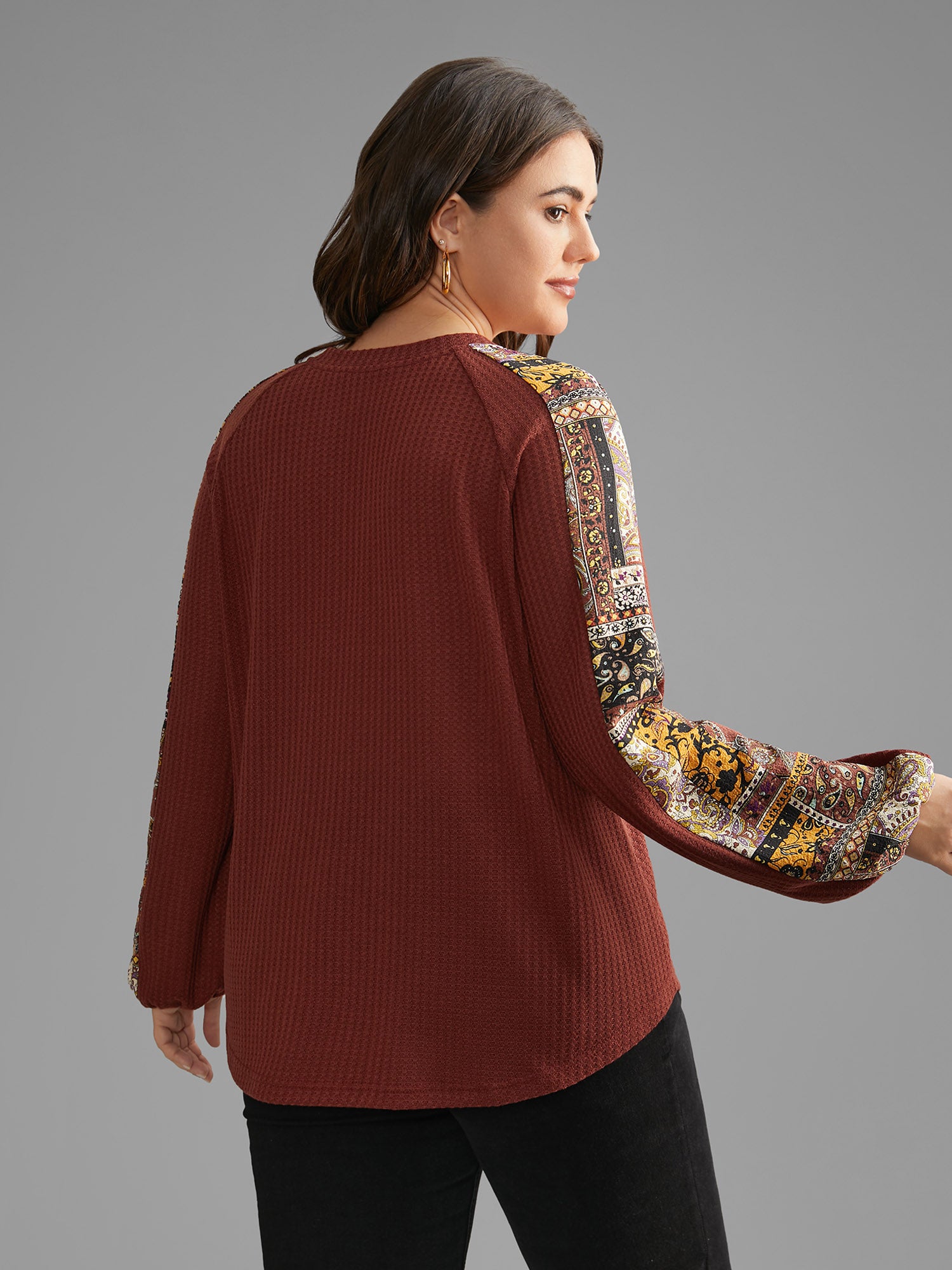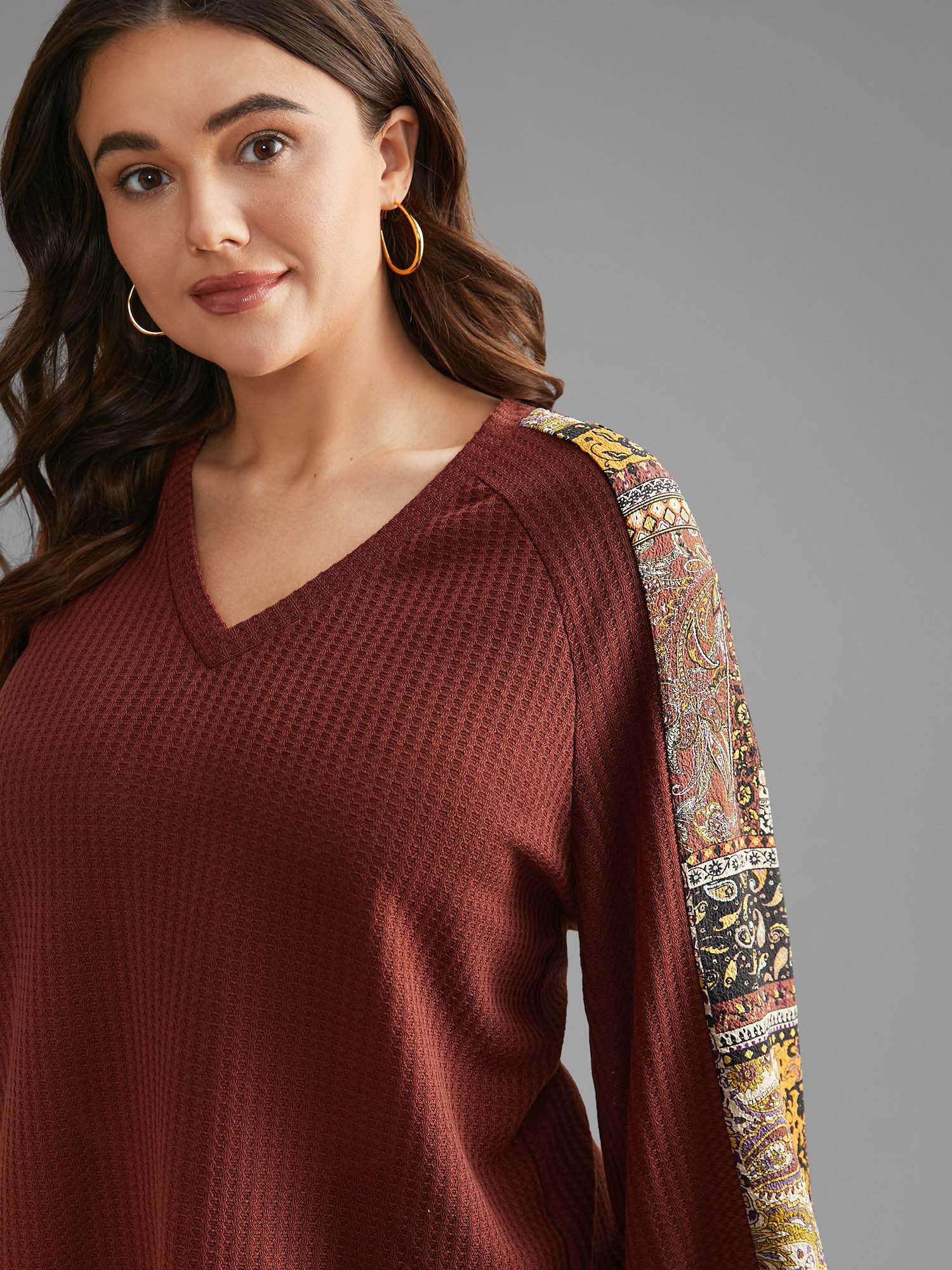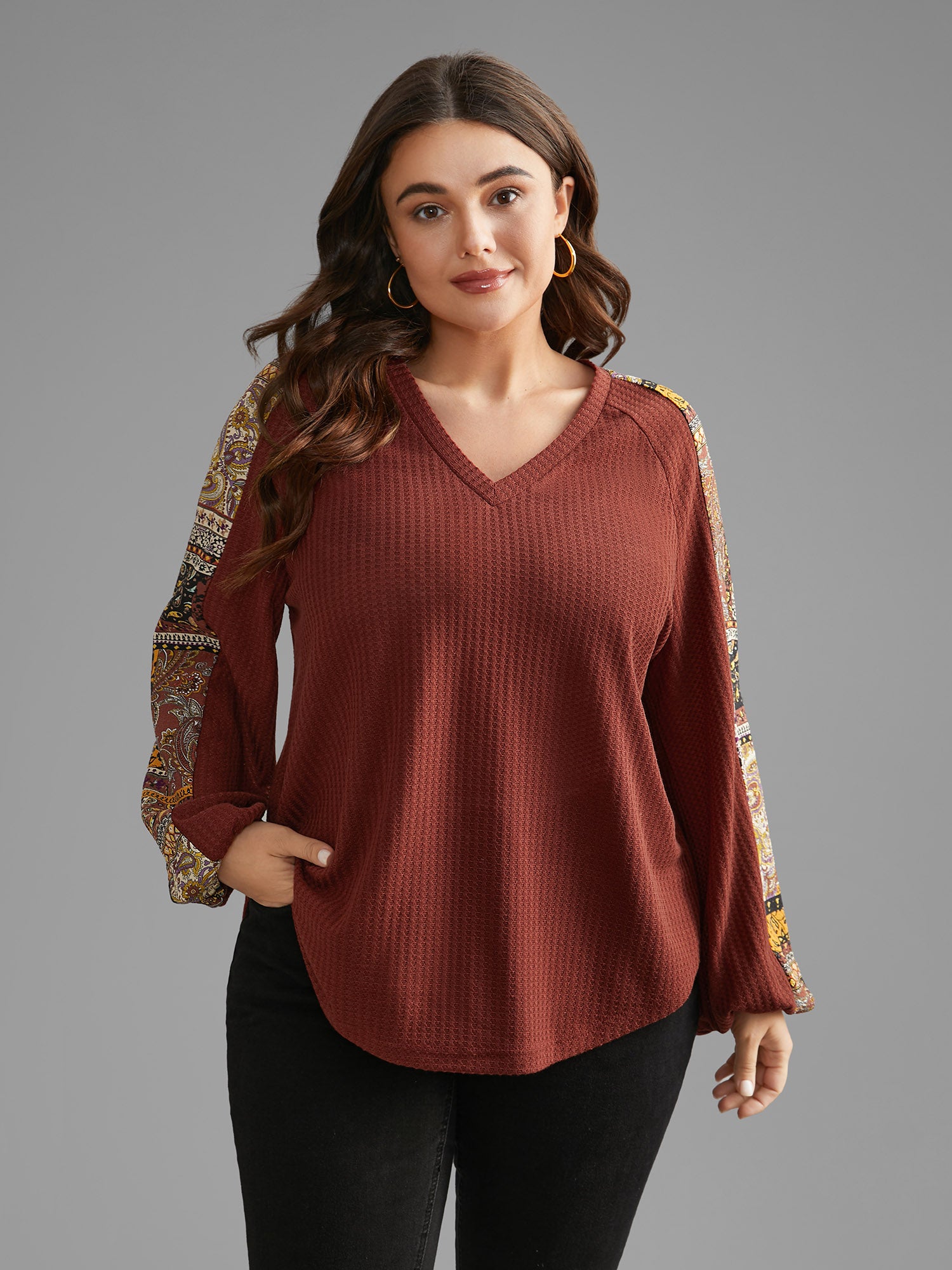 Shop Bandana Patchwork Waffle Knit T-shirt now and redefine your style with confidence at Sweetccc. Tailored for mid and plus-size women. This trendy Tops Women. sizes 10-30. Season:Winter;Color:Maroon;Style:Casual;Prints:Non;Neckline:V-neck;Sleeve Type:Regular Sleeve;Details:Patchwork. Contrast. Texture;Pocket:No-pocket