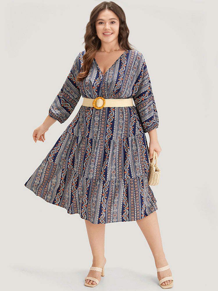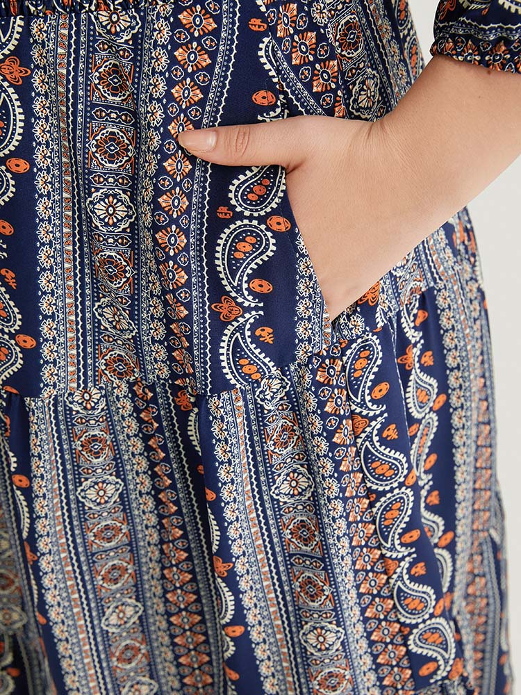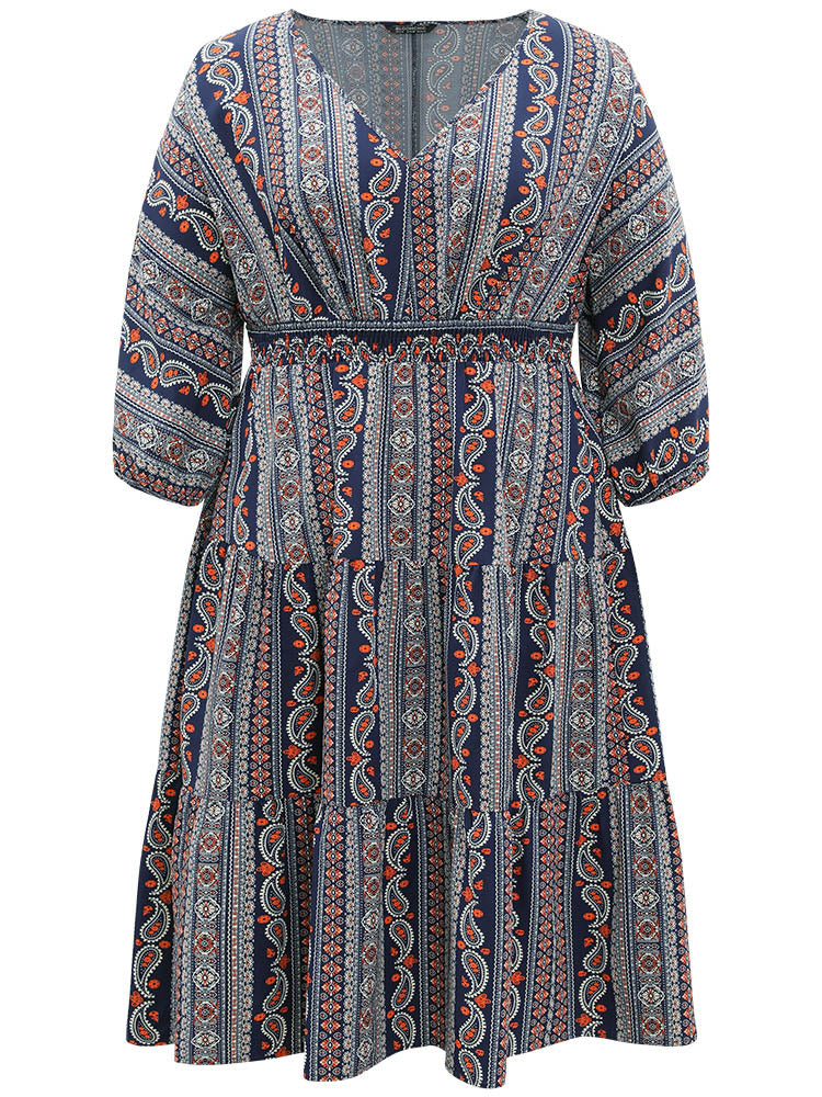 Shop Bandana Print Elastic Cuffs Layered Hem Dress now and redefine your style with confidence at Sweetccc. Tailored for mid and plus-size women. This trendy Dress. sizes 10-30. You can never go wrong with Sweetccc Dresses. Season:Fall;Color:DarkBlue;Style:Vacation;Neckline:V-neck;Sleeve Type:Regular Sleeve;Pattern Type:Bohemian Print;Details:Shirred. Pocket. Printed. Elastic cuffs;Pocket:It is perfectly sized to carry a phone.;Belt:No-belt