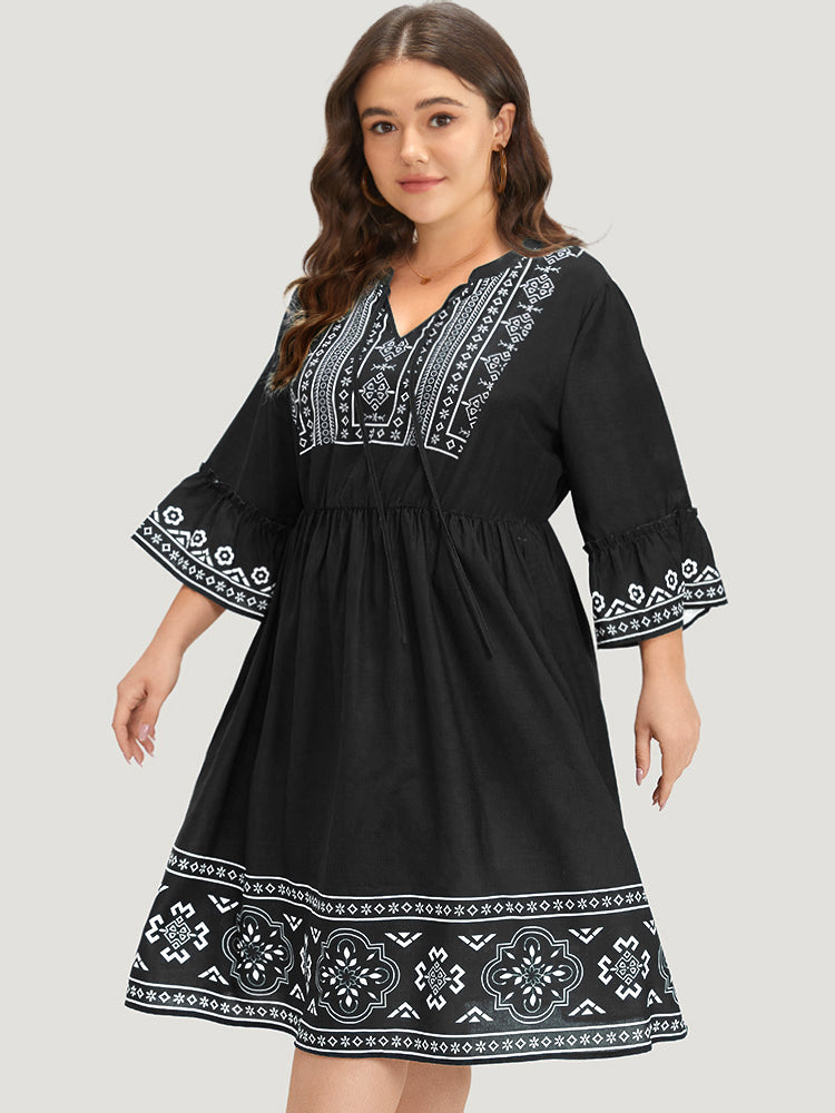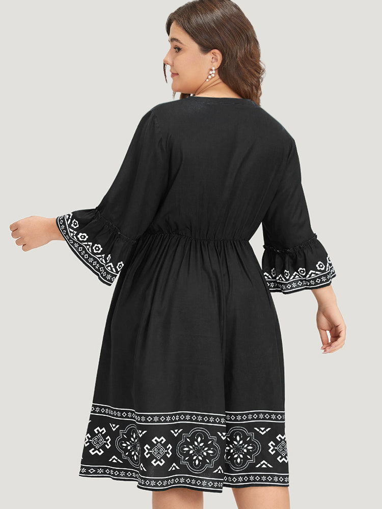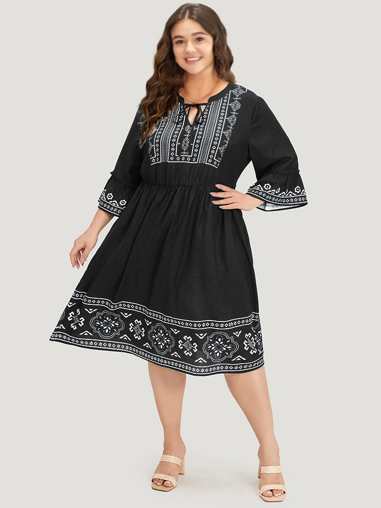 Shop Bandana Print Knot Neck Frill Trim Bell Sleeve Dress now and redefine your style with confidence at Sweetccc. Tailored for mid and plus-size women. This trendy Dress. sizes 10-30. You can never go wrong with Sweetccc Dresses. Color:Black;Style:Vacation;Neckline:Notched collar;Sleeve Type:Bell Sleeve;Pattern Type:Bohemian Print;Details:Pocket. Elastic Waist. Cross straps. Printed. Frill Trim;Pocket:It is perfectly sized to carry a phone.;Belt:No-belt