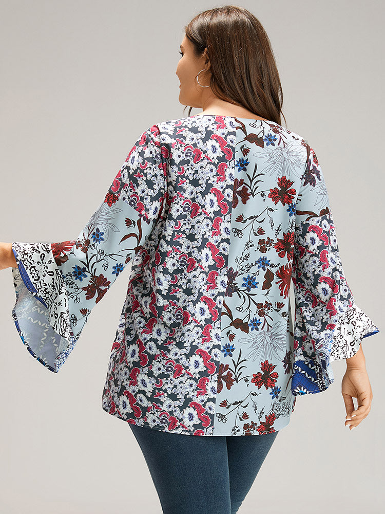 Shop Bandana Print Patchwork Bell Sleeve Blouse now and redefine your style with confidence at Sweetccc. Tailored for mid and plus-size women. This trendy Tops Women. sizes 10-30. Color:Stone;Style:Elegant;Pattern Type:Bohemian Print;Neckline:V-neck;Sleeve Type:Bell Sleeve;Details:Ruffles. Patchwork;Pocket:No-pocket