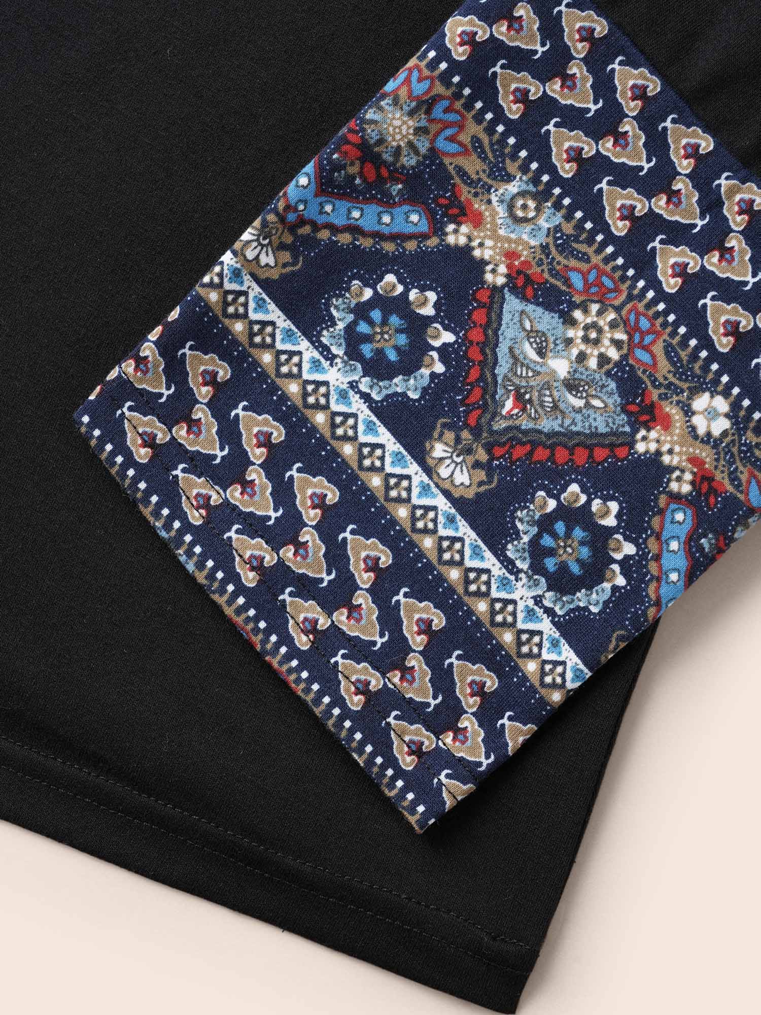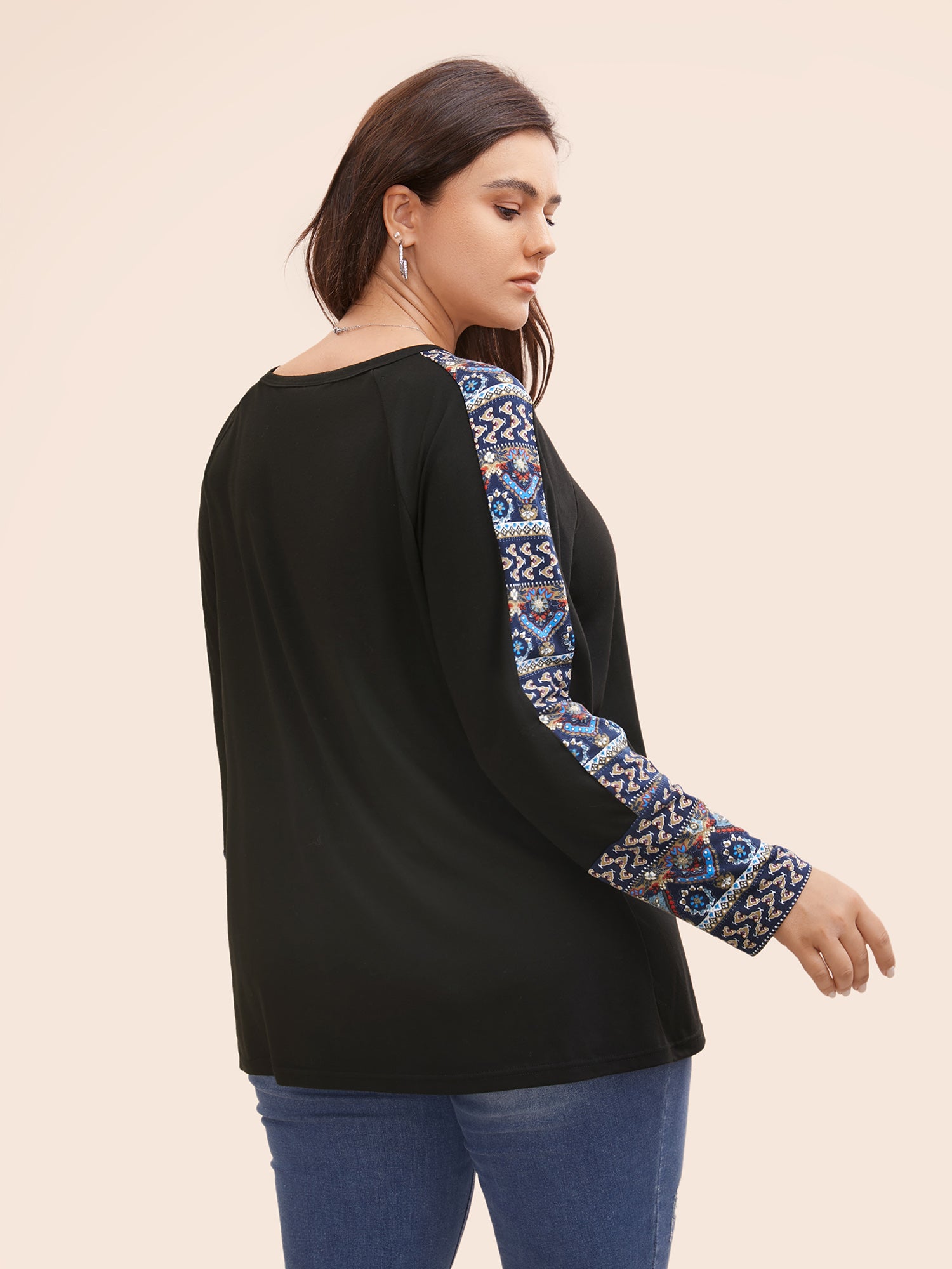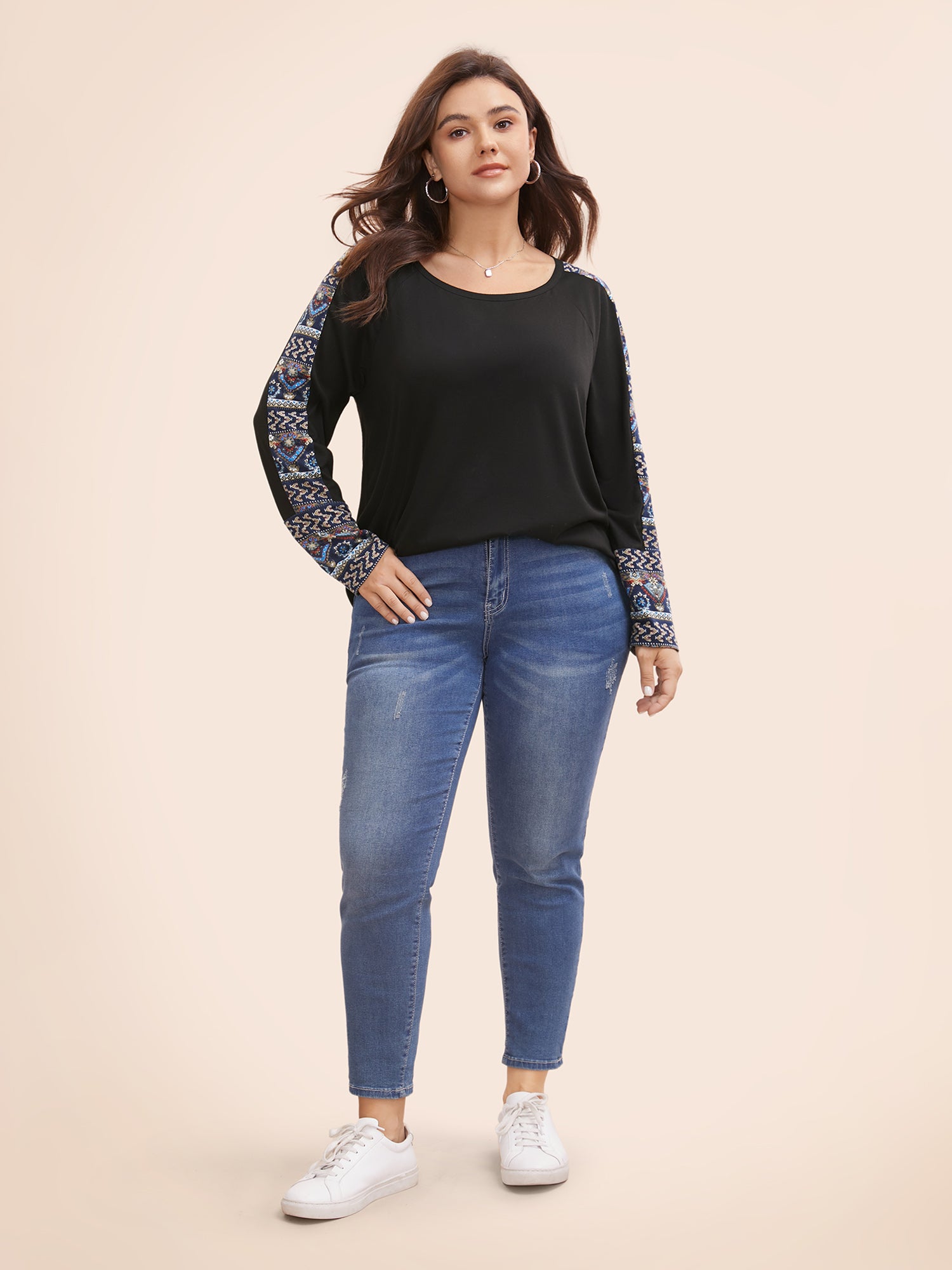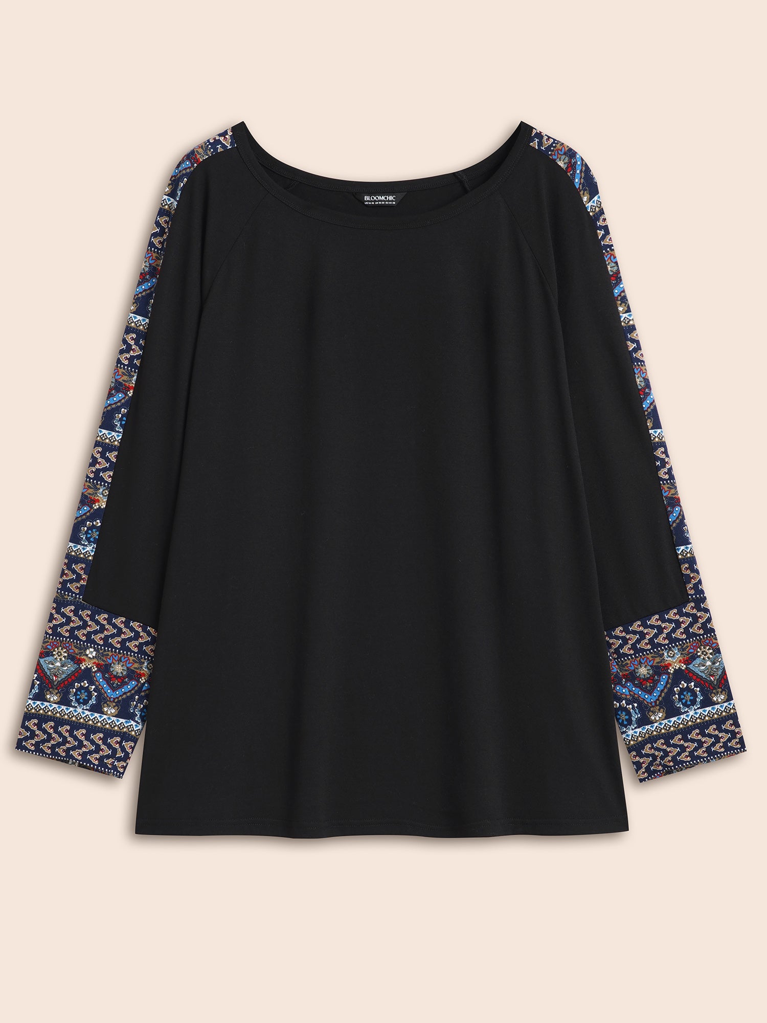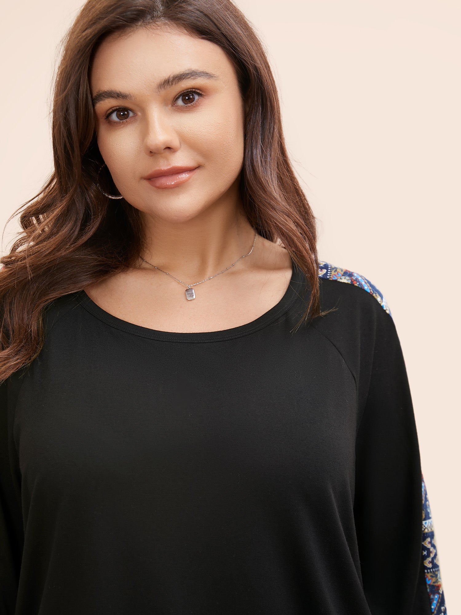 Shop Bandana Print Patchwork Round Neck T-shirt now and redefine your style with confidence at Sweetccc. Tailored for mid and plus-size women. This trendy Tops Women. sizes 10-30. Season:Fall;Color:Black;Style:Casual;Prints:Bohemian print;Neckline:Round Neck;Sleeve Type:Regular Sleeve;Details:Patchwork. Contrast;Pocket:No-pocket