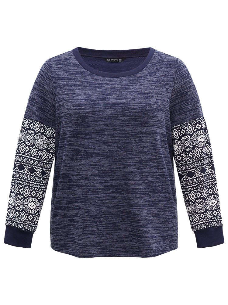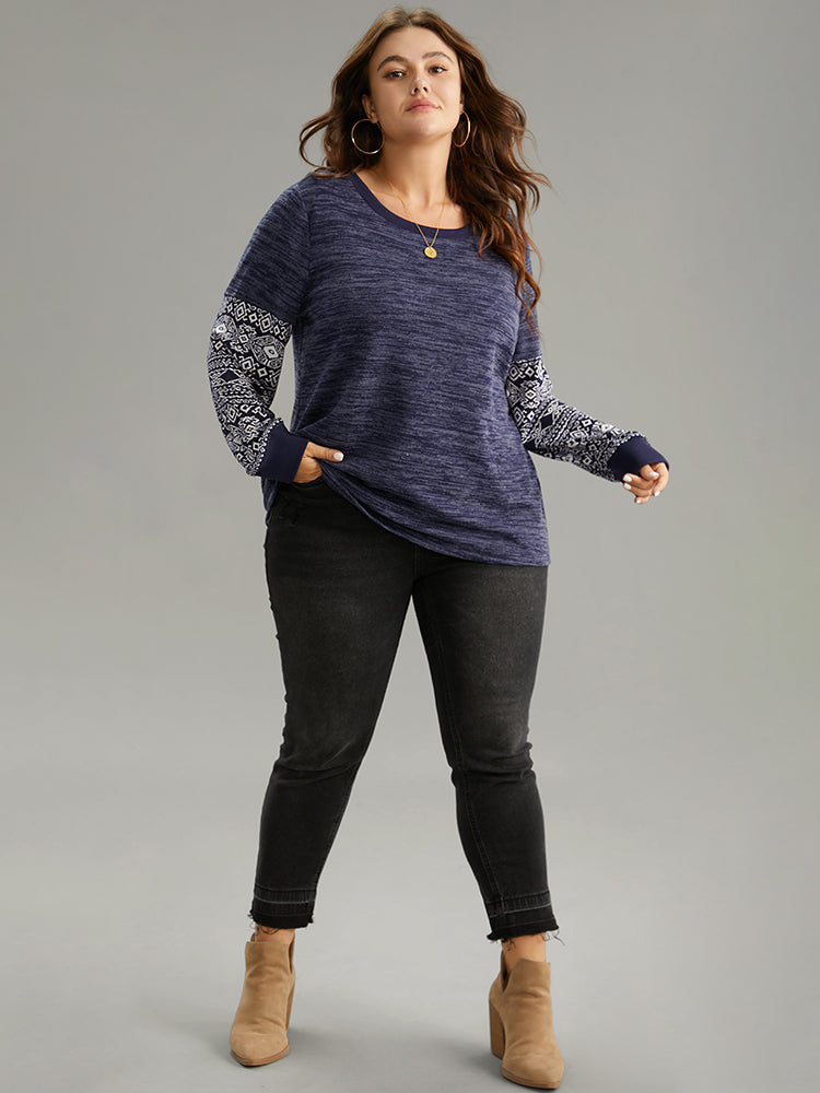 Shop Boho Print Patchwork Heather Rib Knit Sweatshirt now and redefine your style with confidence at Sweetccc. Tailored for mid and plus-size women. This trendy Tops Women. sizes 10-30. Color:Navy;Style:Casual;Neckline:Round Neck;Sleeve Type:Regular Sleeve;Pattern Type:Bohemian Print;Pocket:No-pocket;Belt:No-belt