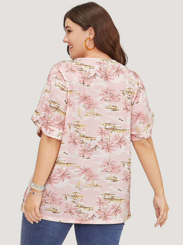 Shop Coconut Tree Print Gathered Twist Sleeve T-shirt now and redefine your style with confidence at Sweetccc. Tailored for mid and plus-size women. This trendy Tops Women. sizes 10-30. Season:Summer;Color:Rouge;Style:Vacation;Pattern Type:Tropical;Neckline:V-neck;Sleeve Type:Regular Sleeve;Pocket:No-pocket