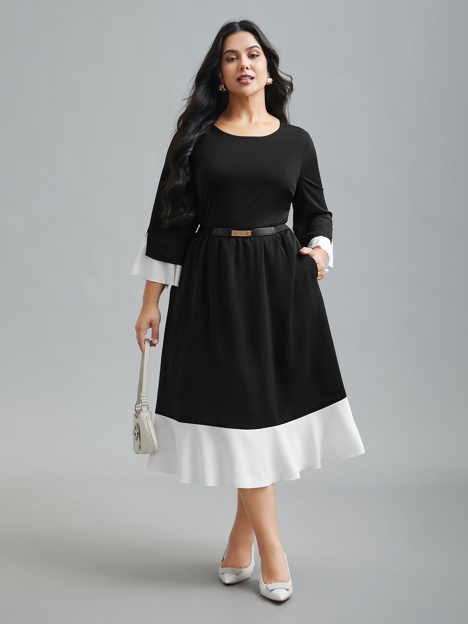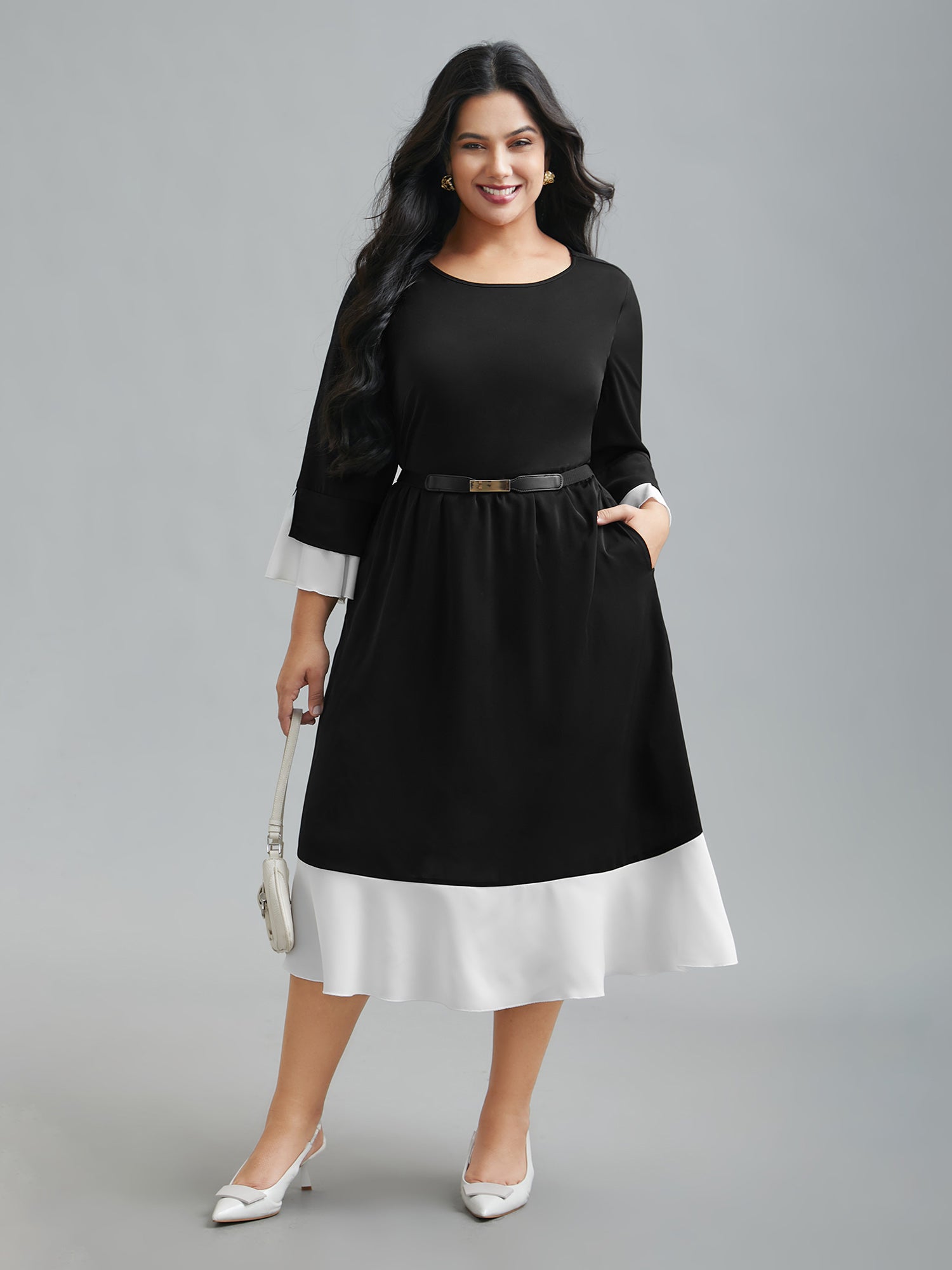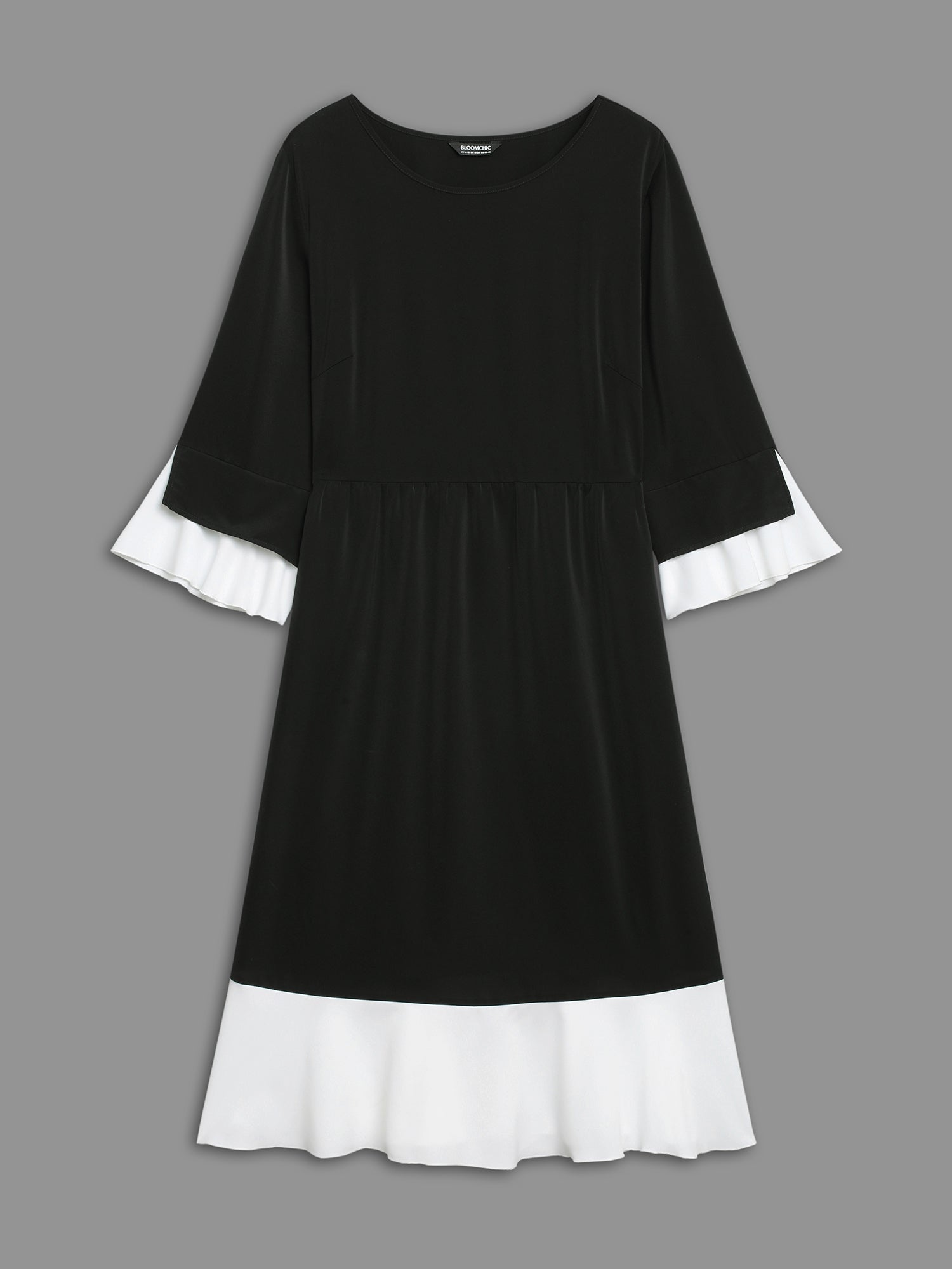 Shop Color Contrast Tiered Skirt Pocket Midi Dress now and redefine your style with confidence at Sweetccc. Tailored for mid and plus-size women. This trendy Dress. sizes 10-30. You can never go wrong with Sweetccc Dresses. Season:Winter;Color:Black;Style:At the Office;Neckline:Round Neck;Sleeve Type:Ruffle Sleeve;Prints:Non;Details:Contrast. Patchwork;Pocket:Side seam pocket;Belt:No-belt;Closure Type:Non