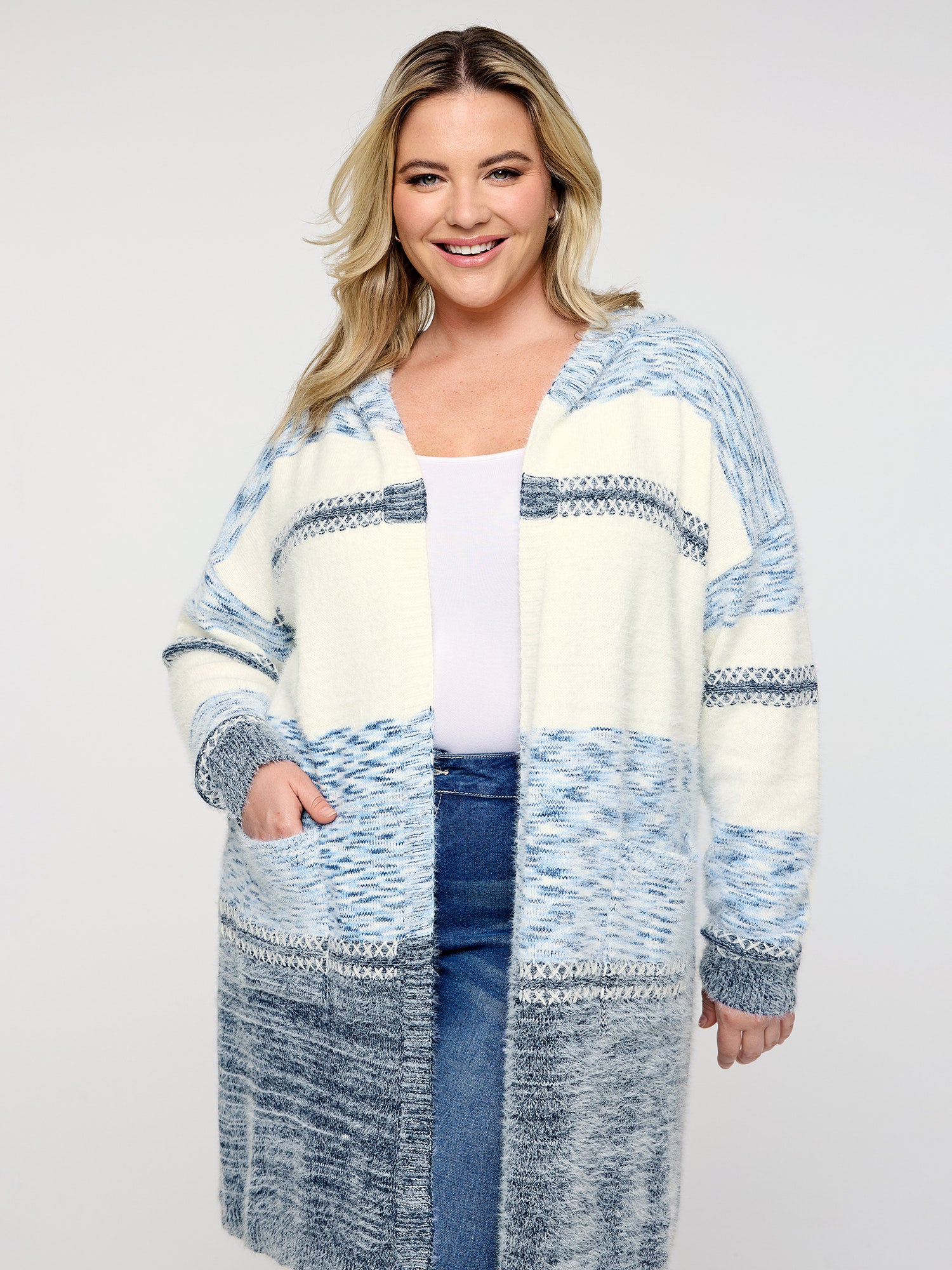 Shop Colorblock Hooded Textured Knit Cardigan now and redefine your style with confidence at Sweetccc. Tailored for mid and plus-size women. This trendy Sweaters Cardigans Women. sizes 10-30. Color:Indigo;Style:Leisure Casual;Neckline:Hooded;Sleeve Type:Regular Sleeve;Prints:Geometric & color block;Details:Contrast. Texture;Pocket:Patch pocket;Belt:No-belt;Closure Type:Open front without closure