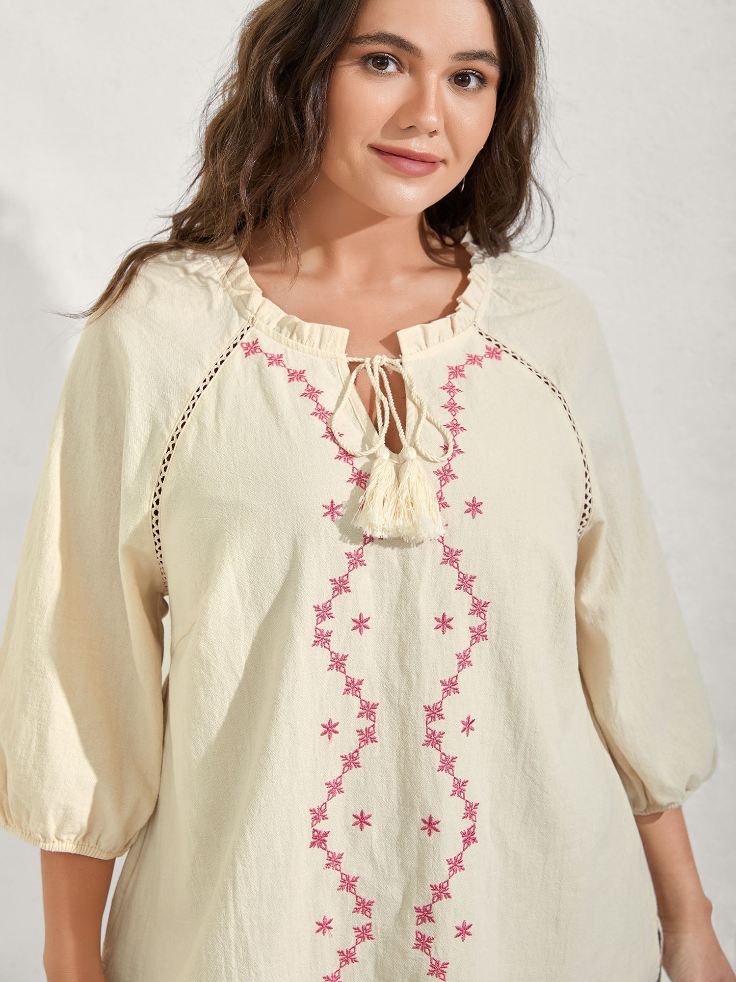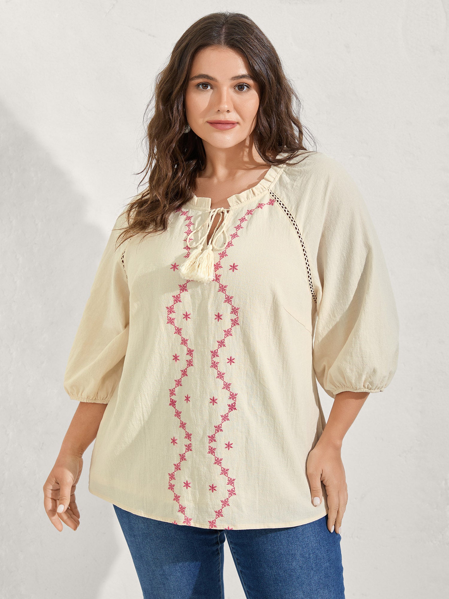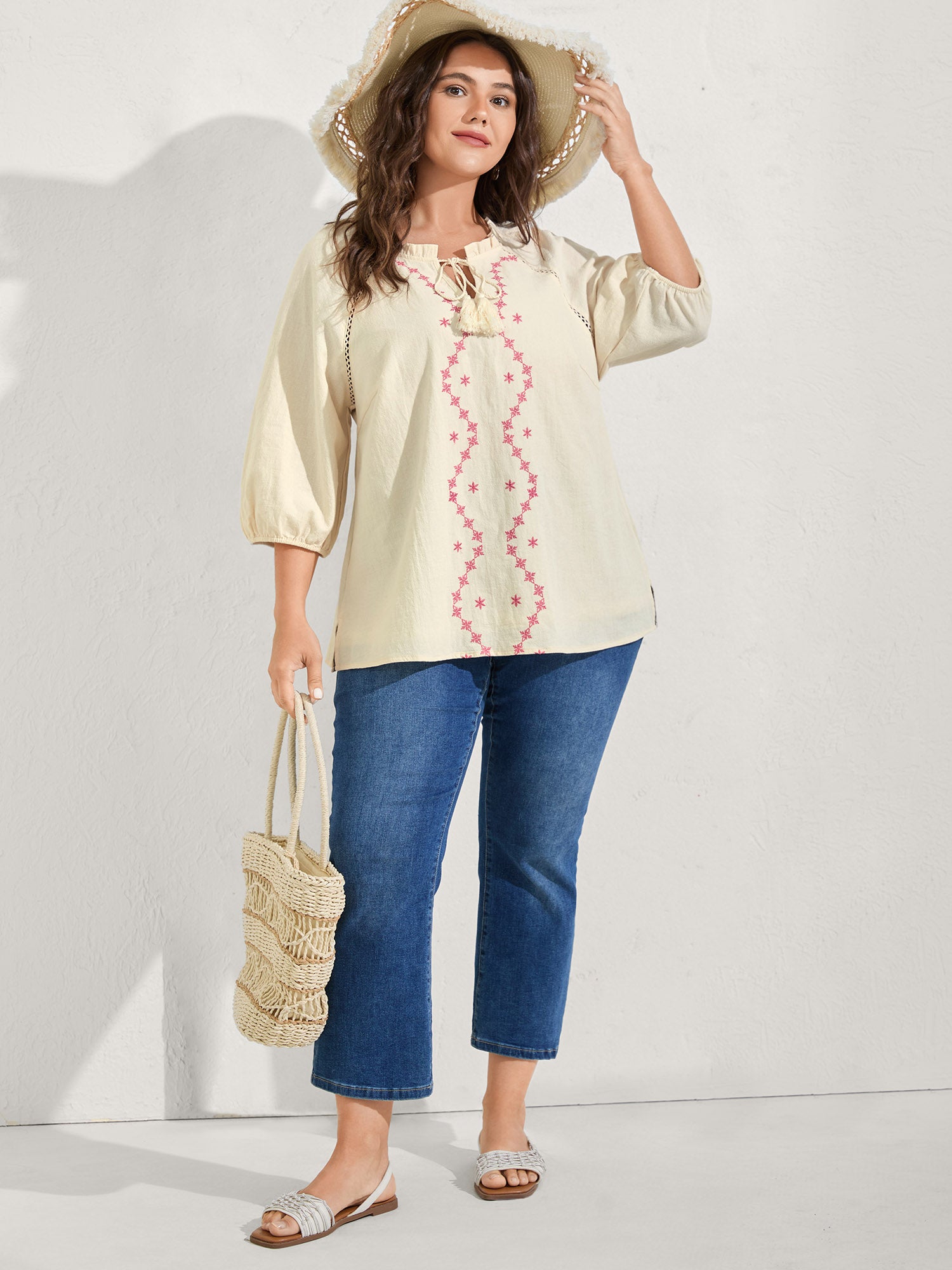Shop Cotton Lace Embroidered Shirred Neck-Tie Blouse now and redefine your style with confidence at Sweetccc. Tailored for mid and plus-size women. This trendy Tops Women. sizes 10-30. Color:Ivory;Prints:Non;Neckline:Flat collar with V-notch;Sleeve Type:Lantern Sleeve;Details:Ruffles. Tie knot. Woven ribbon&lace trim. Embroidered. Tassels. Slit;Pocket:No-pocket
