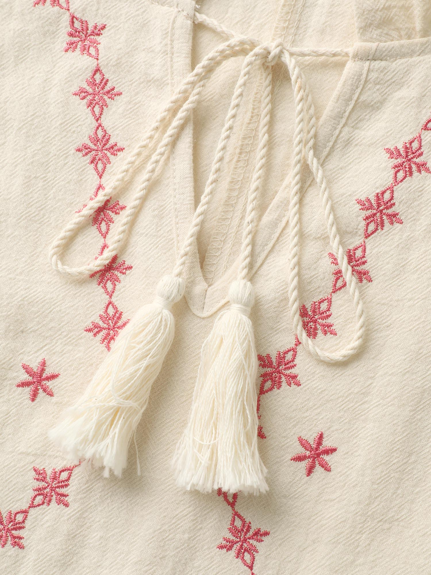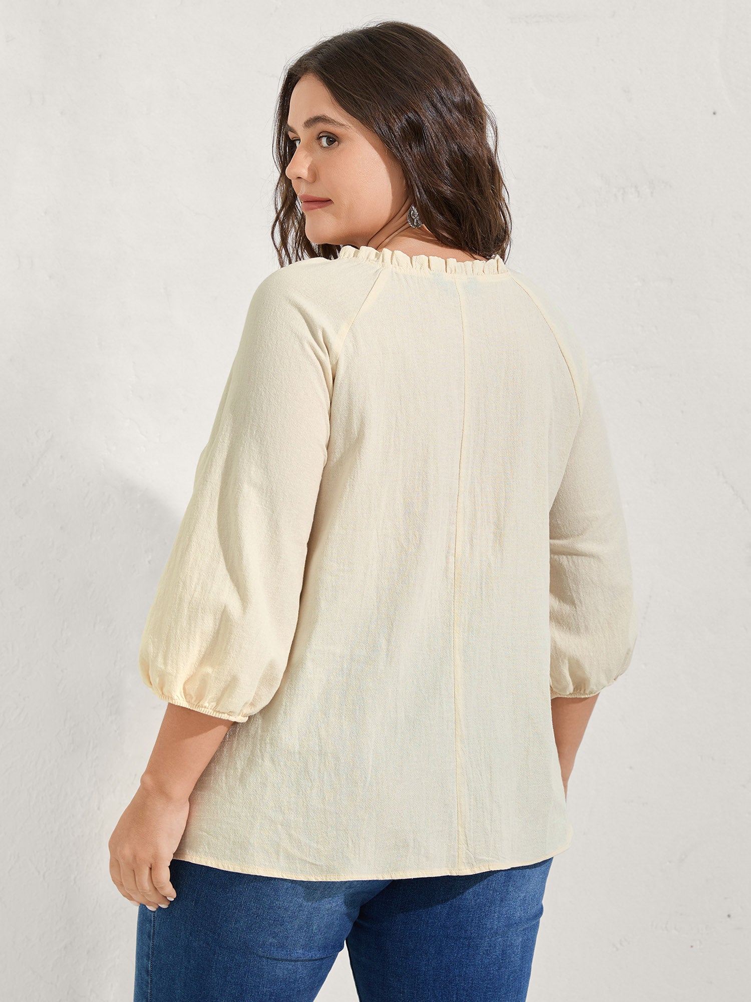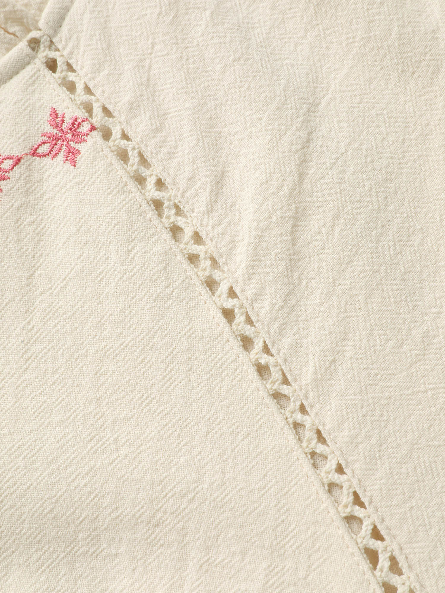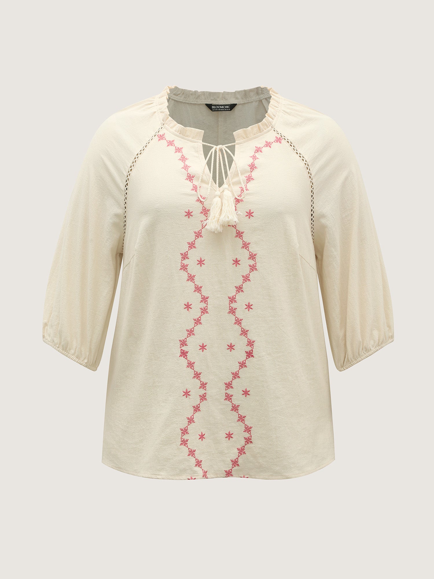 Shop Cotton Lace Embroidered Shirred Neck-Tie Blouse now and redefine your style with confidence at Sweetccc. Tailored for mid and plus-size women. This trendy Tops Women. sizes 10-30. Color:Ivory;Prints:Non;Neckline:Flat collar with V-notch;Sleeve Type:Lantern Sleeve;Details:Ruffles. Tie knot. Woven ribbon&lace trim. Embroidered. Tassels. Slit;Pocket:No-pocket