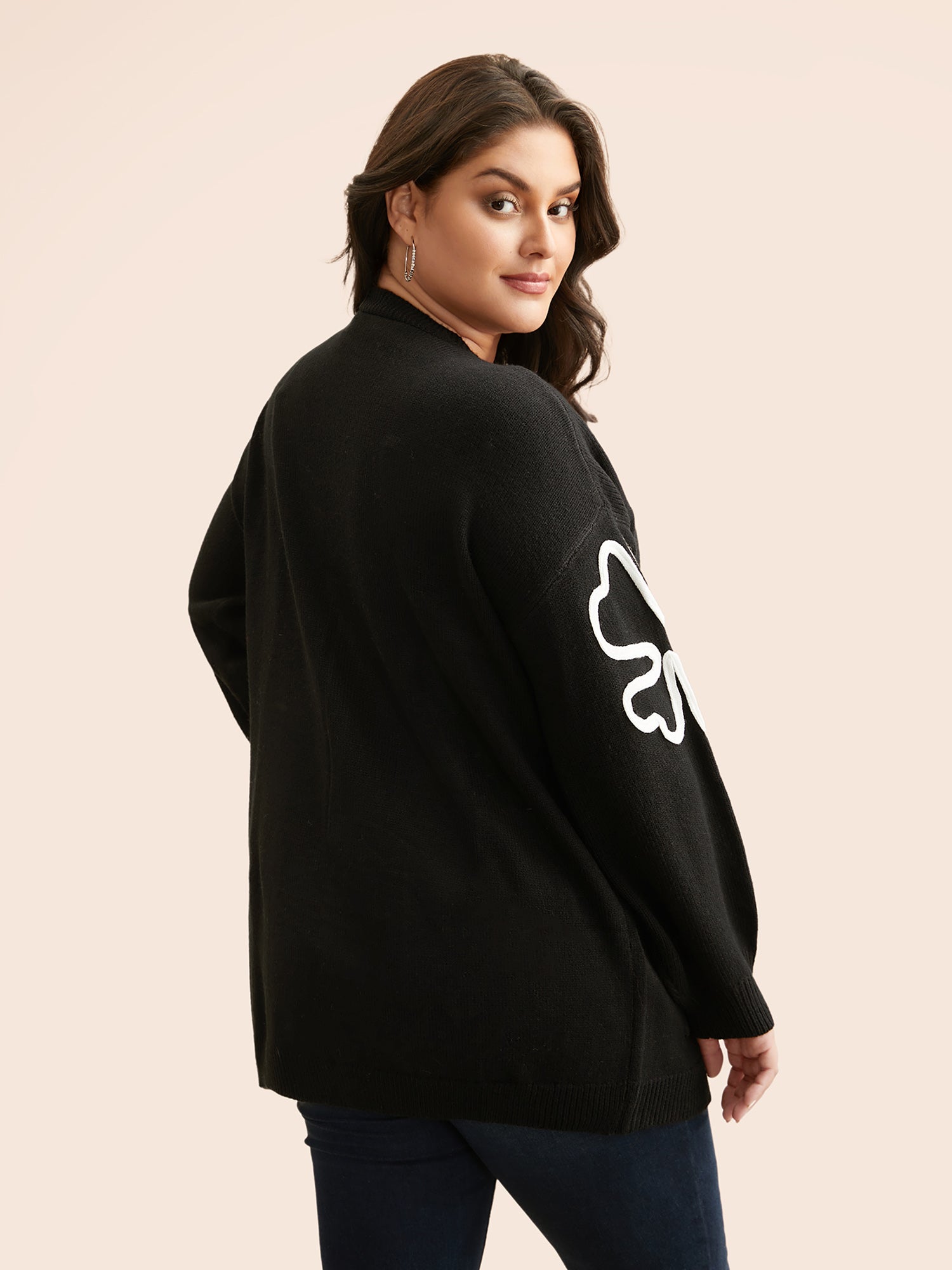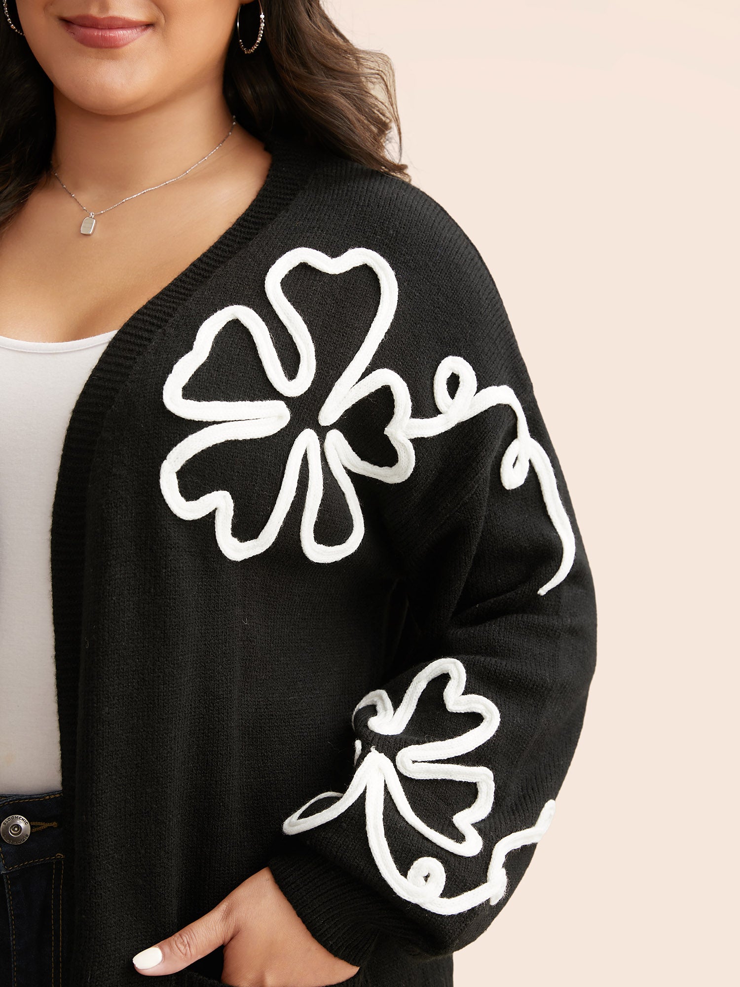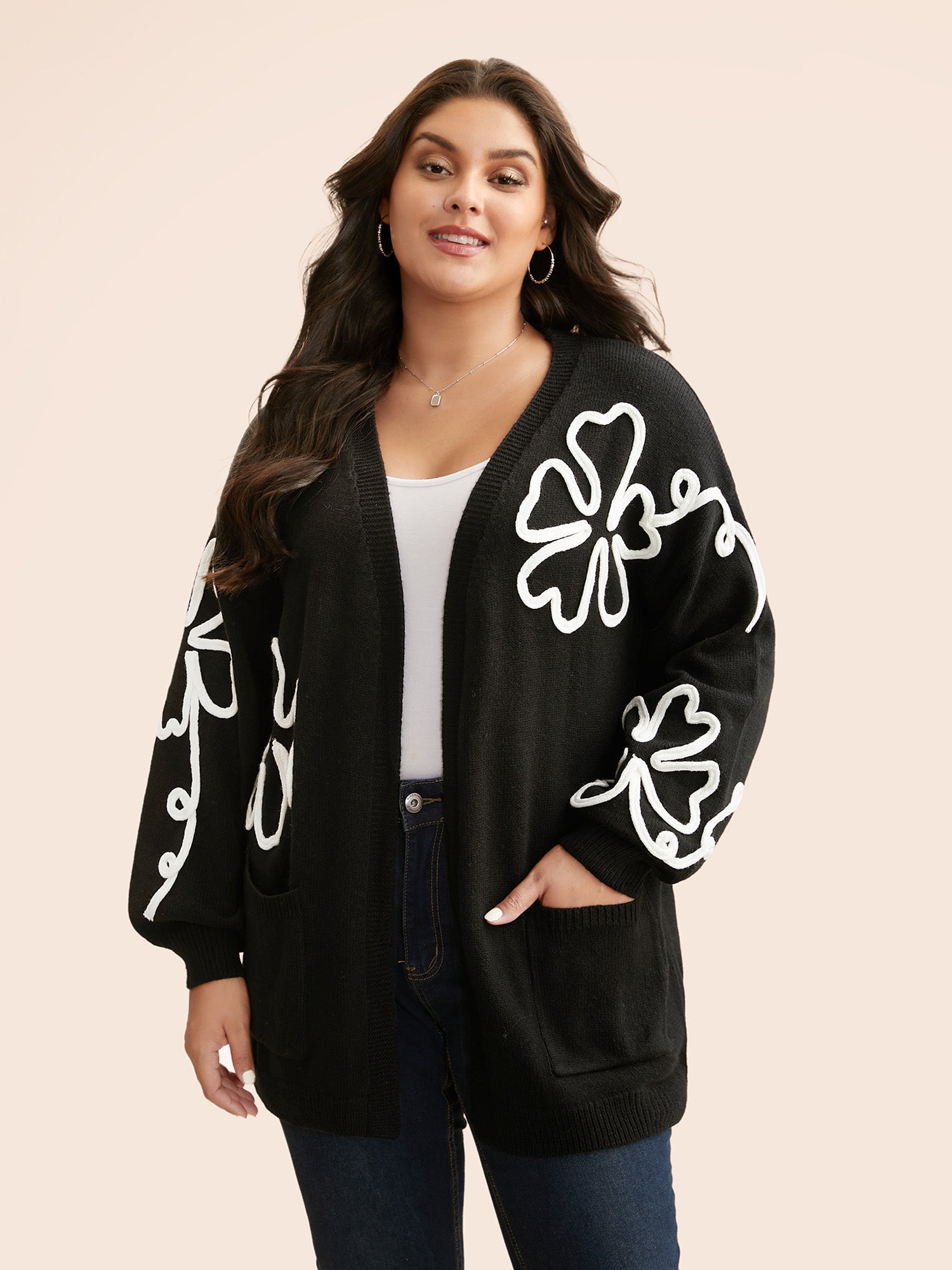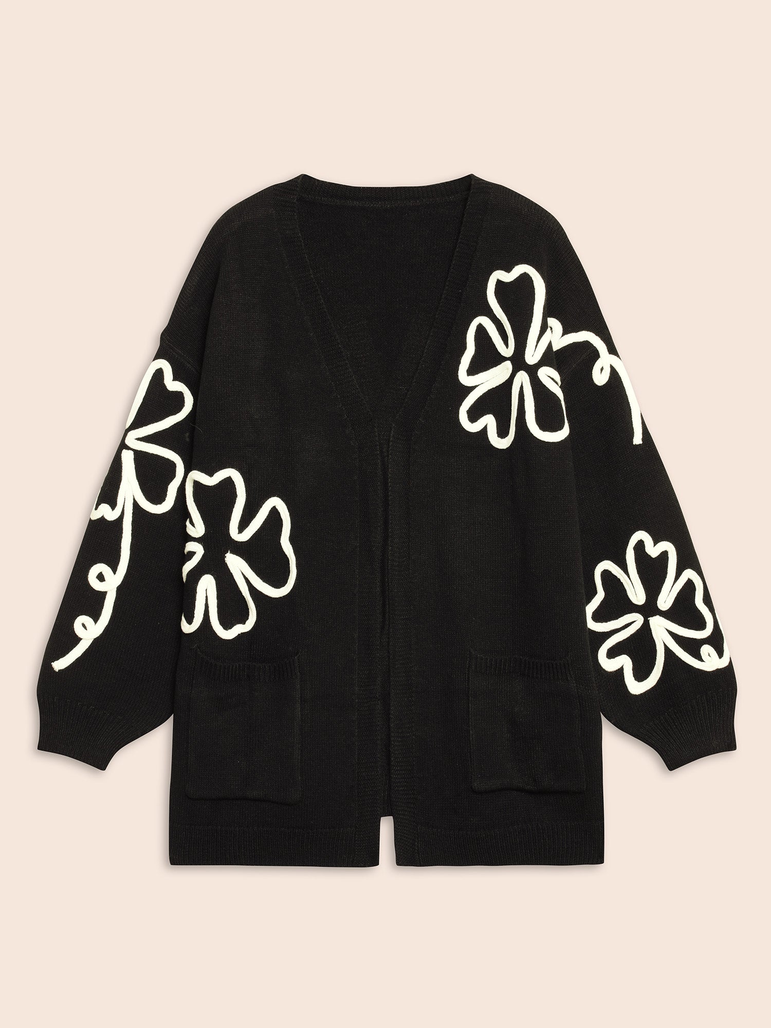 Shop Crochet Floral Kimono Collar Pocket Cardigan now and redefine your style with confidence at Sweetccc. Tailored for mid and plus-size women. This trendy Sweaters Cardigans Women. sizes 10-30. Season:Winter;Color:Black;Style:Casual;Neckline:Kimono collar;Sleeve Type:Drop shoulder sleeve;Pattern Type:Natural Flowers;Prints:Floral;Details:Embroidered;Pocket:Patch pocket;Belt:No-belt;Closure Type:Open front without closure