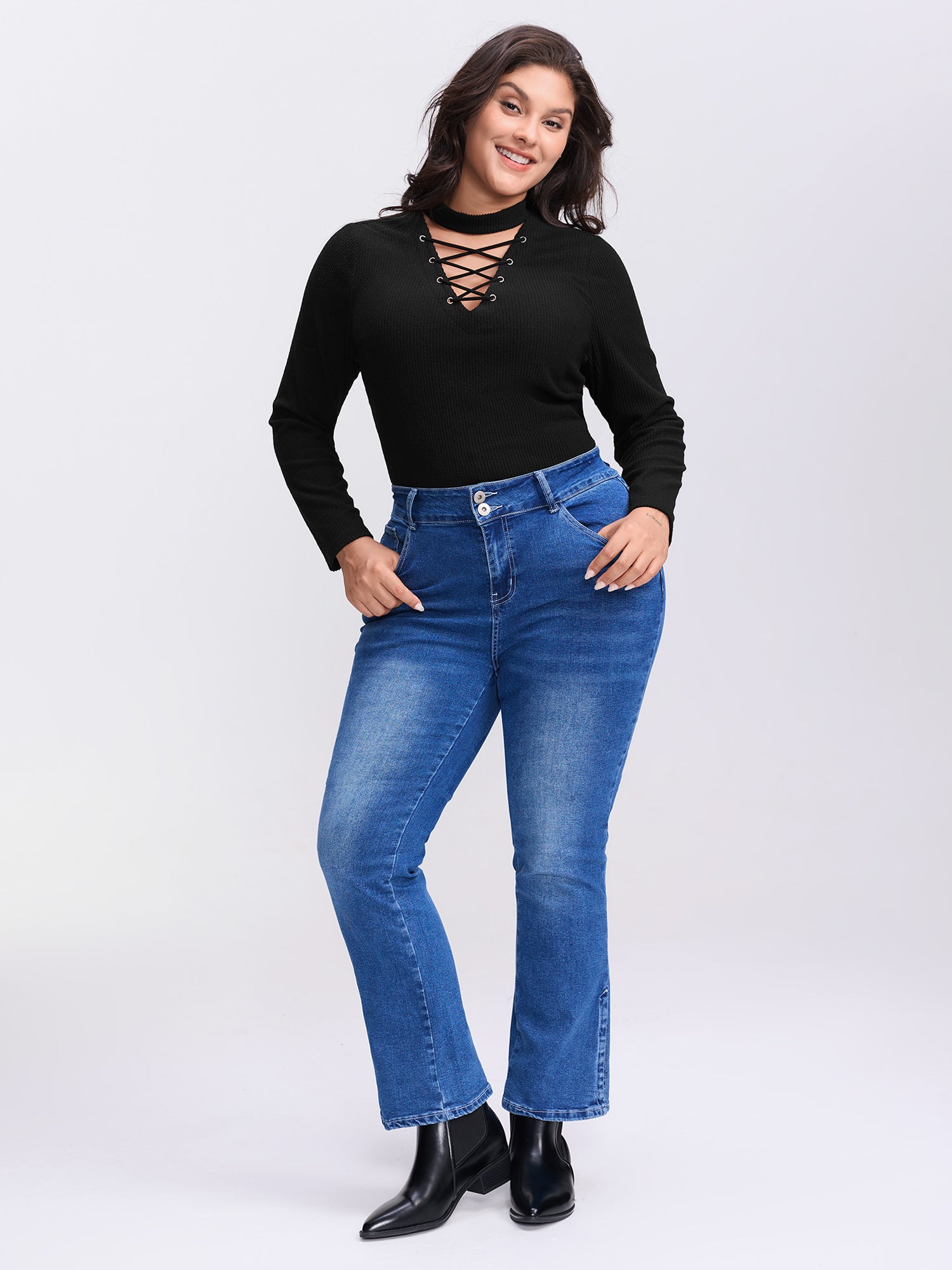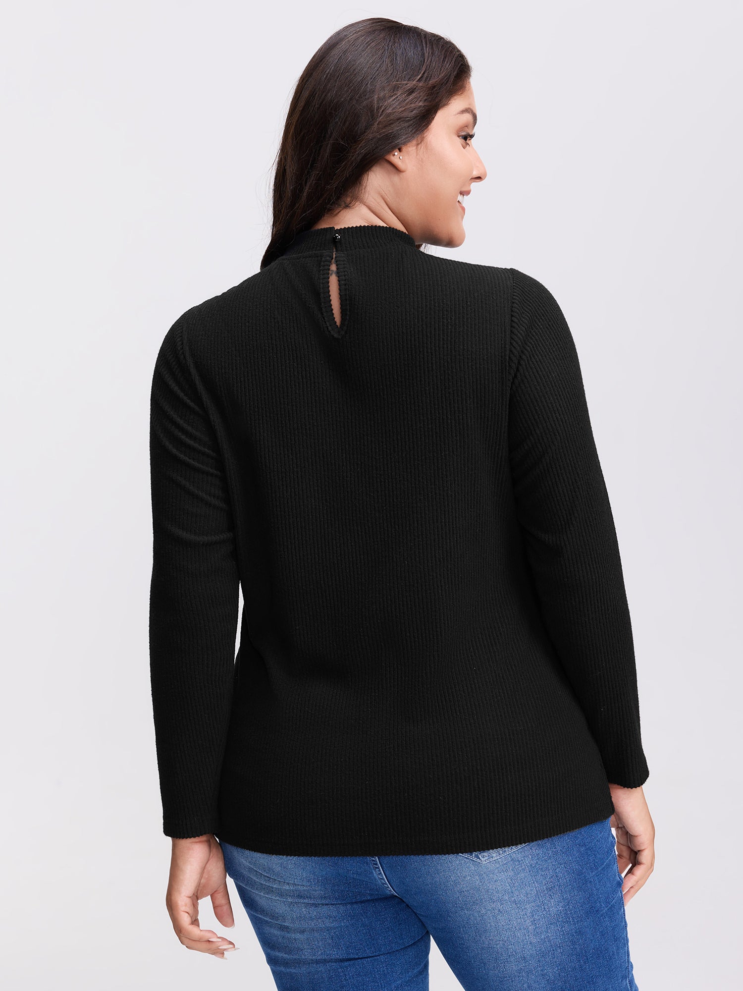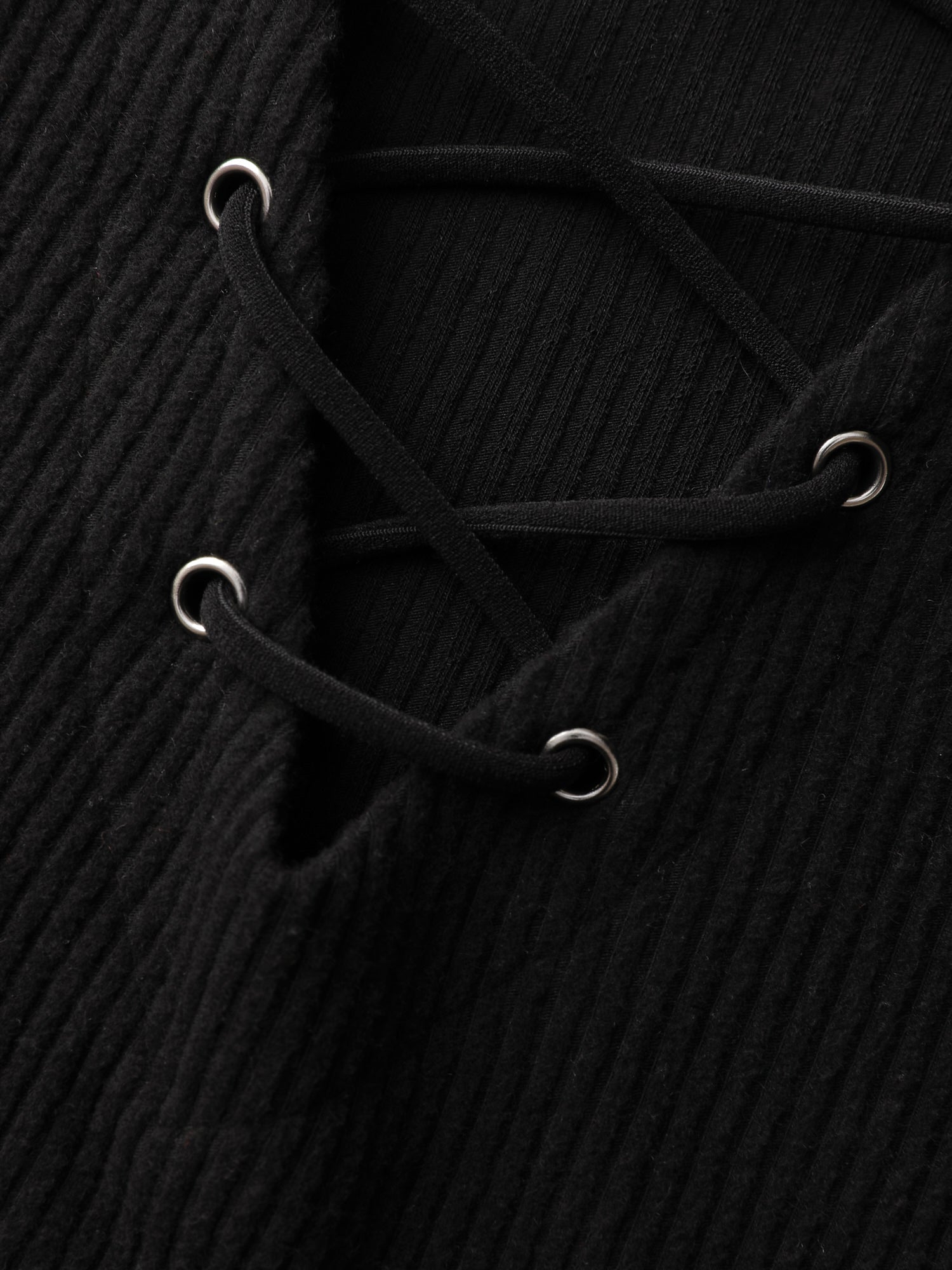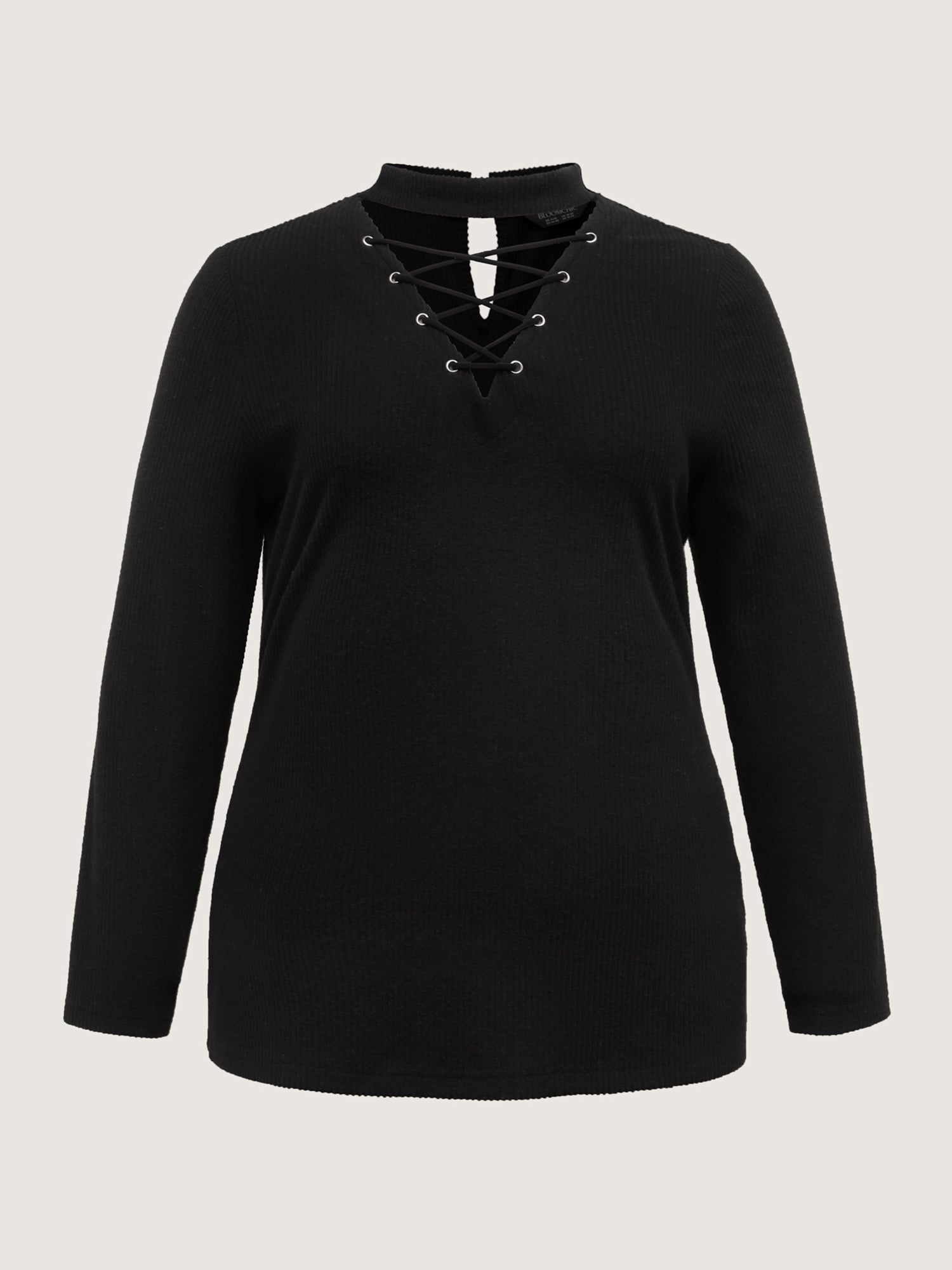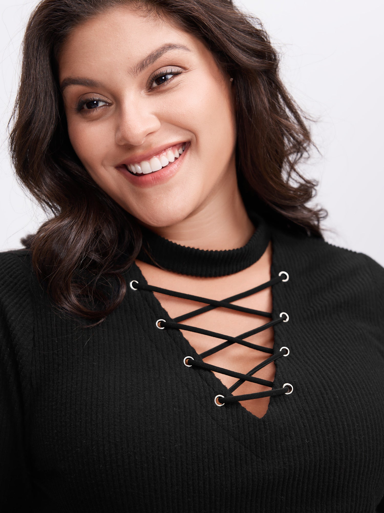 Shop Cross-Lace Sheer Fitted Knit Top now and redefine your style with confidence at Sweetccc. Tailored for mid and plus-size women. This trendy Tops Women. sizes 10-30. Color:Black;Prints:Non;Neckline:Turtleneck;Sleeve Type:Regular Sleeve;Details:Eyelet. Cross straps. Texture;Pocket:No-pocket