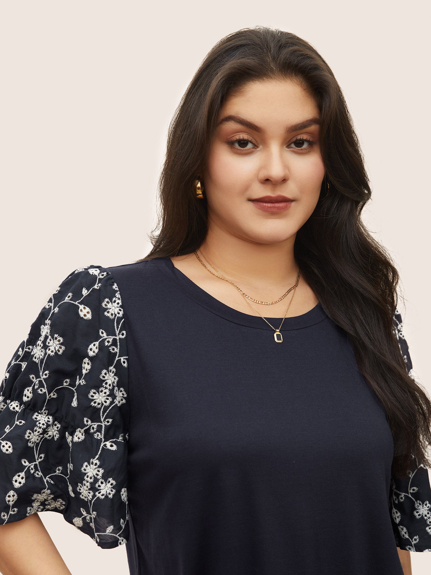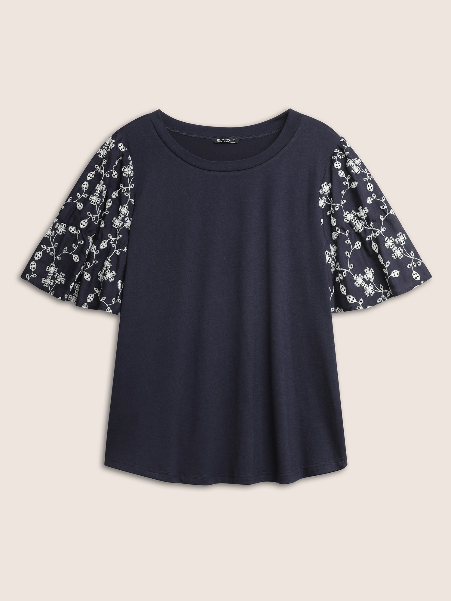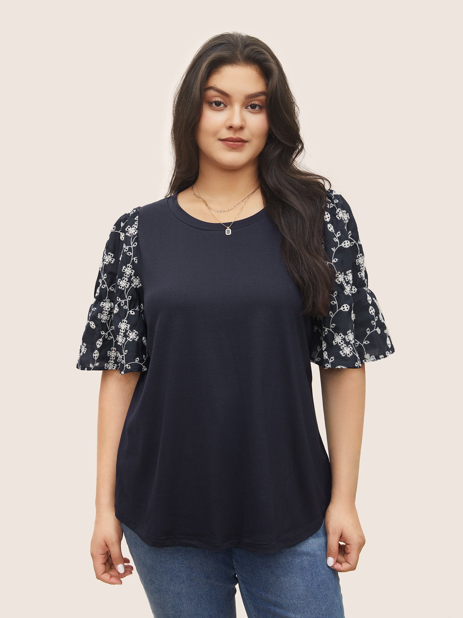 Shop Ditsy Floral Patchwork Broderie Anglaise T-shirt now and redefine your style with confidence at Sweetccc. Tailored for mid and plus-size women. This trendy Tops Women. sizes 10-30. Color:Midnight.Black;Pattern Type:Ditsy Floral;Neckline:Round Neck;Sleeve Type:Regular Sleeve;Details:Patchwork. Embroidered;Pocket:No-pocket