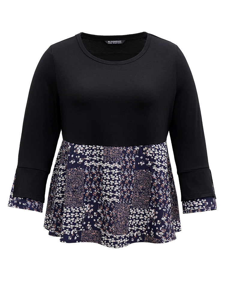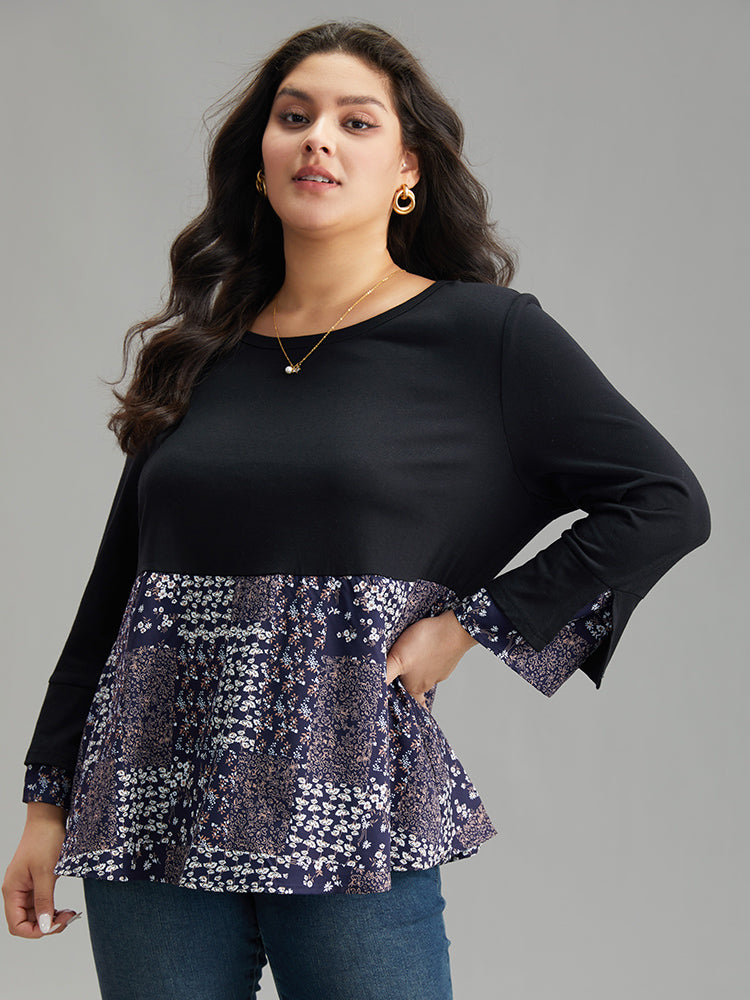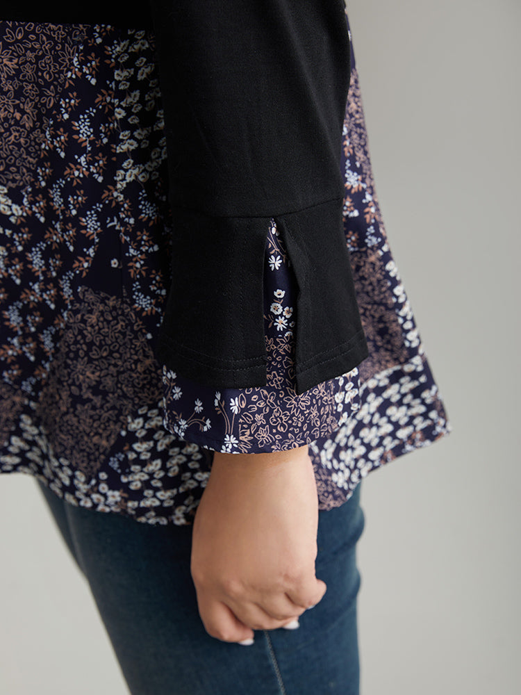 Shop Ditsy Floral Patchwork Flutter Sleeve T-shirt now and redefine your style with confidence at Sweetccc. Tailored for mid and plus-size women. This trendy Tops Women. sizes 10-30. Season:Winter;Color:Black;Pattern Type:Ditsy Floral;Neckline:Round Neck;Sleeve Type:Ruffle Sleeve;Details:Printed. Patchwork. Slit;Pocket:No-pocket