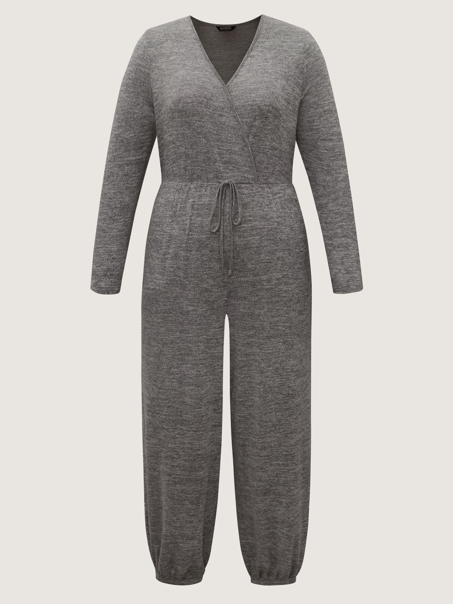 Shop Elastic Waist Overlap Collar Lounge Jumpsuit now and redefine your style with confidence at Sweetccc. Tailored for mid and plus-size women. This trendy Loungewear Women. sizes 10-30. Color:LightGray.Black.Russet.Navy.DarkBrown.Plum.Pureblack.DustyPink.Emerald;Style:Leisure;Neckline:Overlap Collar;Sleeve Type:Regular Sleeve;Prints:Non;Details:Tie knot;Pocket:Side seam pocket;Belt:No-belt;Closure Type:Non