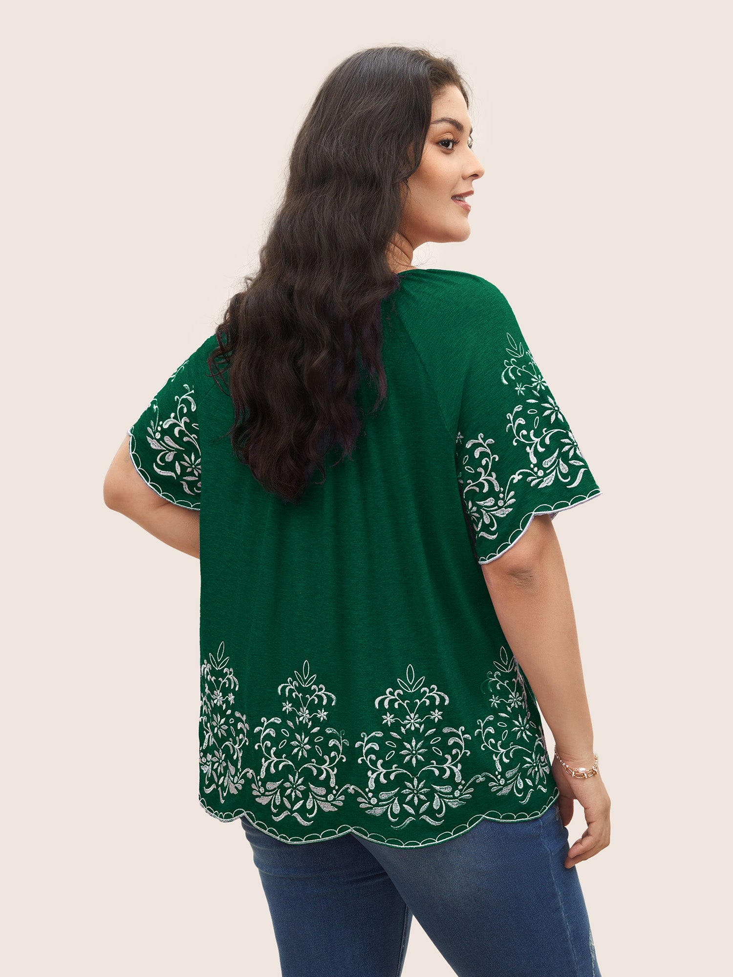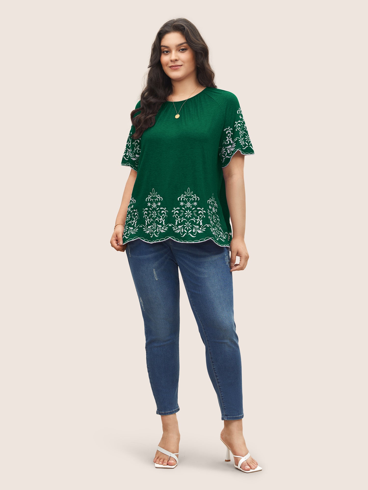 Shop Embroidered Scalloped Trim Gathered T-shirt now and redefine your style with confidence at Sweetccc. Tailored for mid and plus-size women. This trendy Tops Women. sizes 10-30. Color:Midnight.DarkGreen;Neckline:Round Neck;Sleeve Type:Regular Sleeve;Details:Embroidered;Pocket:No-pocket