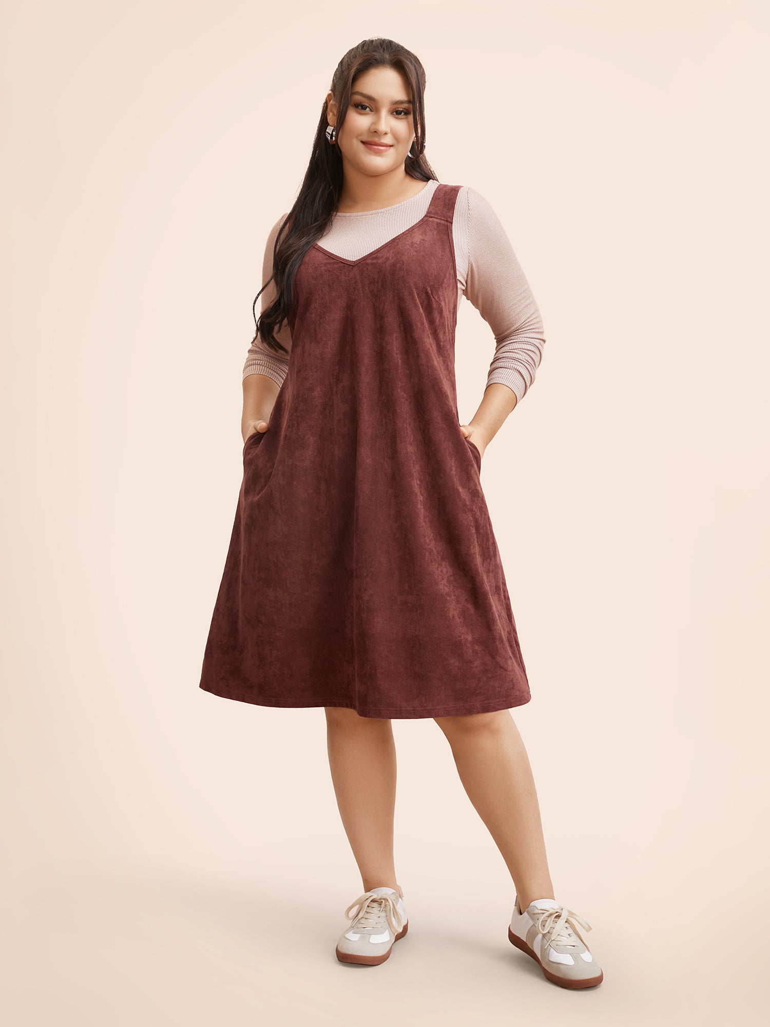 Shop Faux Suede Pocket Overall Dress now and redefine your style with confidence at Sweetccc. Tailored for mid and plus-size women. This trendy Dress. sizes 10-30. You can never go wrong with Sweetccc Dresses. Season:Winter;Color:Burgundy;Style:Casual;Neckline:V-neck;Sleeve Type:Sleeveless;Prints:Non;Details:Eyelet. Texture;Pocket:Side seam pocket;Belt:No-belt;Closure Type:Non