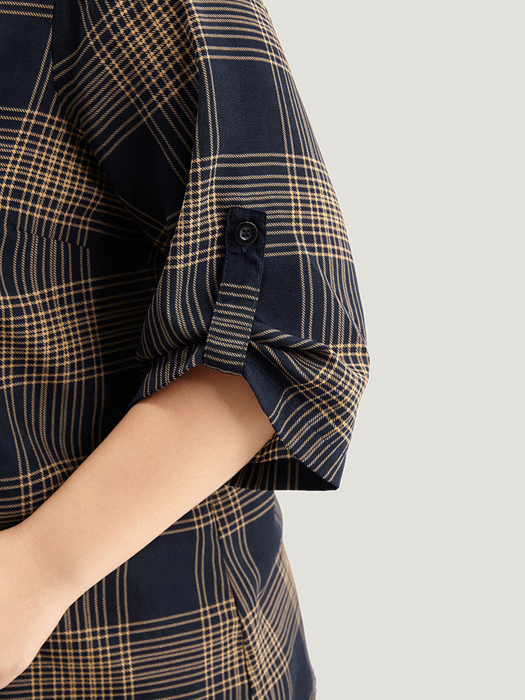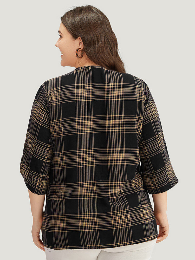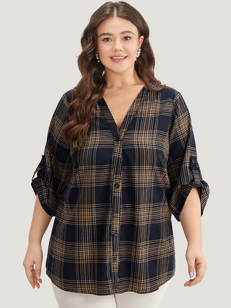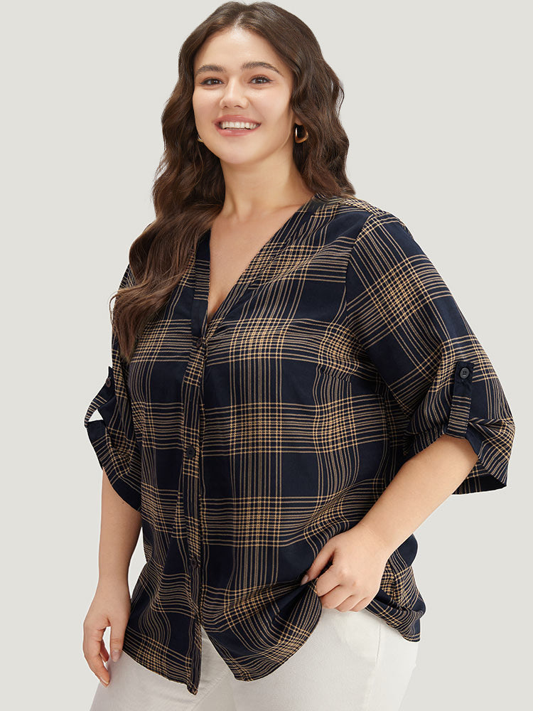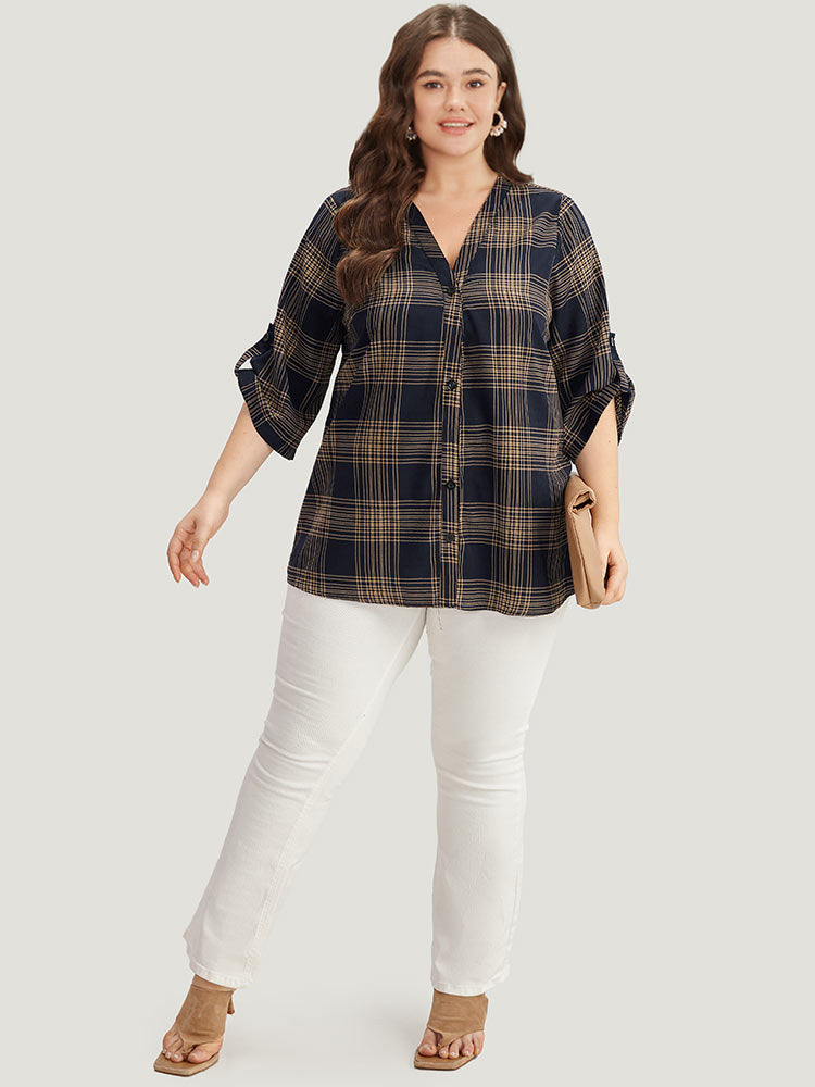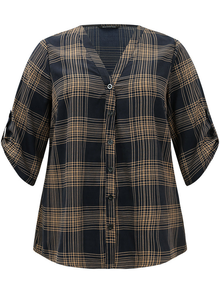 Shop Plaid Button Through Roll Tab Sleeve Blouse now and redefine your style with confidence at Sweetccc. Tailored for mid and plus-size women. This trendy Tops Women. sizes 10-30. Color:Indigo.Black;Style:Office;Pattern Type:Plaid;Neckline:V-neck;Sleeve Type:Regular Sleeve;Details:Button;Pocket:No-pocket