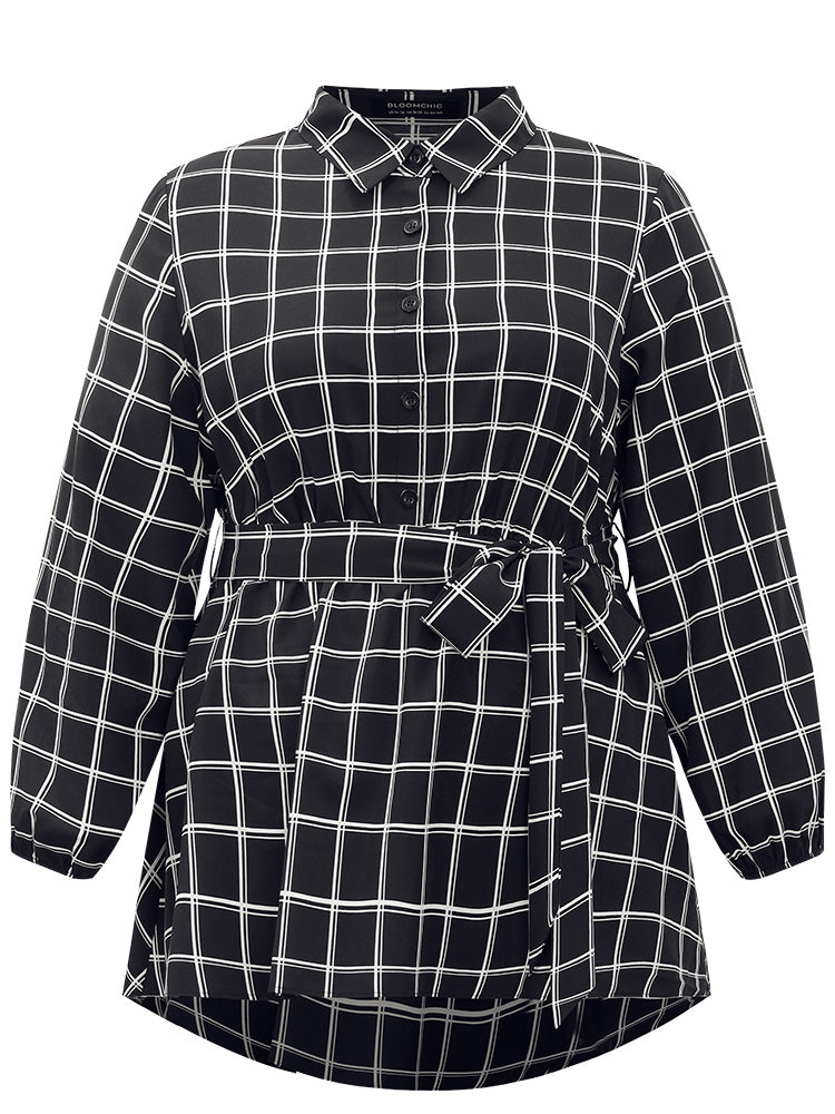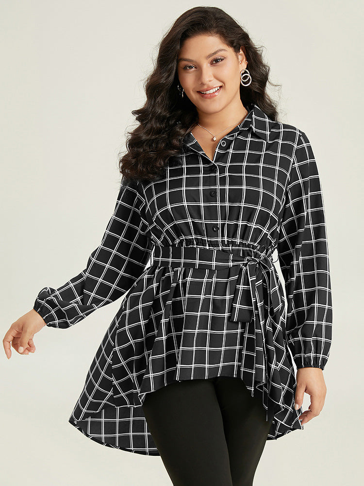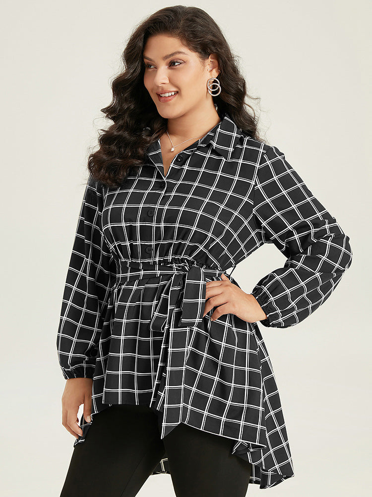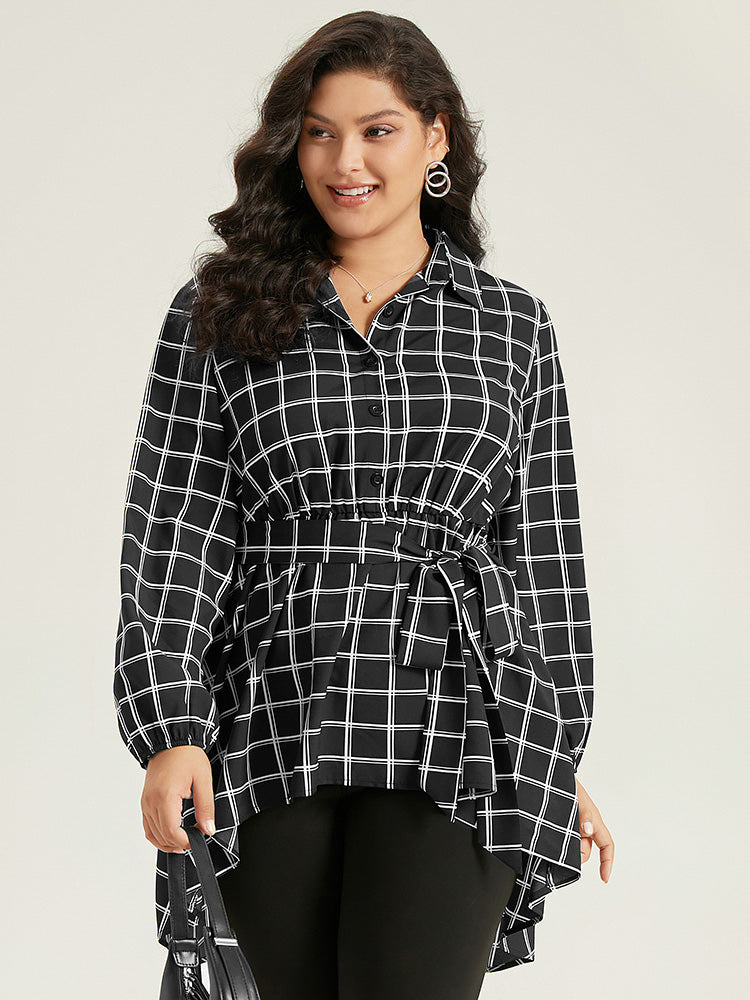 Shop Plaid Button Up Belted High Low Hem Blouse now and redefine your style with confidence at Sweetccc. Tailored for mid and plus-size women. This trendy Tops Women. sizes 10-30. Color:Black;Style:Office;Neckline:Shirt collar;Sleeve Type:Lantern Sleeve;Pattern Type:Plaid;Details:Belted. Button. Elastic Waist. Asymmetrical. Elastic cuffs;Pocket:No-pocket