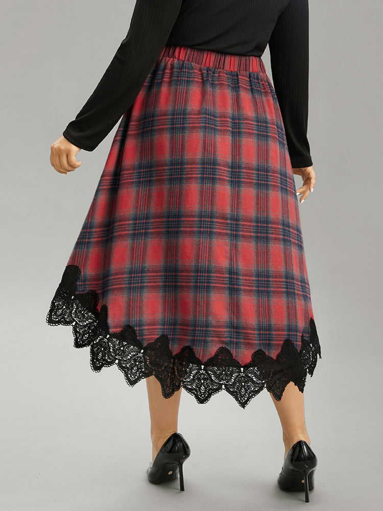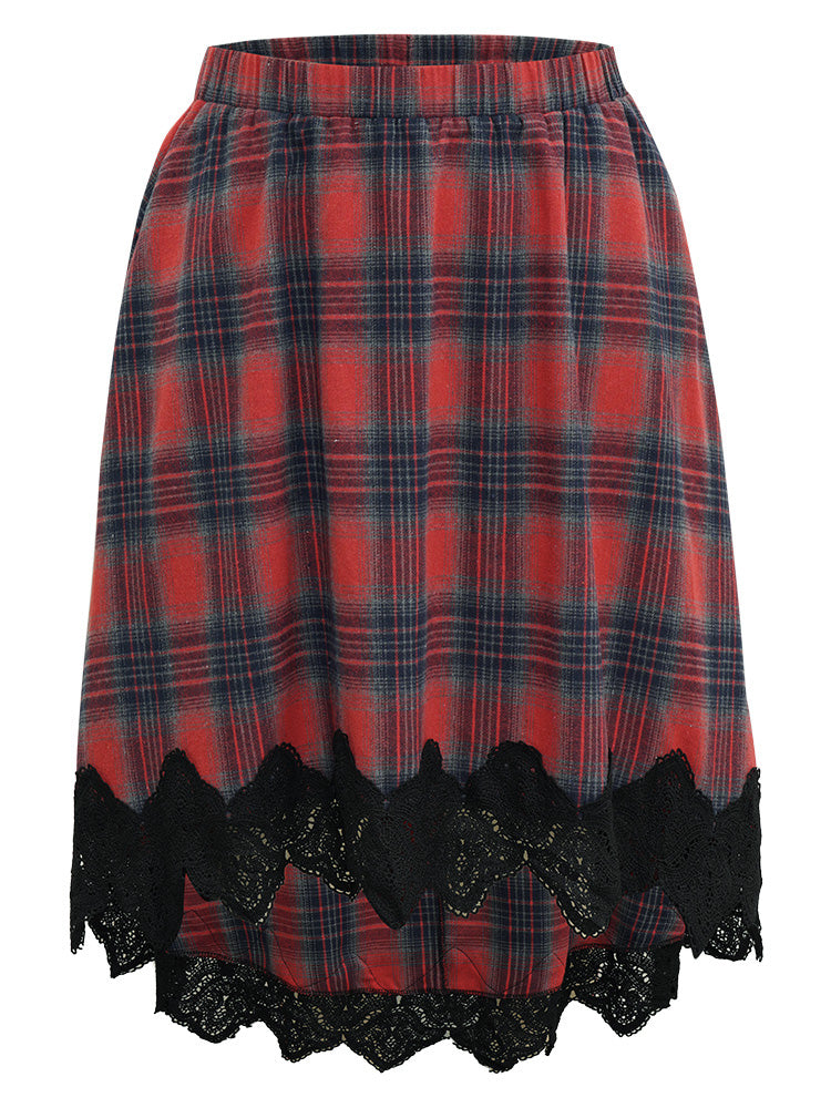 Shop Plaid Lace Panel Pocket High Low Hem Skirt now and redefine your style with confidence at Sweetccc. Tailored for mid and plus-size women. This trendy Bottoms Women. sizes 10-30. Season:Winter;Color:Scarlet;Style:Elegant;Pattern Type:Plaid;Details:Pocket. Elastic Waist. Asymmetrical. Lace. Patchwork;Pocket:It is perfectly sized to carry a phone.;Belt:No-belt;Closure Type:Elastic Waist