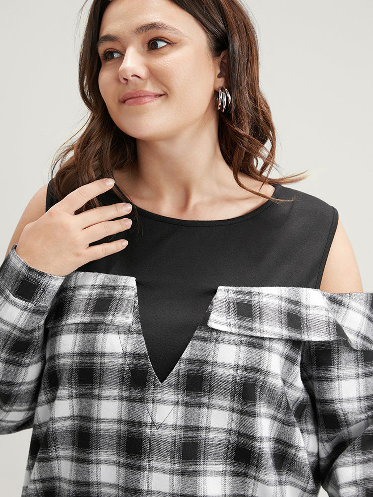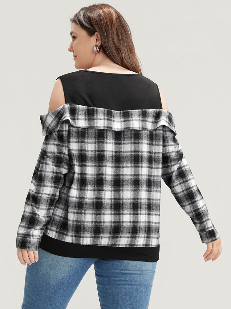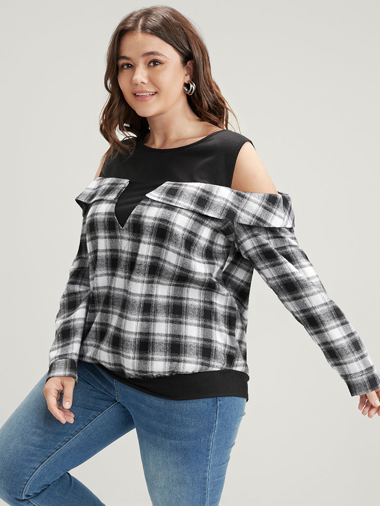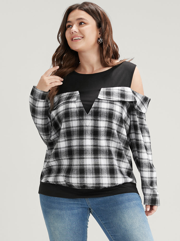 Shop Plaid Patchwork Cold Shoulder Sweatshirt now and redefine your style with confidence at Sweetccc. Tailored for mid and plus-size women. This trendy Tops Women. sizes 10-30. Season:Winter;Color:Black;Neckline:Cold Shoulder;Sleeve Type:Regular Sleeve;Details:Patchwork;Pocket:No-pocket;Belt:No-belt