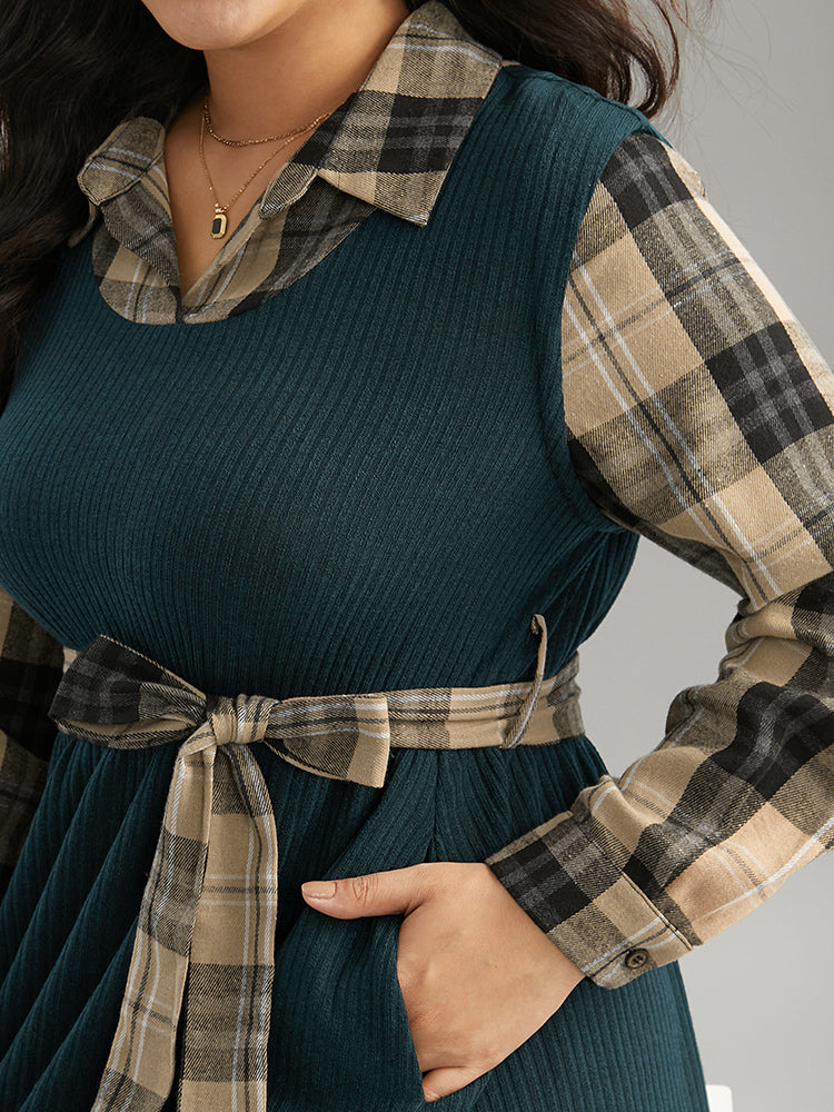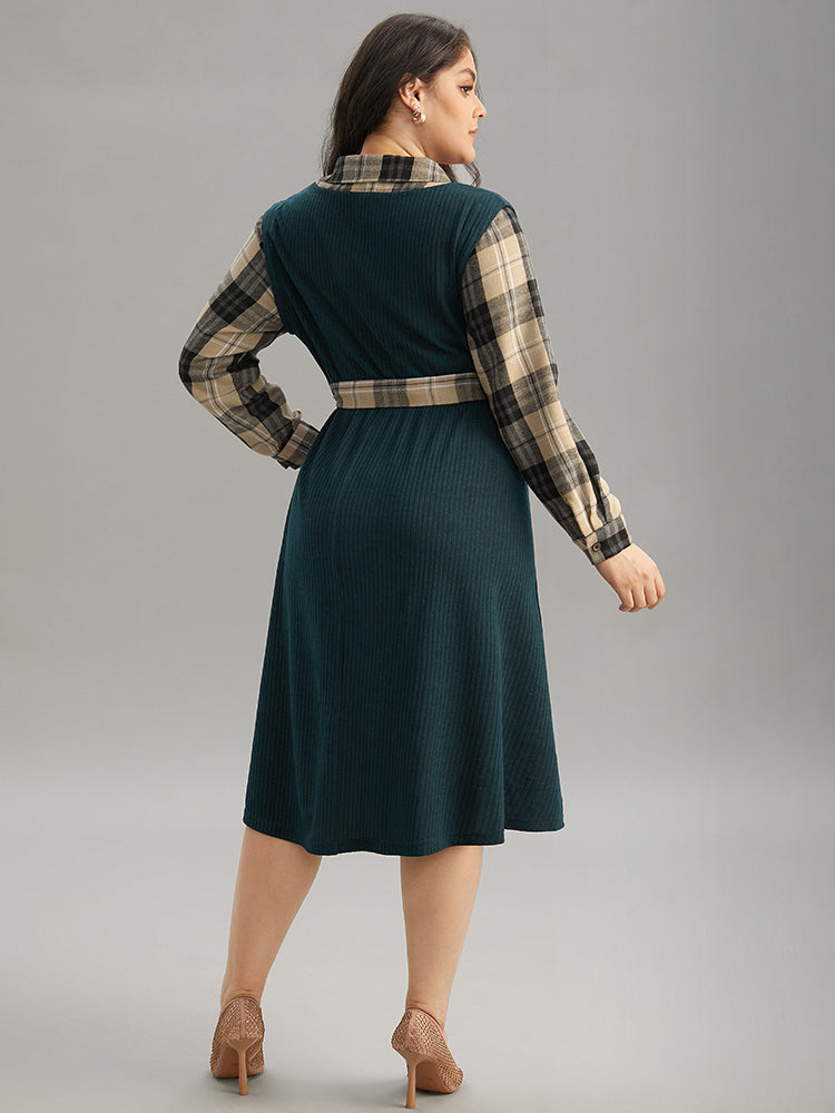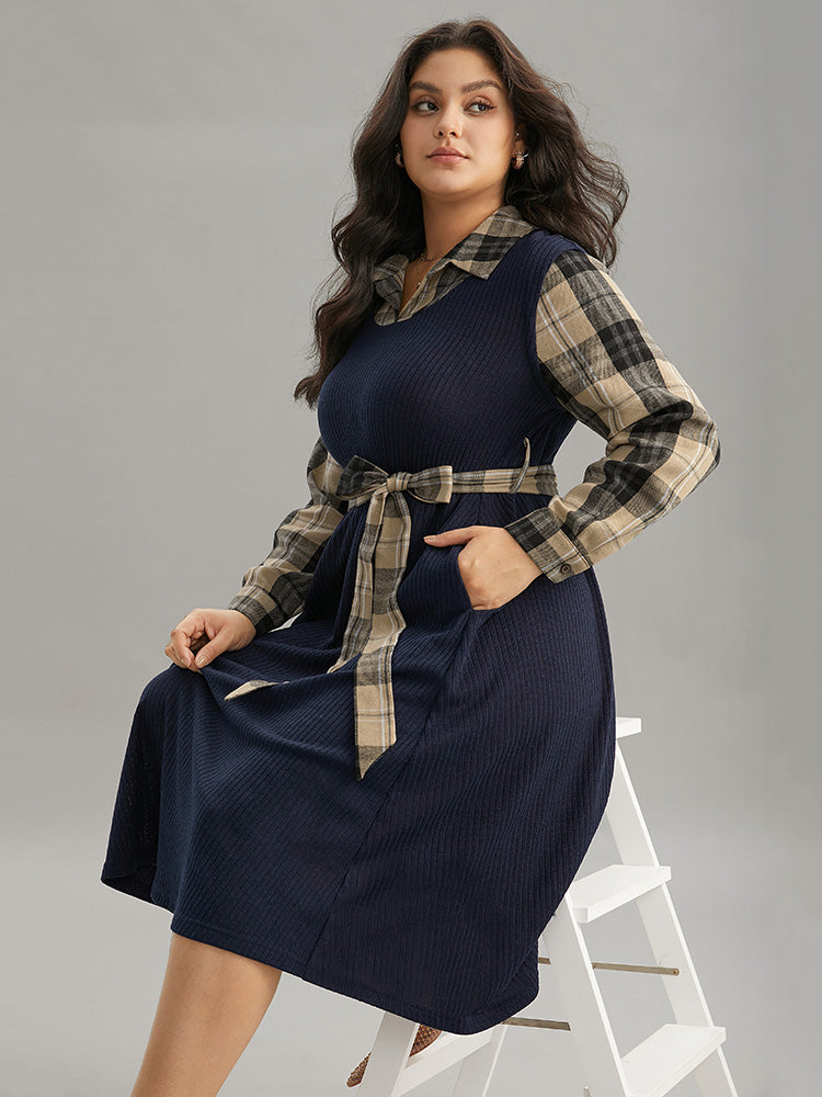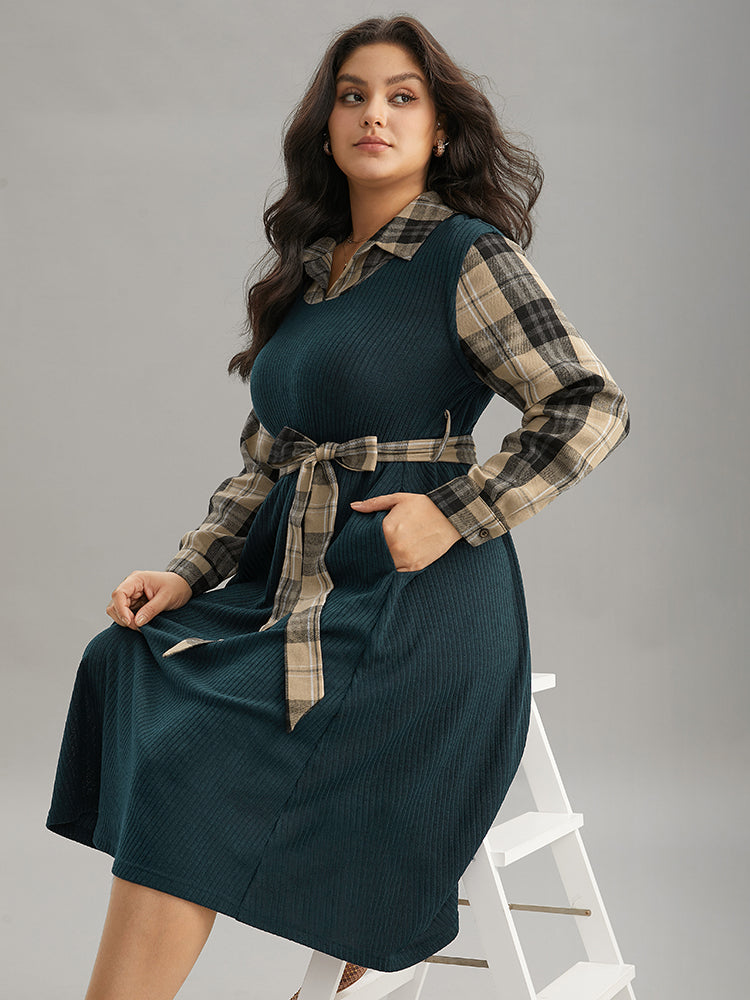 Shop Plaid Patchwork Rib Knit Shirt Collar Belted Dress now and redefine your style with confidence at Sweetccc. Tailored for mid and plus-size women. This trendy Dress. sizes 10-30. You can never go wrong with Sweetccc Dresses. Season:Winter;Color:Indigo.DarkGreen;Style:Office;Neckline:Shirt collar;Sleeve Type:Regular Sleeve;Pattern Type:Plaid;Details:Pocket. Button. Elastic Waist. Patchwork. Printed;Pocket:It is perfectly sized to carry a phone.;Belt:Belt