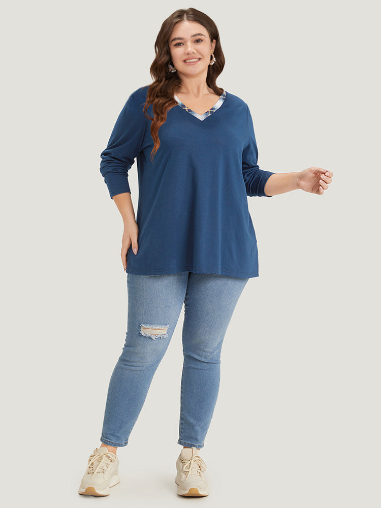 Shop Plaid Patchwork V Neck Split Side T-shirt now and redefine your style with confidence at Sweetccc. Tailored for mid and plus-size women. This trendy Tops Women. sizes 10-30. Season:Summer;Color:Indigo;Style:Casual;Pattern Type:Gingham;Neckline:V-neck;Sleeve Type:Regular Sleeve;Details:Patchwork. Slit;Pocket:No-pocket