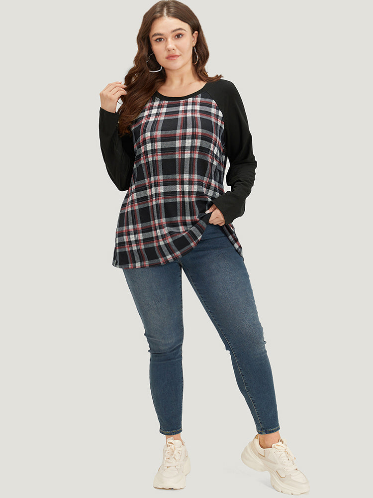 Shop Plaid Raglan Sleeve Crew Neck T-shirt now and redefine your style with confidence at Sweetccc. Tailored for mid and plus-size women. This trendy Tops Women. sizes 10-30. Color:Red;Style:Casual;Pattern Type:Plaid;Neckline:Round Neck;Sleeve Type:Raglan sleeve;Details:Patchwork;Pocket:No-pocket
