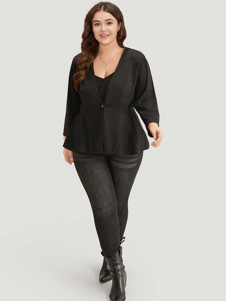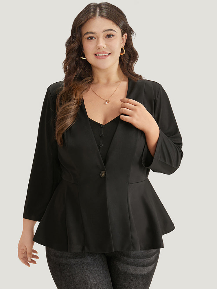 Shop Plain Button Up Ruffle Hem Blazer now and redefine your style with confidence at Sweetccc. Tailored for mid and plus-size women. This trendy Outerwear Women. sizes 10-30. Color:Black;Style:Casual;Neckline:V-neck;Sleeve Type:Regular Sleeve;Pattern Type:Plain;Details:Button. Ruffles. Plain;Pocket:No-pocket;Belt:No-belt;Closure Type:Button;Lining:No-lining