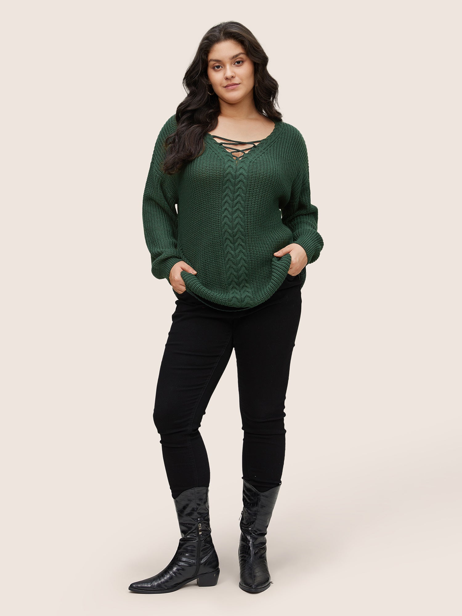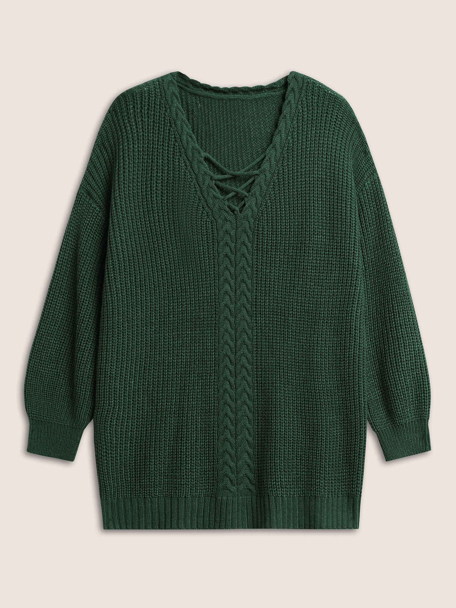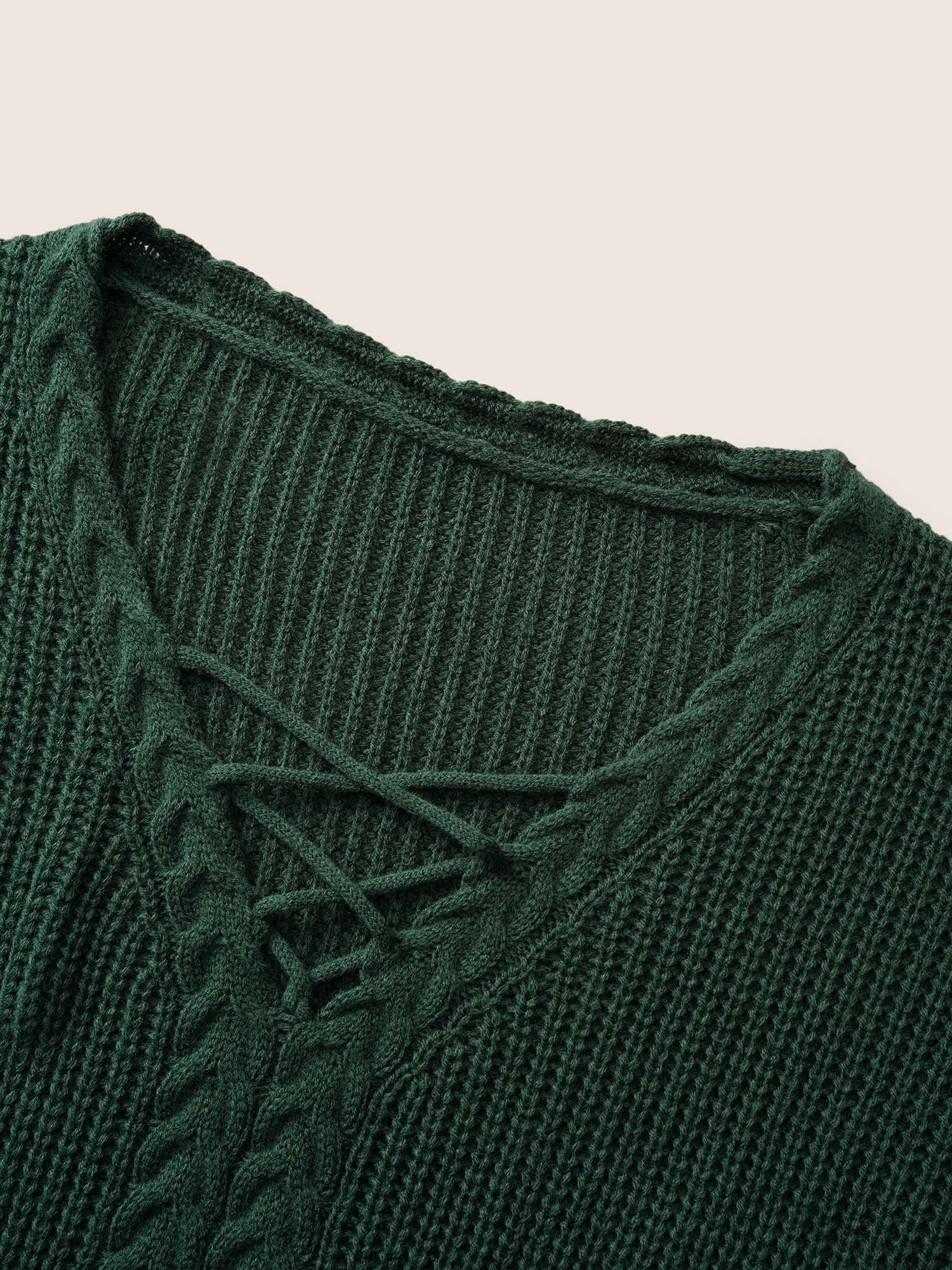 Shop Plain Cable Knit Crisscross Pullover now and redefine your style with confidence at Sweetccc. Tailored for mid and plus-size women. This trendy Sweaters Cardigans Women. sizes 10-30. Color:DarkGreen;Style:Casual;Neckline:V-neck;Sleeve Type:Regular Sleeve;Pattern Type:Plain;Details:Plain. Texture. Elastic cuffs. Cable Knit. Cross straps;Pocket:No-pocket;Snap Fastener:No-snap fastener;Belt:No-belt