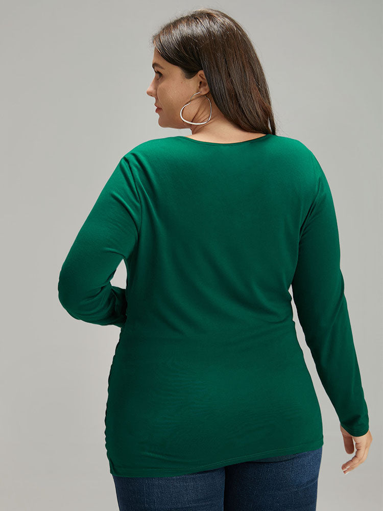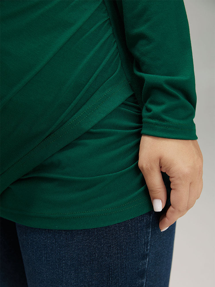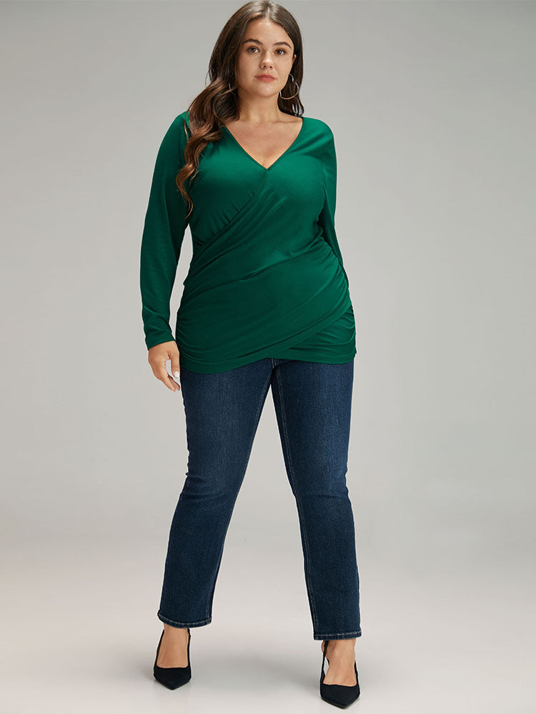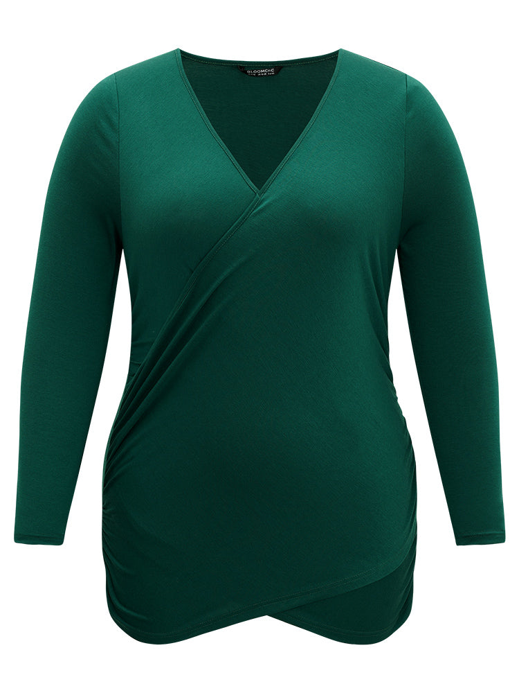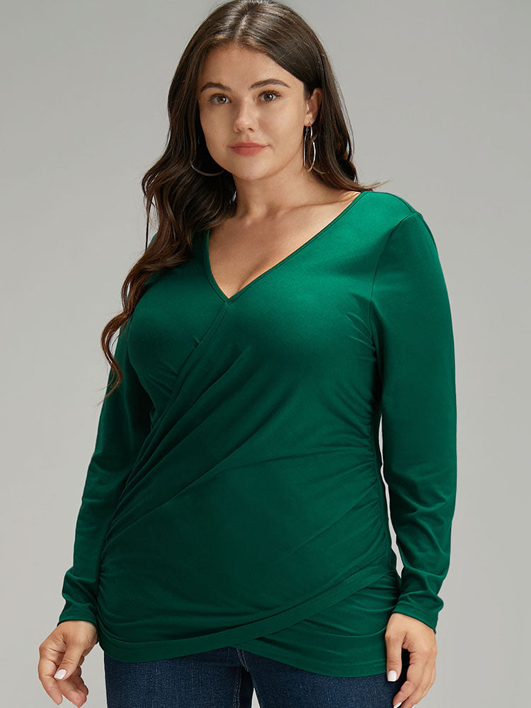 Shop Plain Crossover V Neck Gathered T-shirt now and redefine your style with confidence at Sweetccc. Tailored for mid and plus-size women. This trendy Tops Women. sizes 10-30. Season:Fall;Color:DarkGreen;Pattern Type:Plain;Neckline:V-neck;Sleeve Type:Regular Sleeve;Details:Plain. Wrap;Pocket:No-pocket