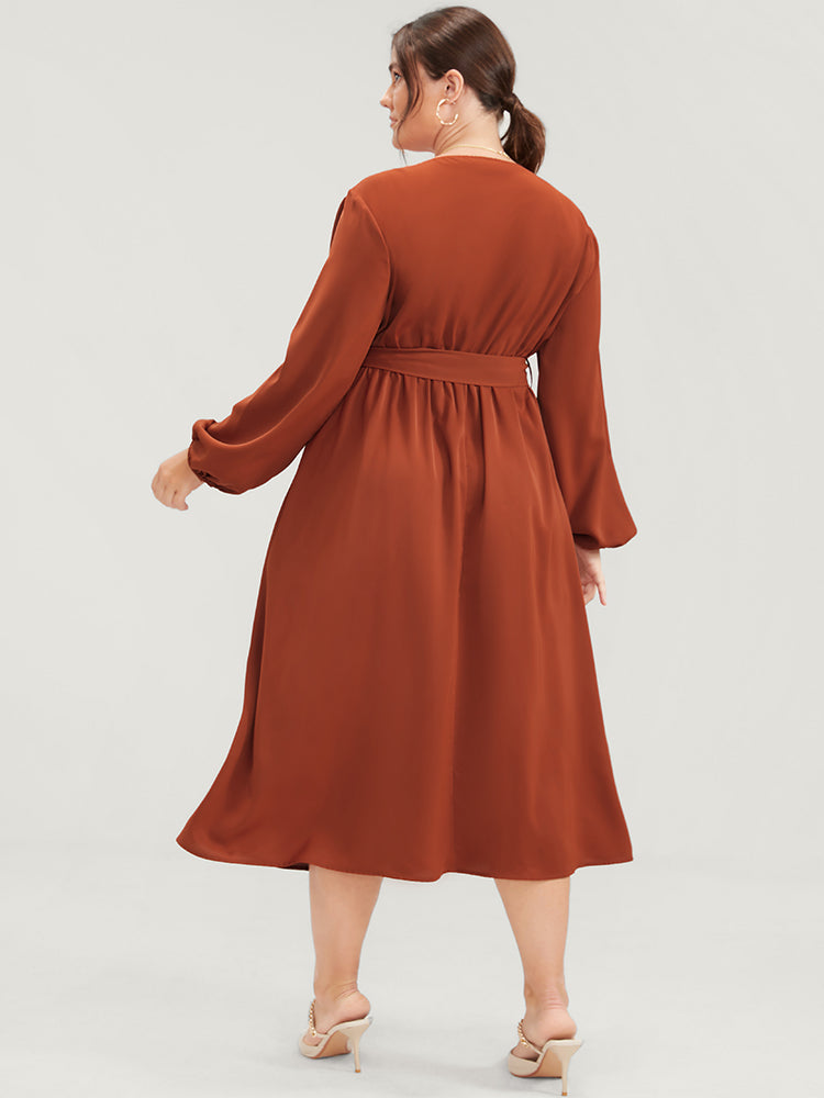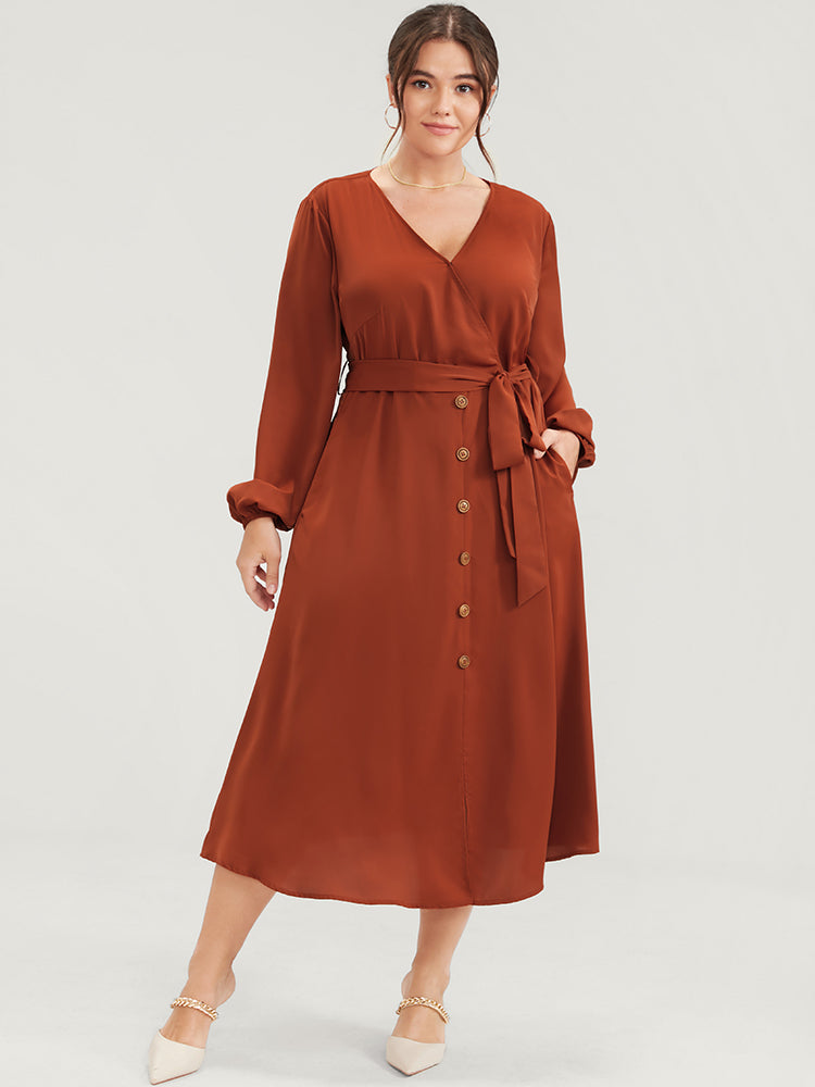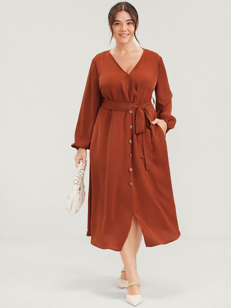 Shop Plain Lantern Sleeve Pocket Button Belted Split Front Wrap Dress now and redefine your style with confidence at Sweetccc. Tailored for mid and plus-size women. This trendy Dress. sizes 10-30. You can never go wrong with Sweetccc Dresses. Season:Winter;Color:Chocolate;Neckline:V-neck;Sleeve Type:Lantern Sleeve;Details:Slit. Pocket. Button;Pocket:It is perfectly sized to carry a phone.;Snap Fastener:Snap fastener;Belt:Belt;Closure Type:Elastic Waist