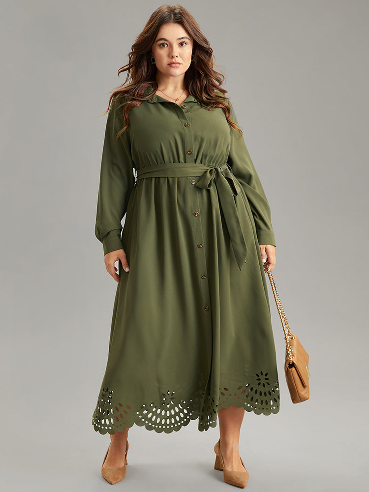 Shop Plain Laser Cut Button Through Belted Dress now and redefine your style with confidence at Sweetccc. Tailored for mid and plus-size women. This trendy Dress. sizes 10-30. You can never go wrong with Sweetccc Dresses. Season:Winter;Color:ArmyGreen;Style:Office;Neckline:Shirt collar;Sleeve Type:Regular Sleeve;Pattern Type:Plain;Details:Button. Elastic Waist. Cut-Out. Belted. Plain;Pocket:It is perfectly sized to carry a phone.;Belt:Belt;Closure Type:Button