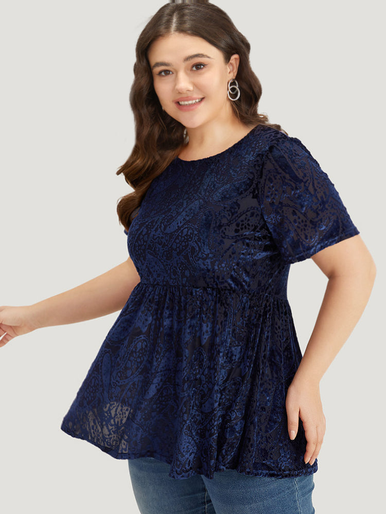 Shop Plain Paisley Elastic Waist Ruffled Hem T-shirt now and redefine your style with confidence at Sweetccc. Tailored for mid and plus-size women. This trendy Tops Women. sizes 10-30. Color:Indigo;Style:Elegant;Pattern Type:Paisley;Neckline:Round Neck;Sleeve Type:Regular Sleeve;Details:Texture. Plain;Pocket:No-pocket