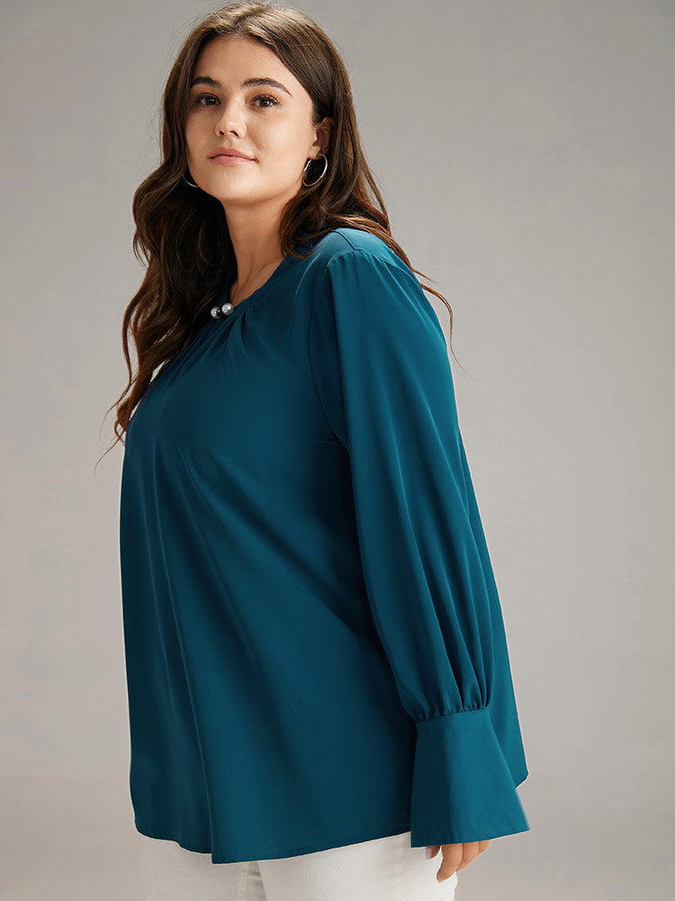Shop Plain Pearl Beaded Plicated Detail Blouse now and redefine your style with confidence at Sweetccc. Tailored for mid and plus-size women. This trendy Tops Women. sizes 10-30. Season:Winter;Color:Aegean;Style:Office;Pattern Type:Plain;Neckline:Round Neck;Sleeve Type:Bell Sleeve;Details:Button. Plain. Gathered;Pocket:No-pocket;Snap Fastener:No-snap fastener