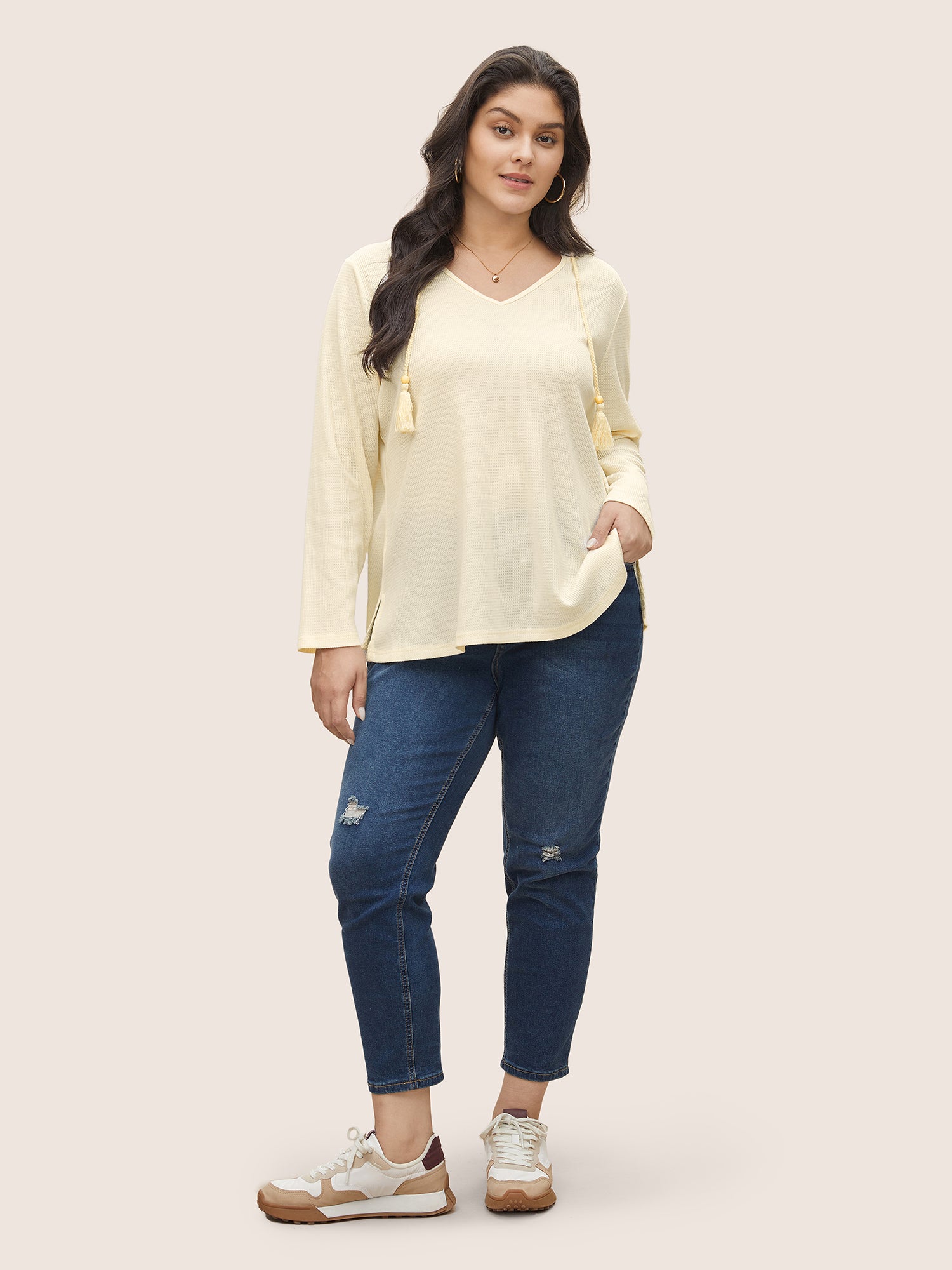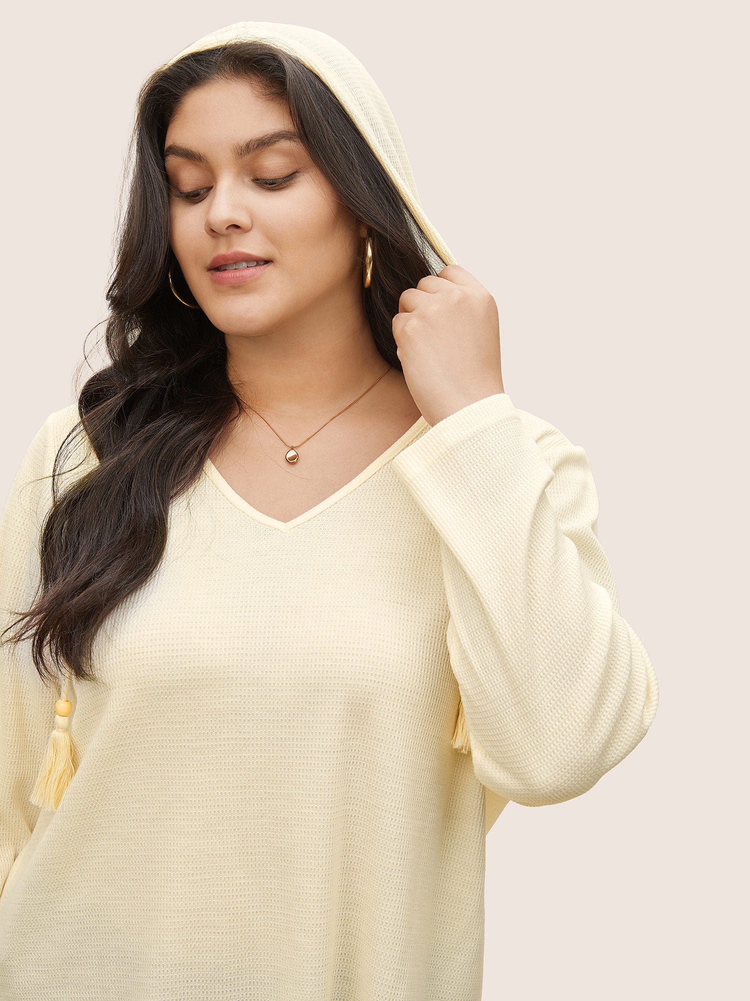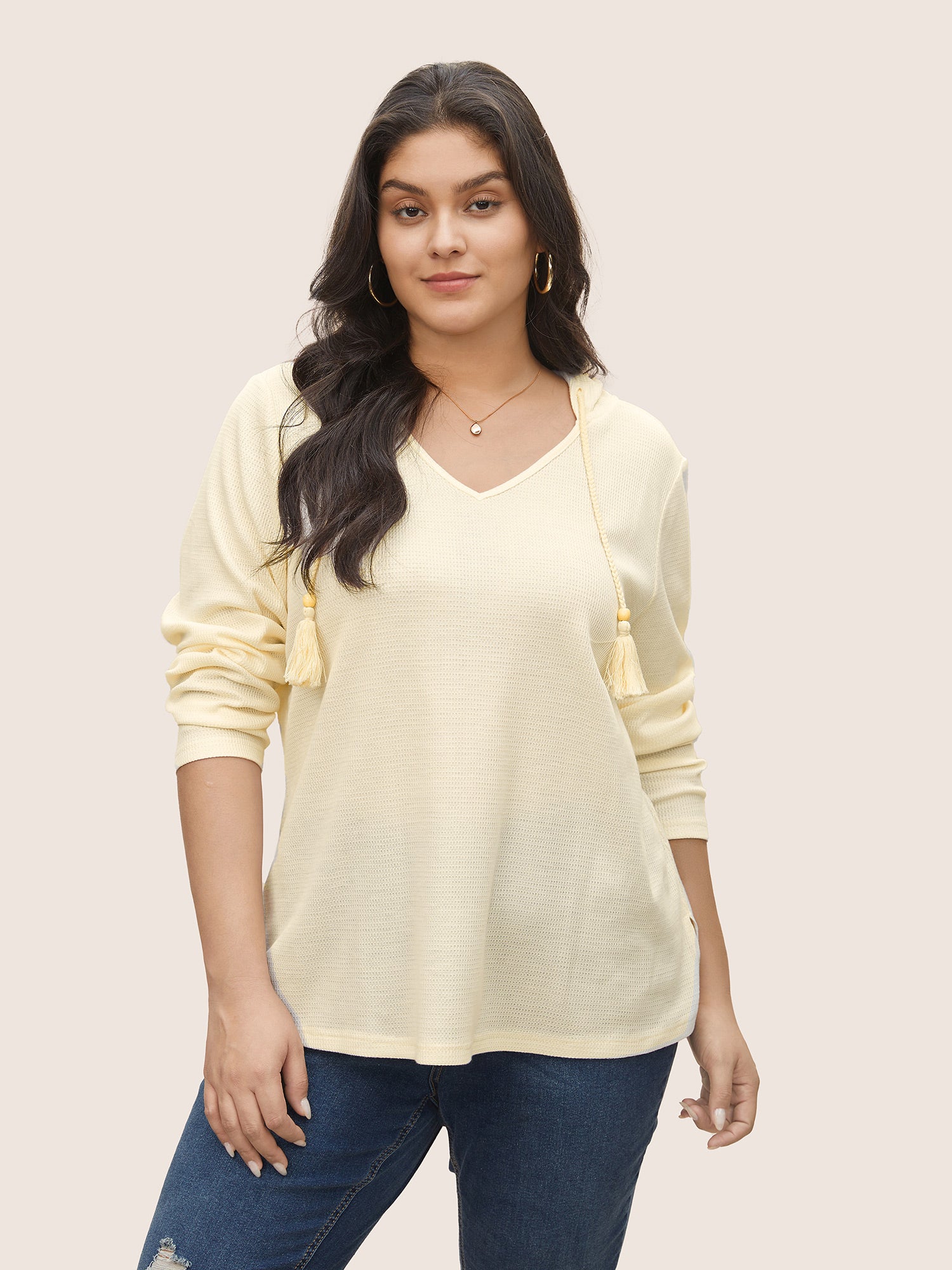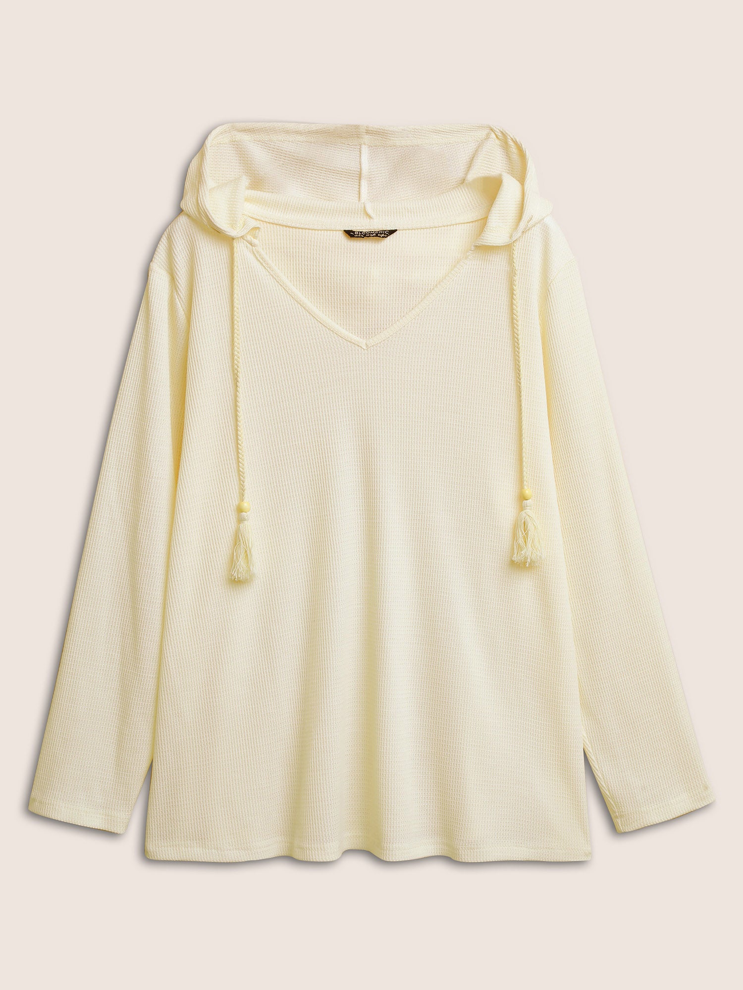 Shop Plain Waffle Knit Tassel Trim Hooded Sweatshirt now and redefine your style with confidence at Sweetccc. Tailored for mid and plus-size women. This trendy Tops Women. sizes 10-30. Season:Spring;Color:Beige;Neckline:V-neck;Sleeve Type:Regular Sleeve;Pattern Type:Plain;Pocket:No-pocket;Belt:No-belt